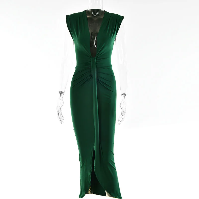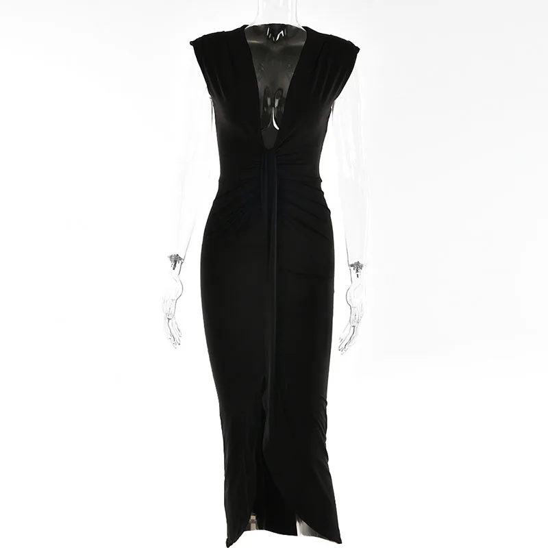 RNSHANGER Deep V Neck Ruched Maxi Dress Women Summer Sexy Sleeveless Bodycon Irregular Bandage Side Split Tunic Dress