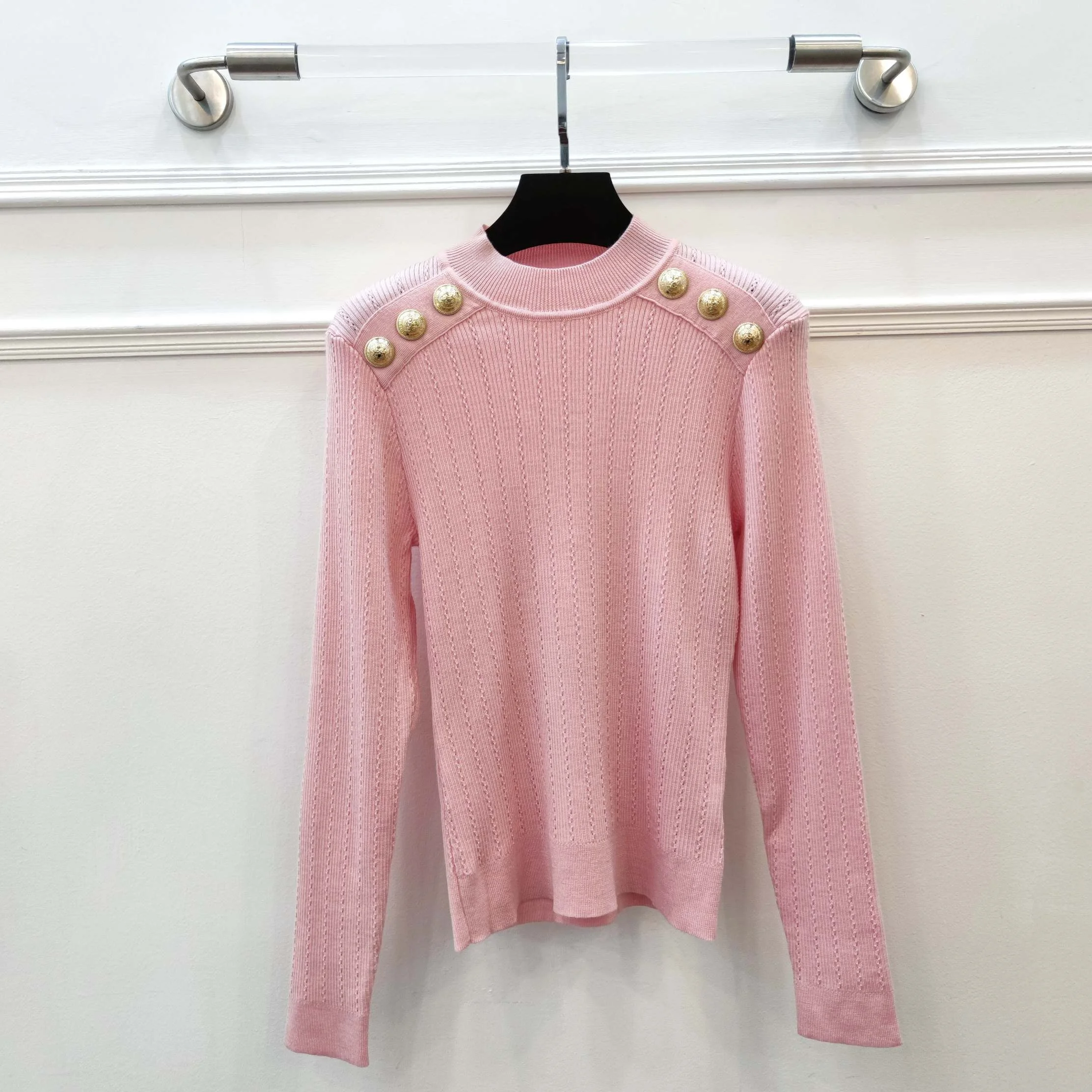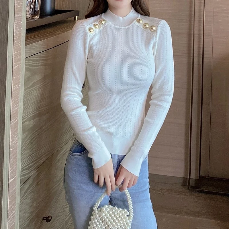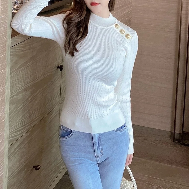 Ropa De Mujer Invierno Dropshipping Sweaters Fashionable Lady Crew Neck Gold Button Long Sleeve Thrift Pullover Knitted Sweater