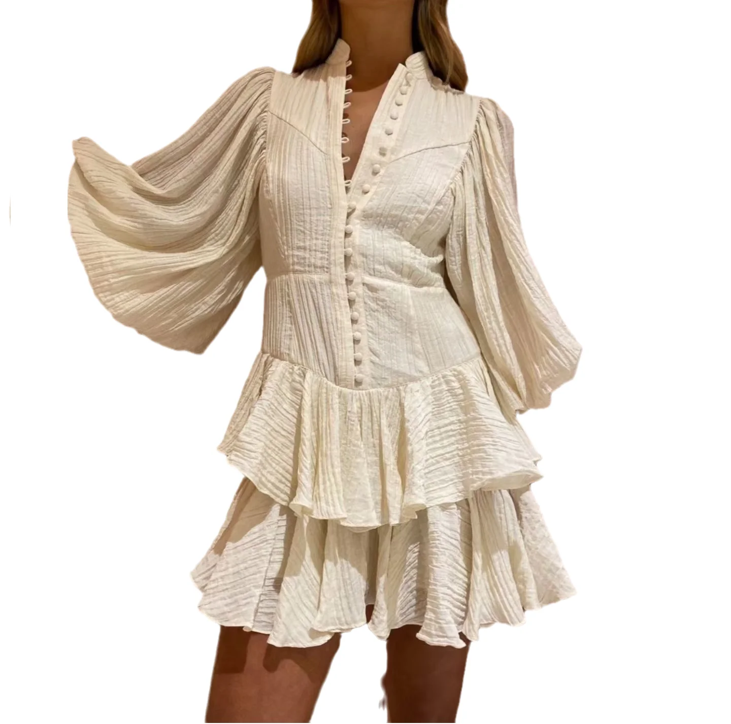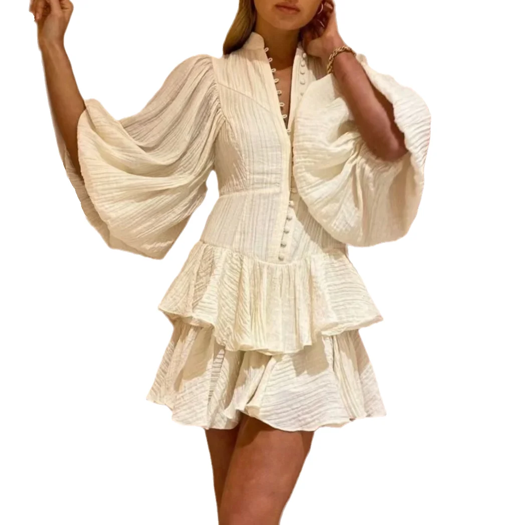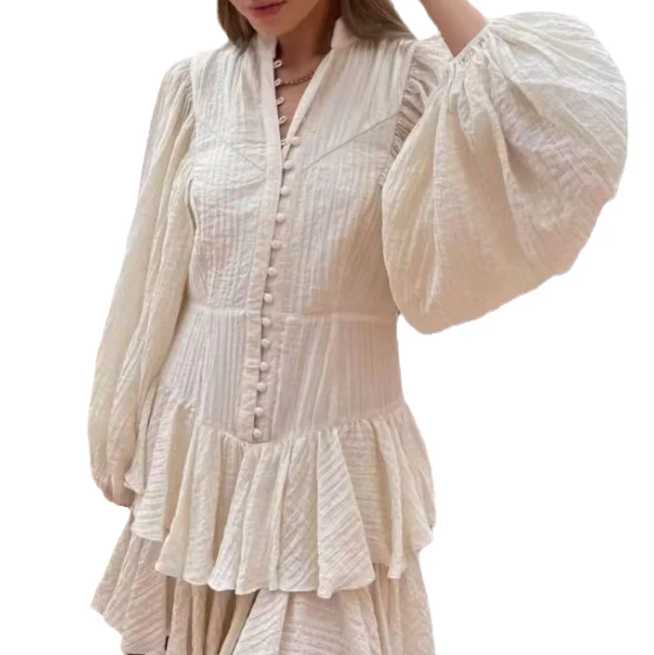 Ropa Para Damas White Standing Collar Waist Lantern Long Sleeve Puffy Casual Mini Club Wom Dress