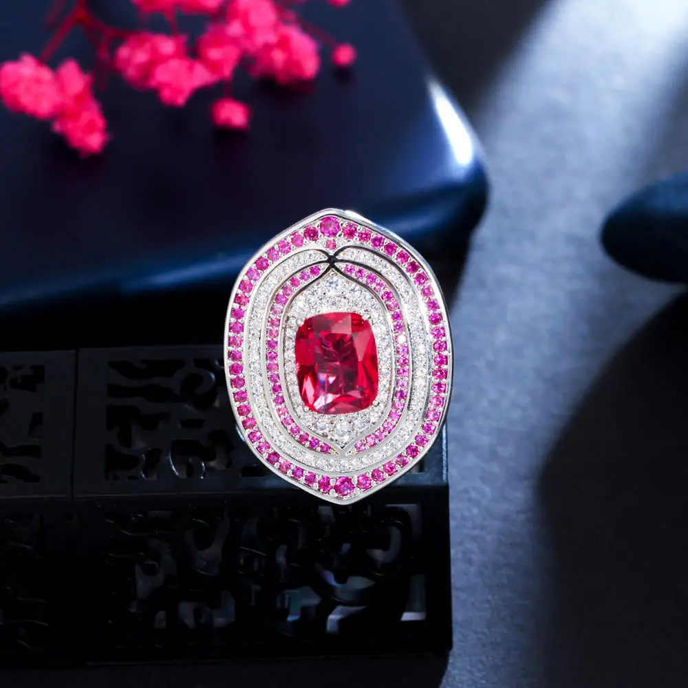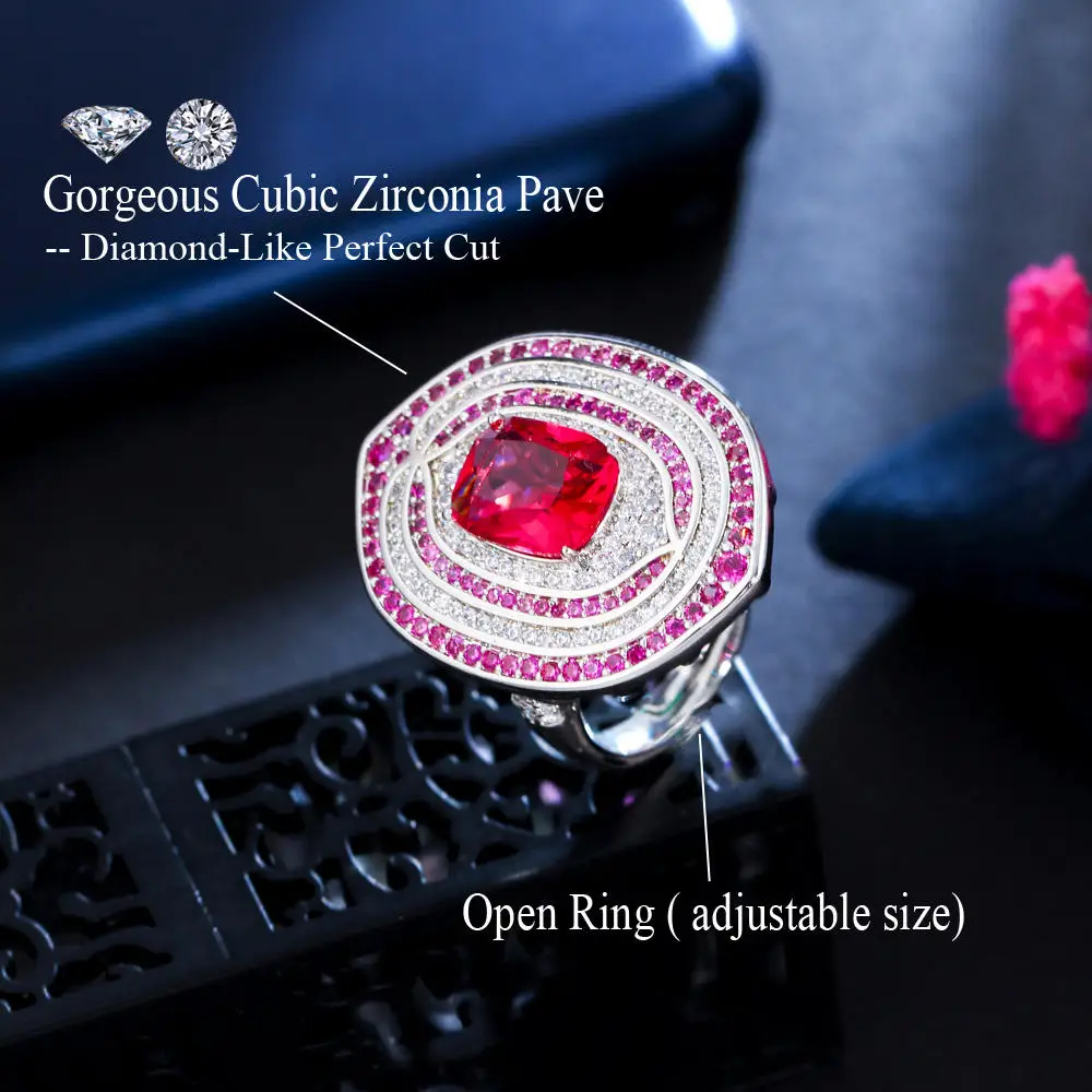 Rose Red Cubic Zirconia Paved Setting Ladies Big Chunky Engagement Wedding Adjustable Rings for Bridal Luxury Statement Jewelry