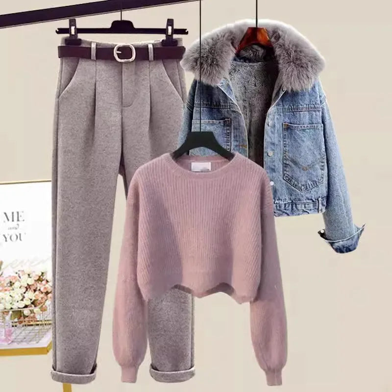 S-XL sweater plush denim jacket long pants three piece women's set Can be purchased separately