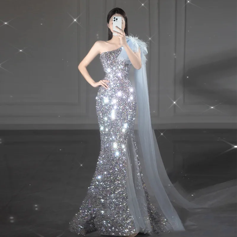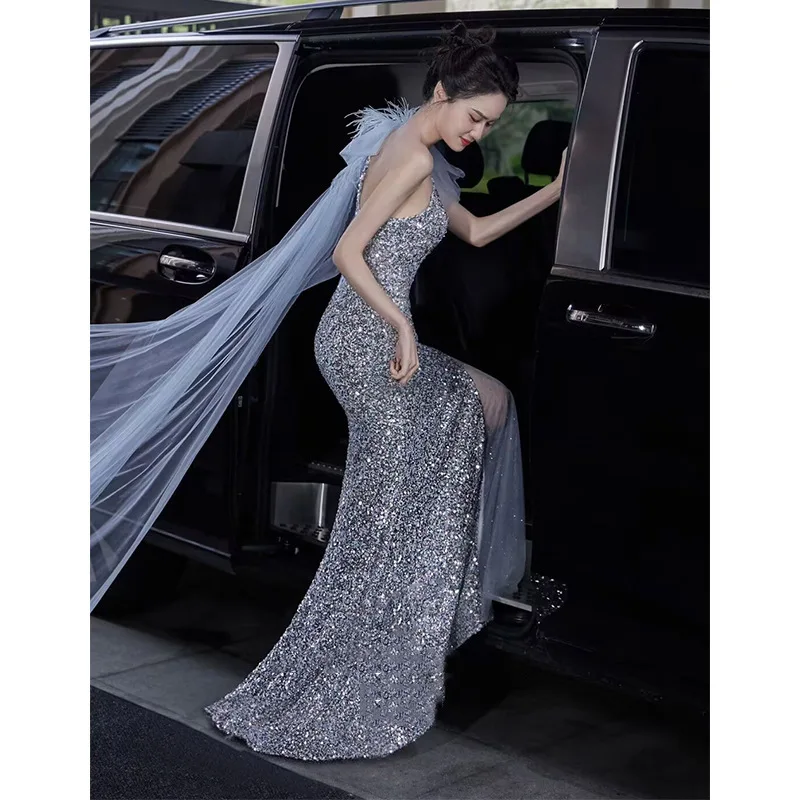S0471R New hot style high-end bride one-shoulder ribbon elegant engagement sexy dream fishtail light luxury sequin dress