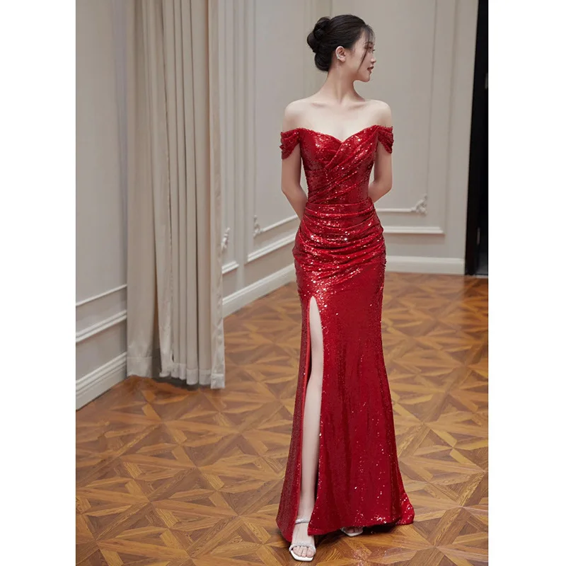 S0510R One-shoulder temperament bride wine red wedding return dress high-end slim engagement fishtail dress