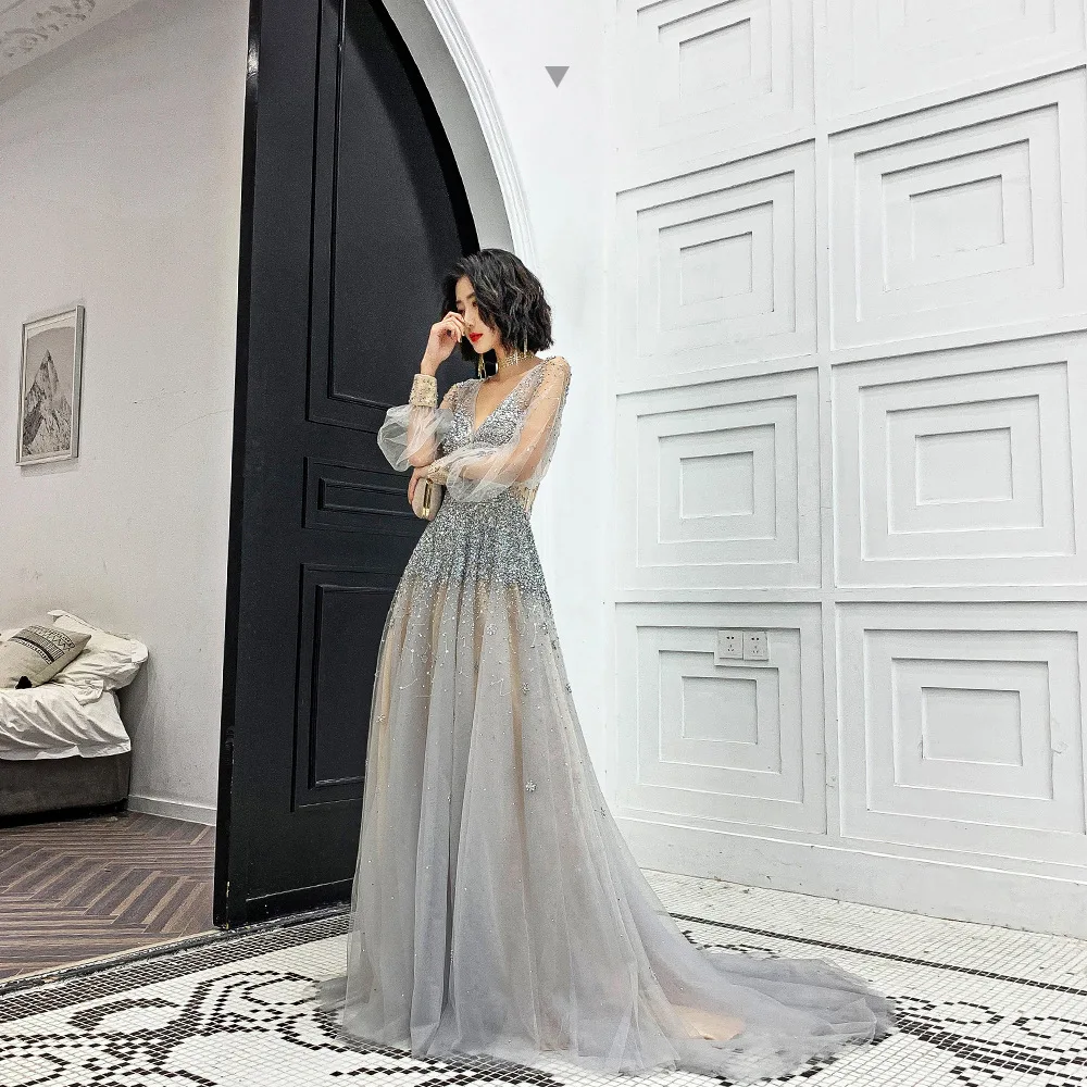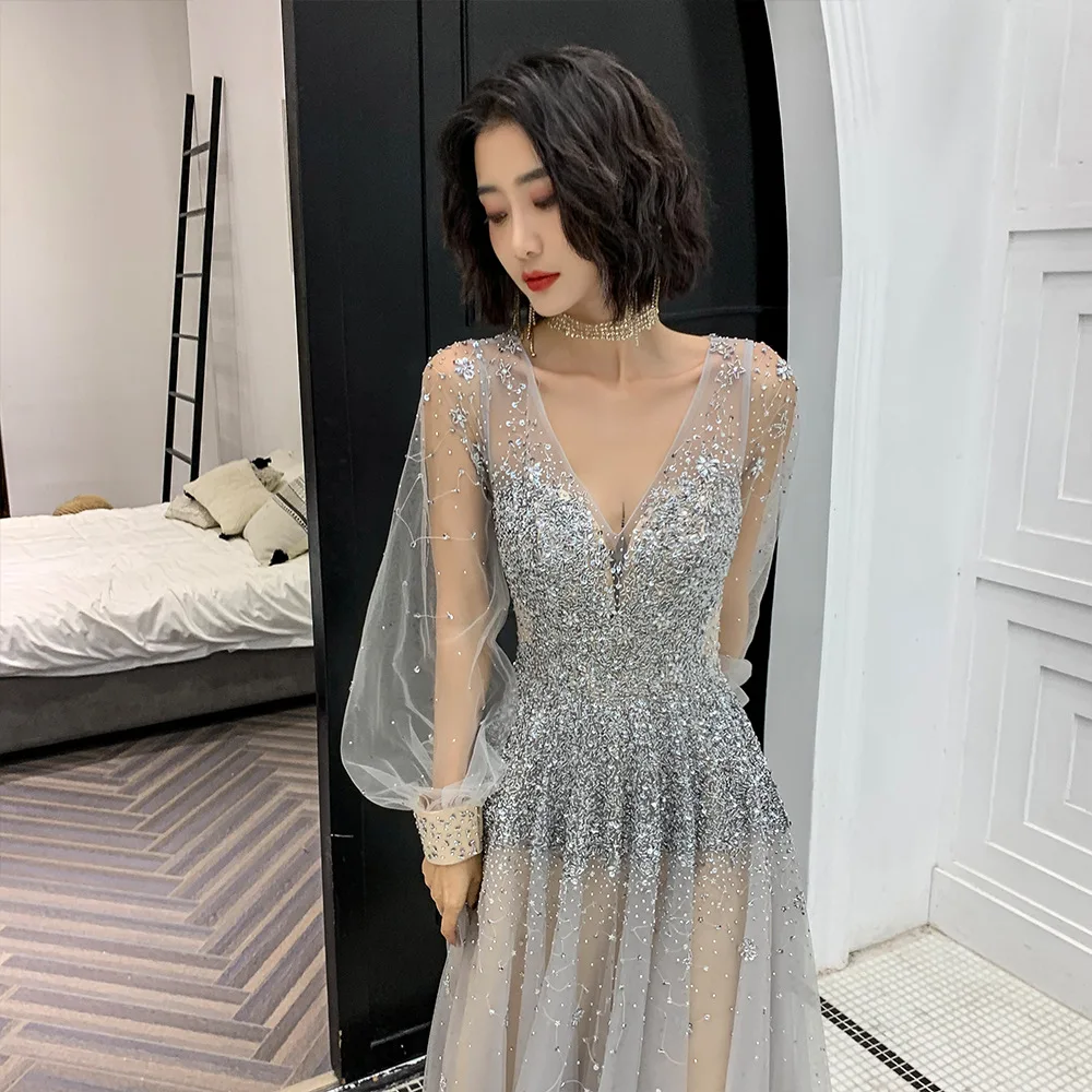 S0603H New temperament light gauze heavy industry long-sleeved backless simple bridal evening dress