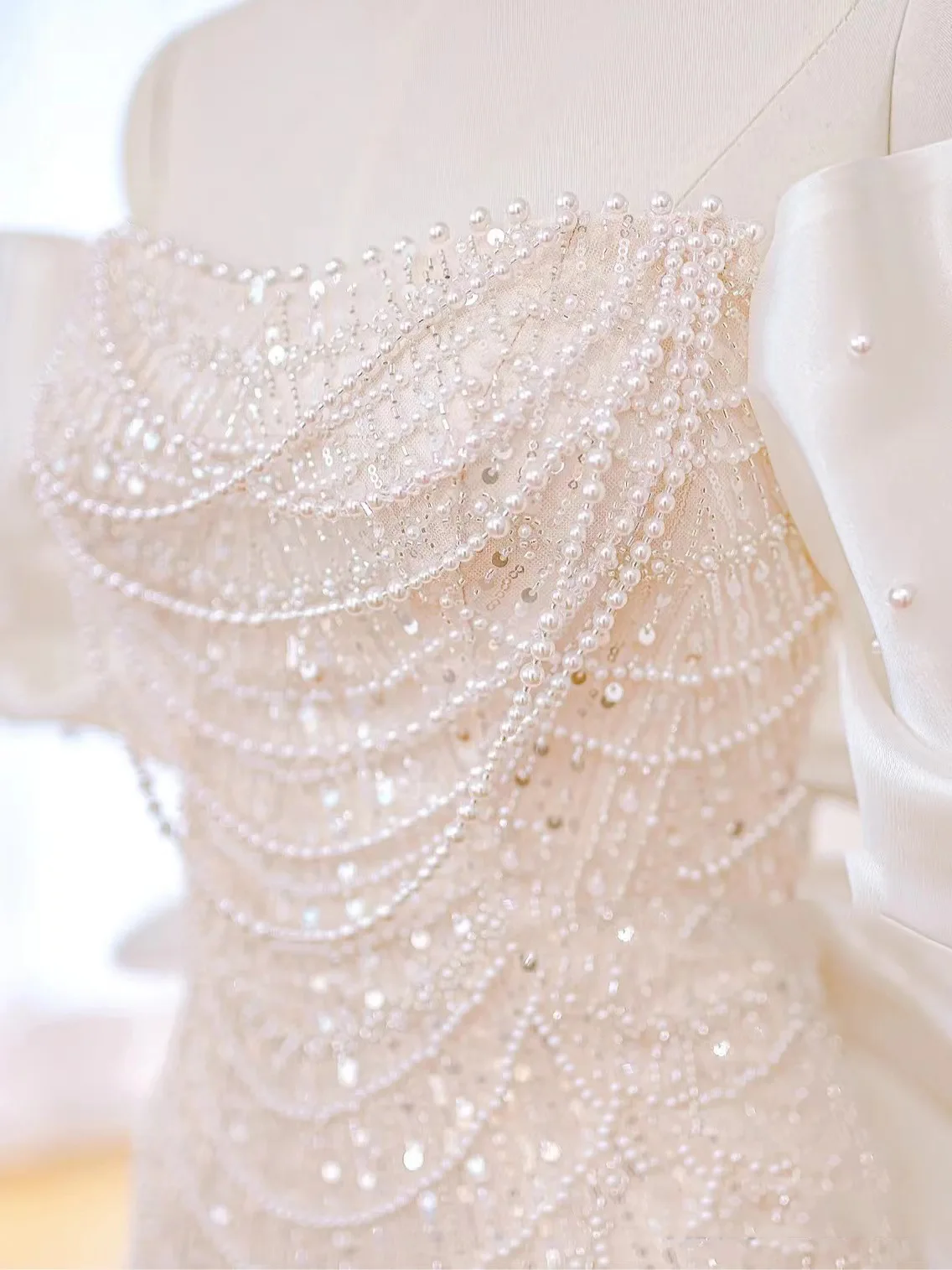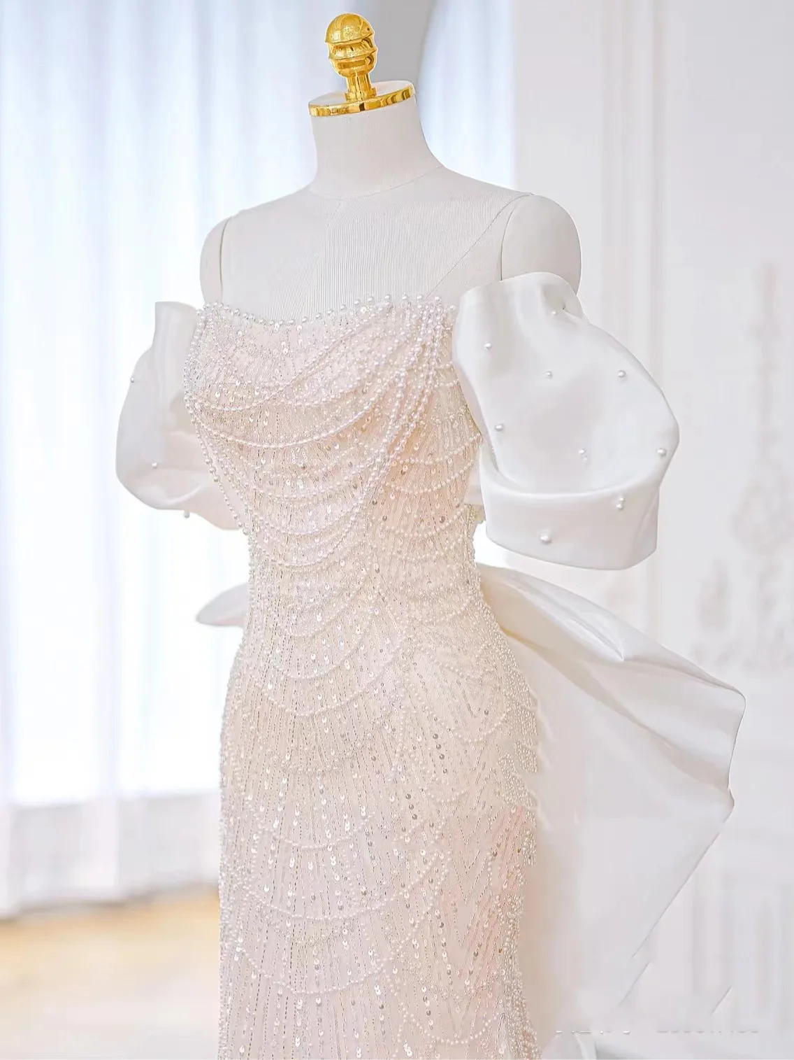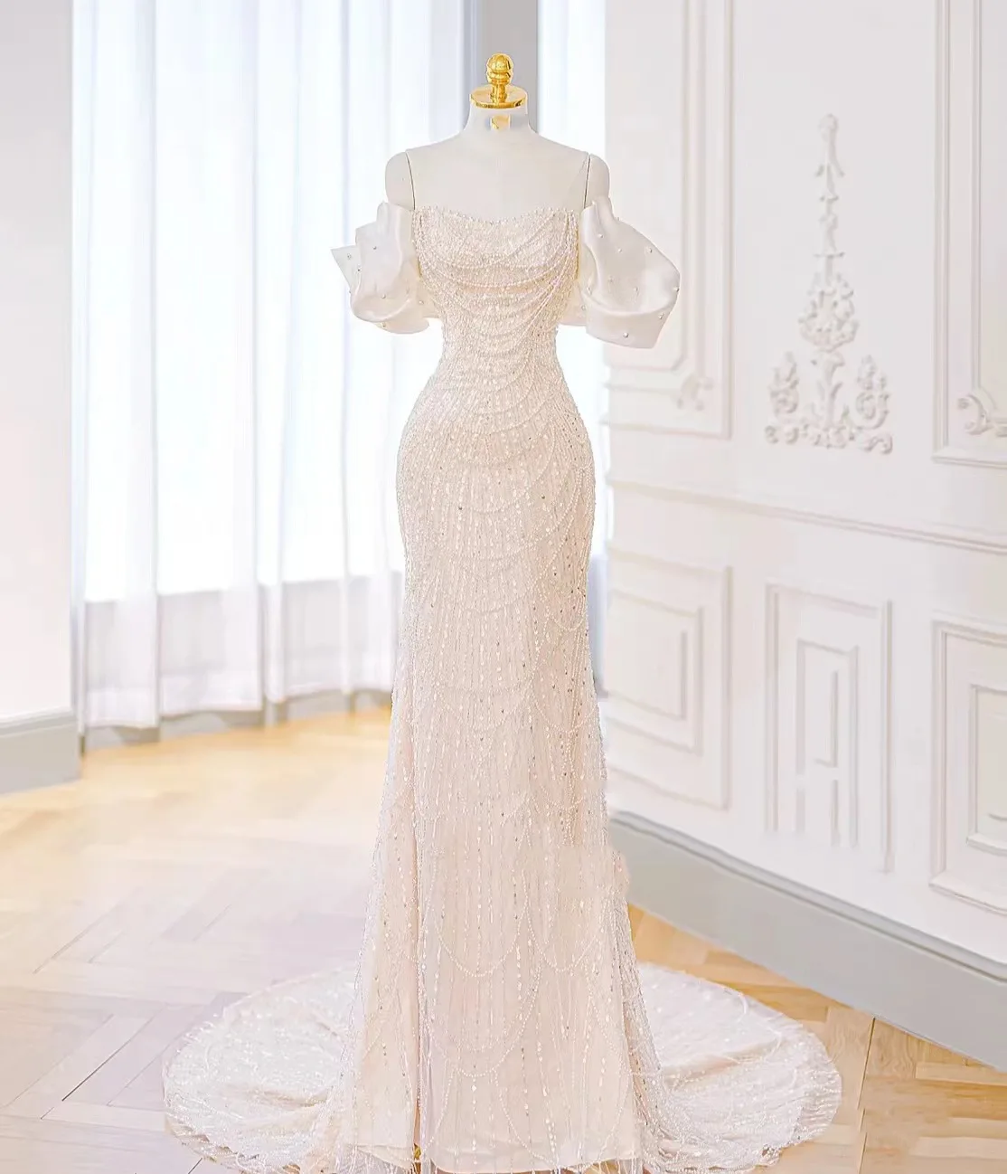 S7833F Mi -white mermaid nails beaded model catwalk light luxury off shoulder heavy work ladies dress for party