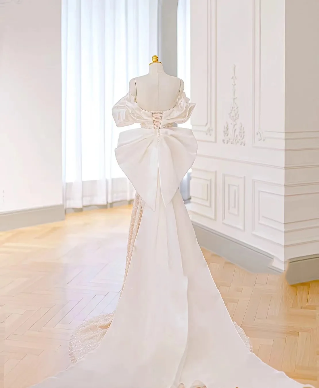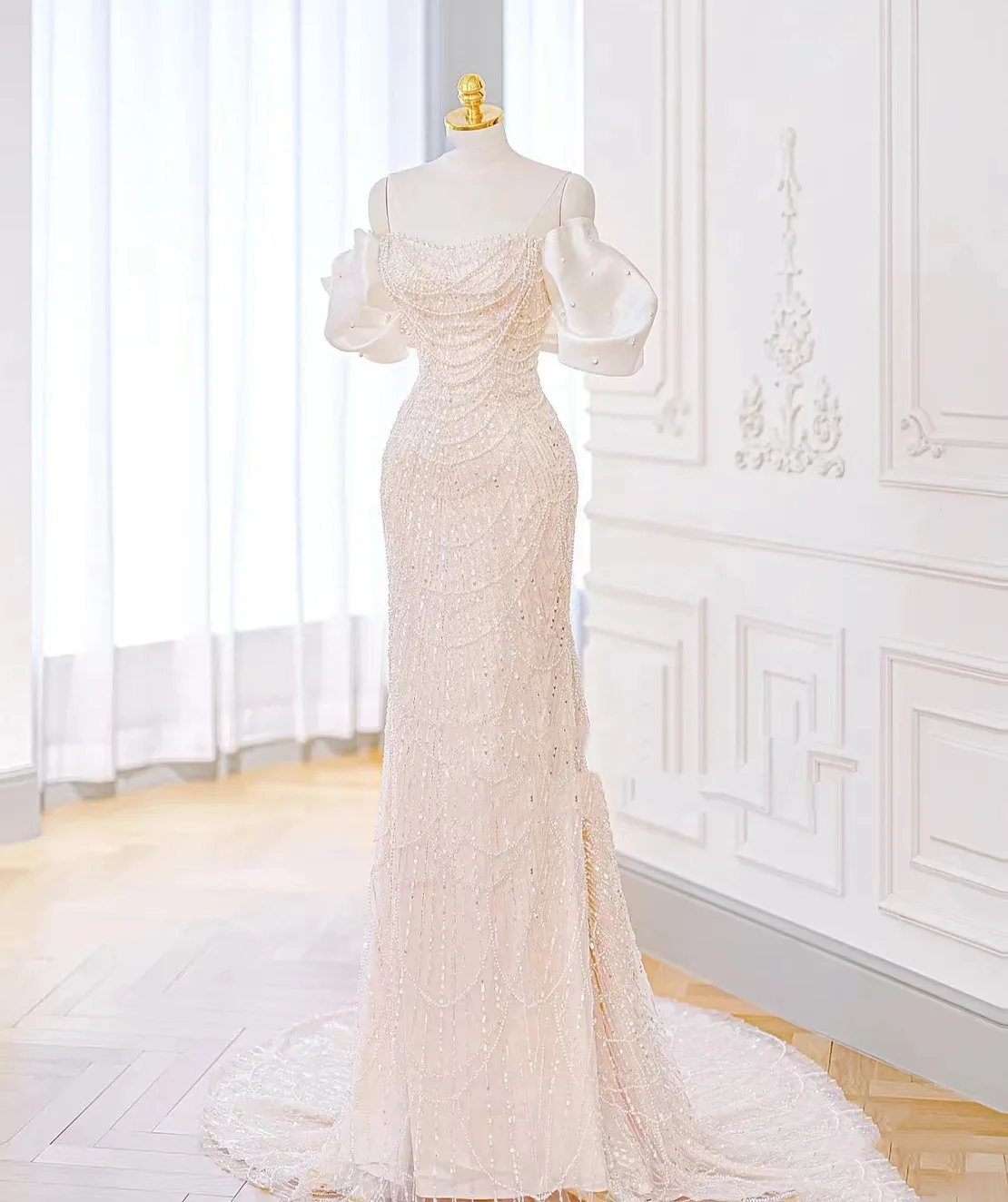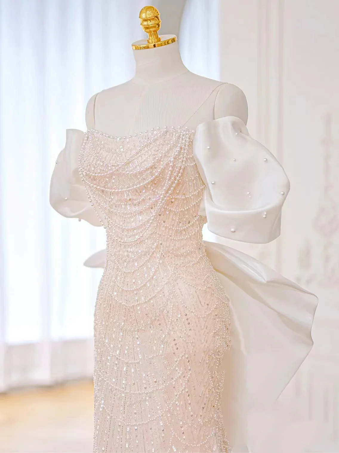 S7833F Mi -white mermaid nails beaded model catwalk light luxury off shoulder heavy work ladies dress for party