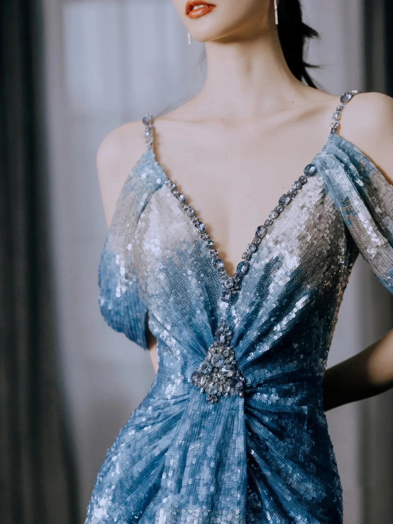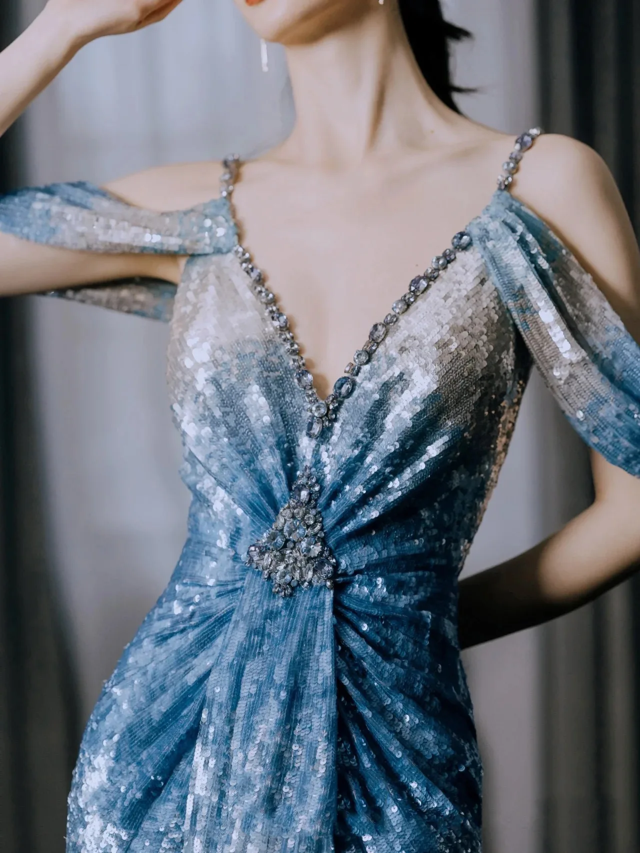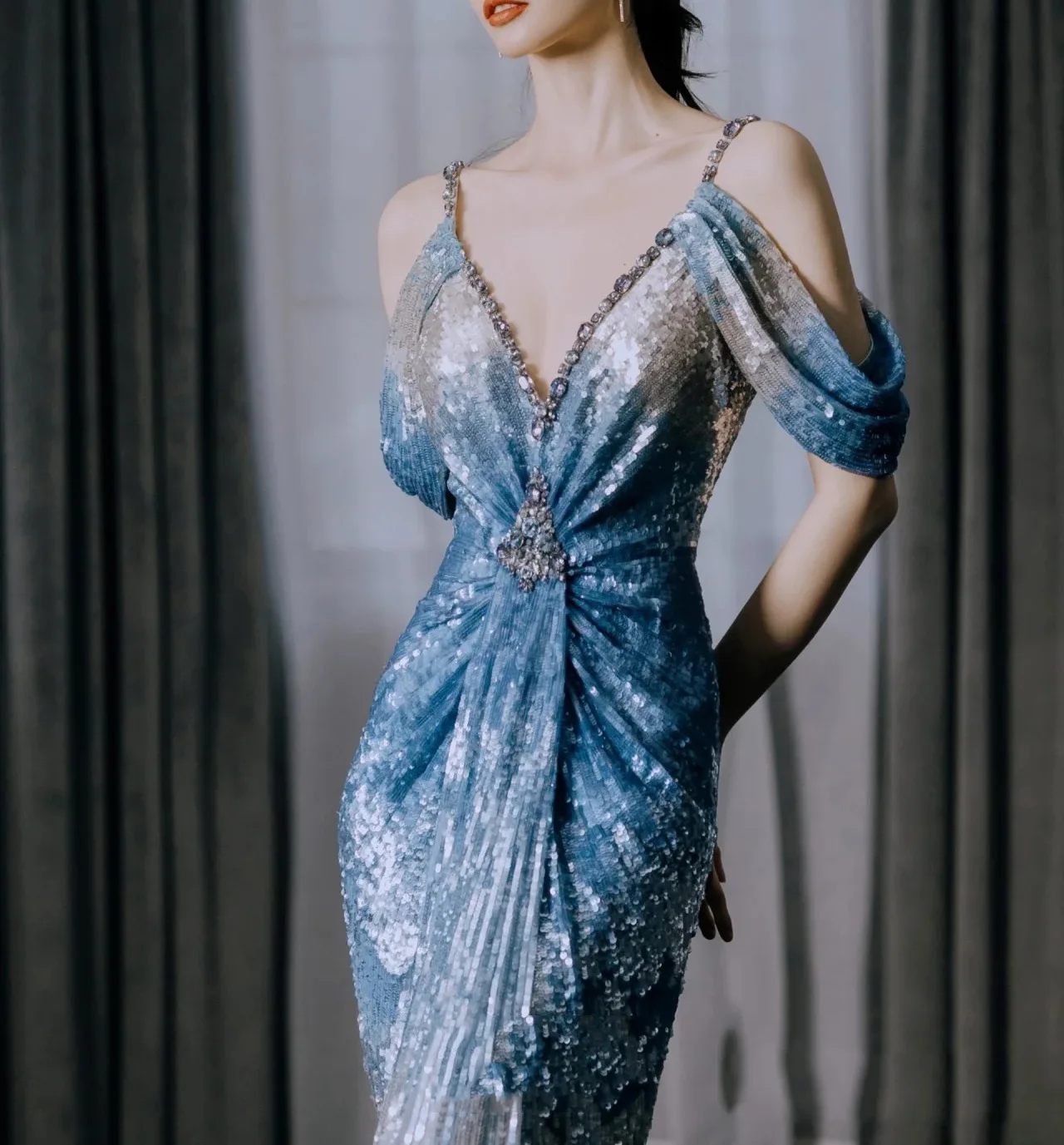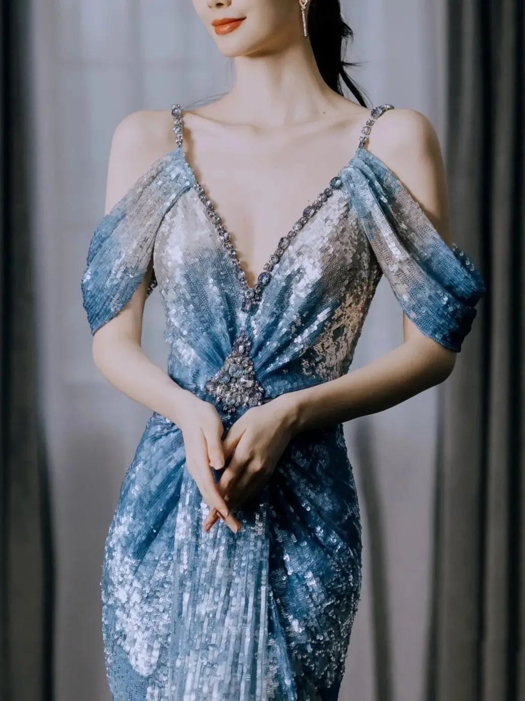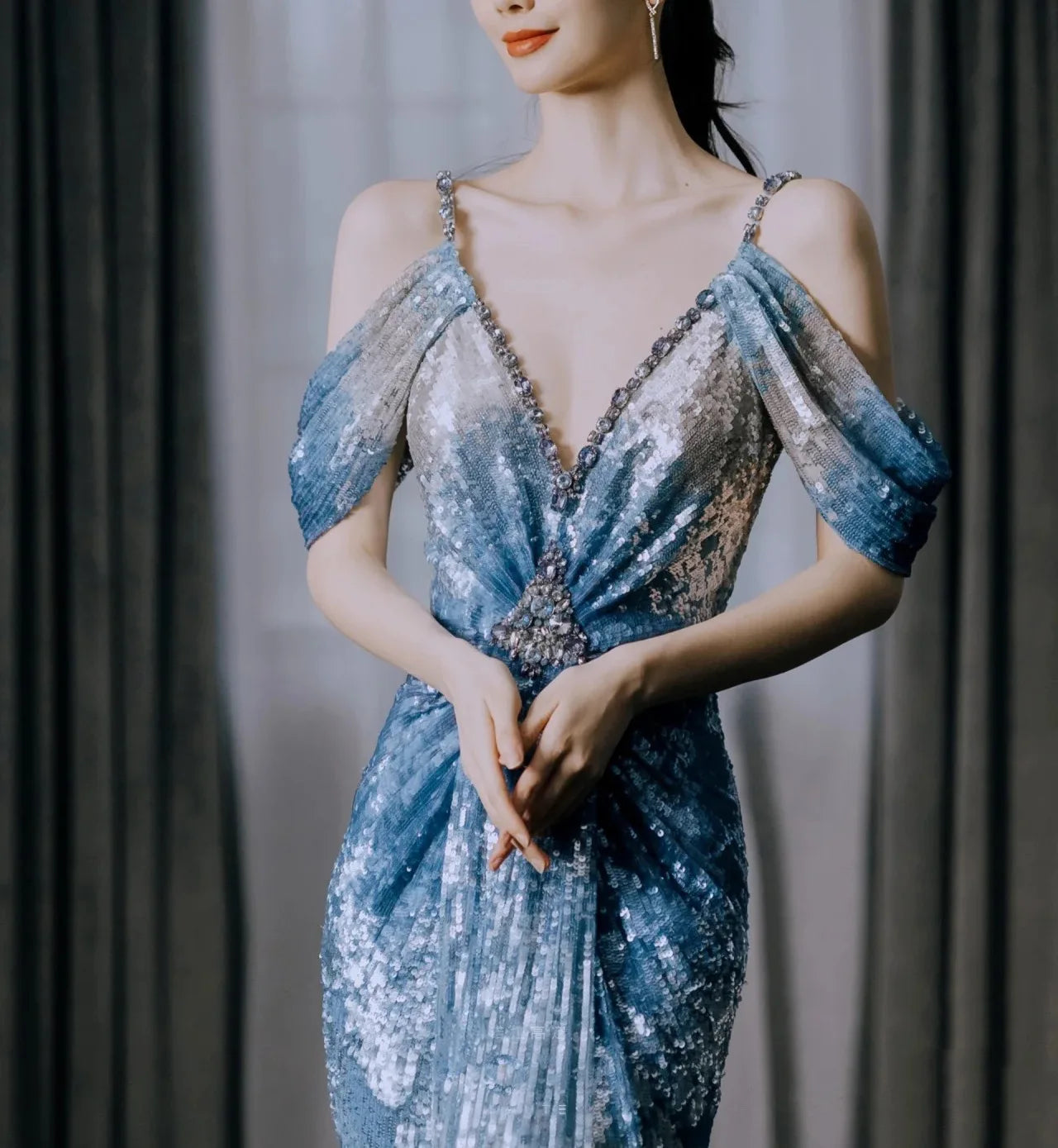 S7834F Gradient blue Off shoulder mold showing starry Mermaid Annual Meeting Pearl ladies plus size dinner party dres