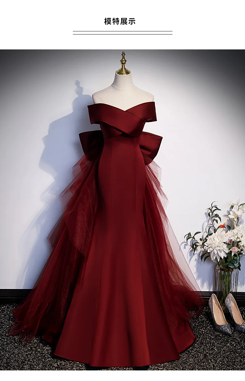 S8105F High -quality wine red fishtail host a word shoulder light long lace evening dresses women lady elegant sexy