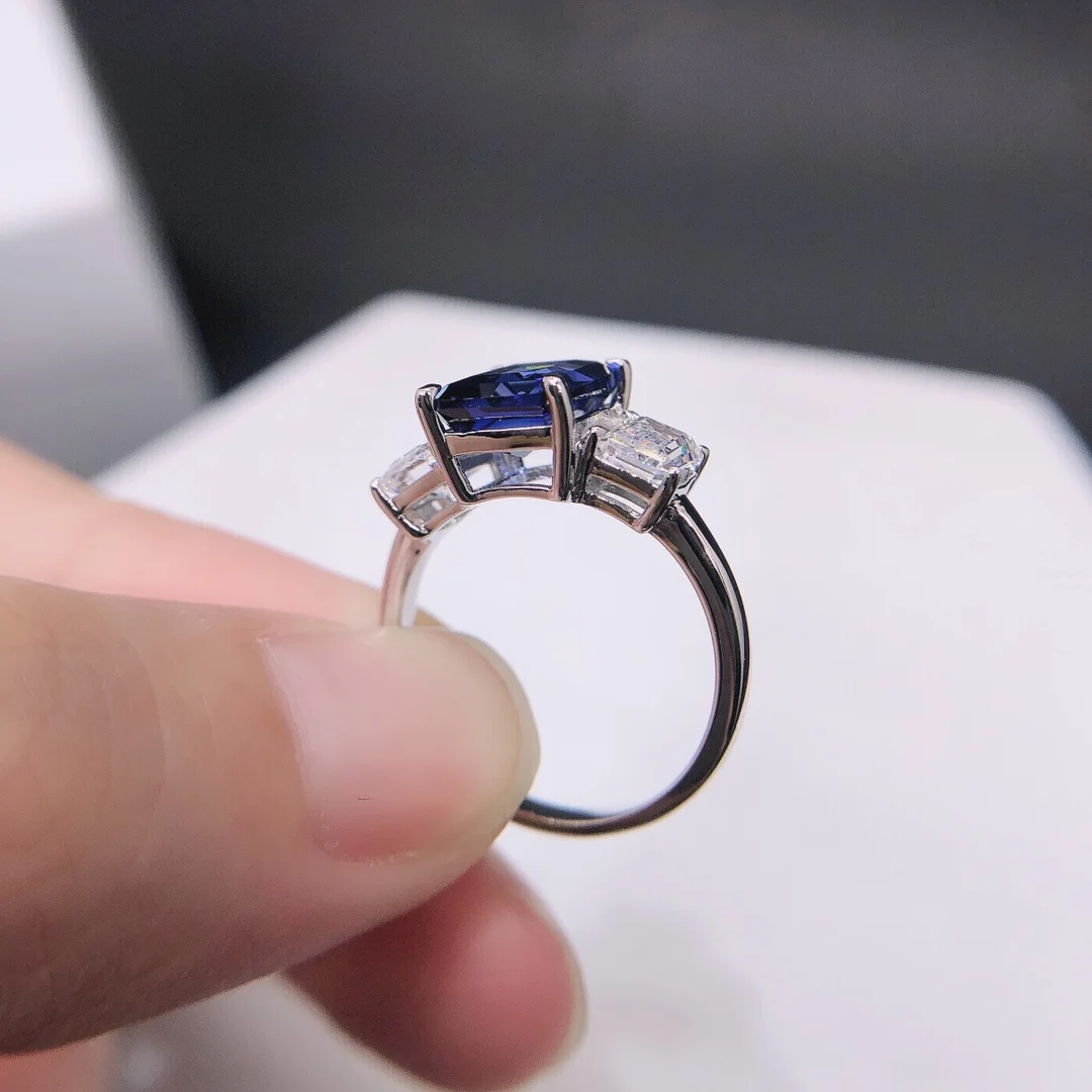S925 Silver Fine Engagement Jewelry 0.5+2+0.5 ct Central Blue Emerald Moissanite Diamond Ring for Women