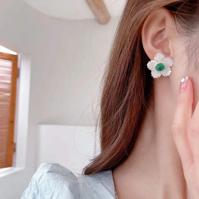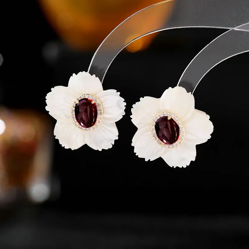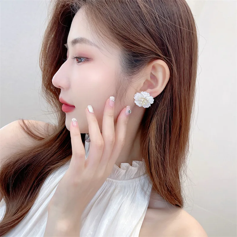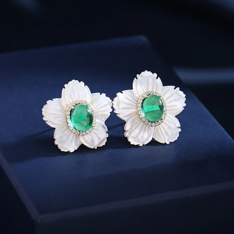 S925 Silver Needle White Color Shell Flower Earrings For Women Wedding Party Jewelry Cz Zircon Floral Statement Stud Earrings