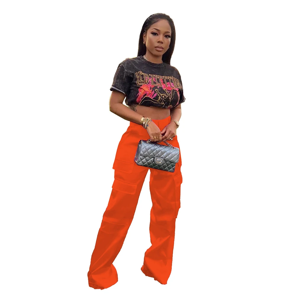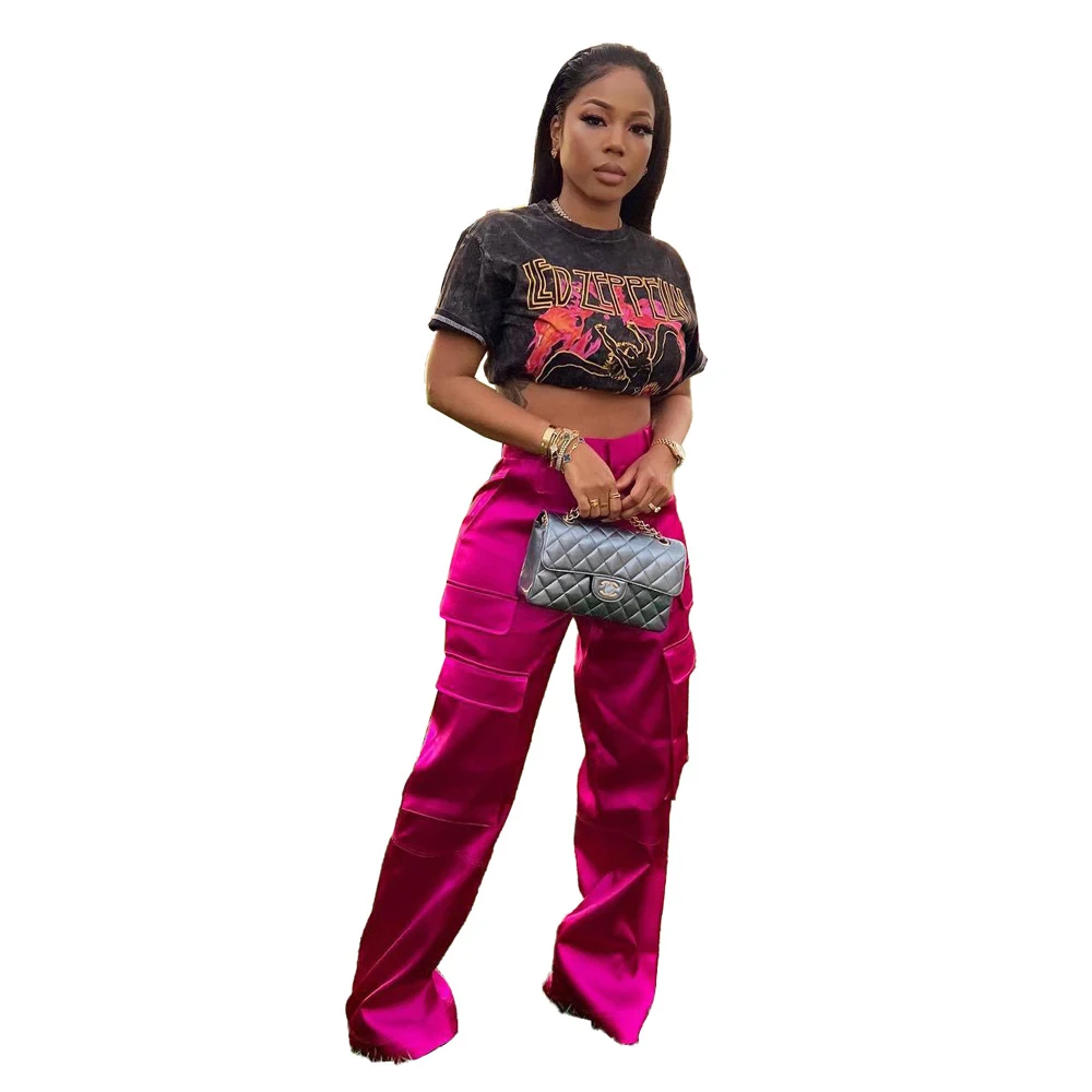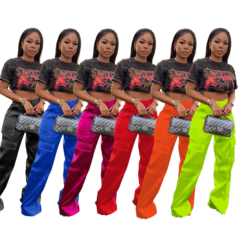 Satin Cargo Pants for Women Casual Fashion High Waist Multiple Pockets Loose Wide Leg Long Trouser