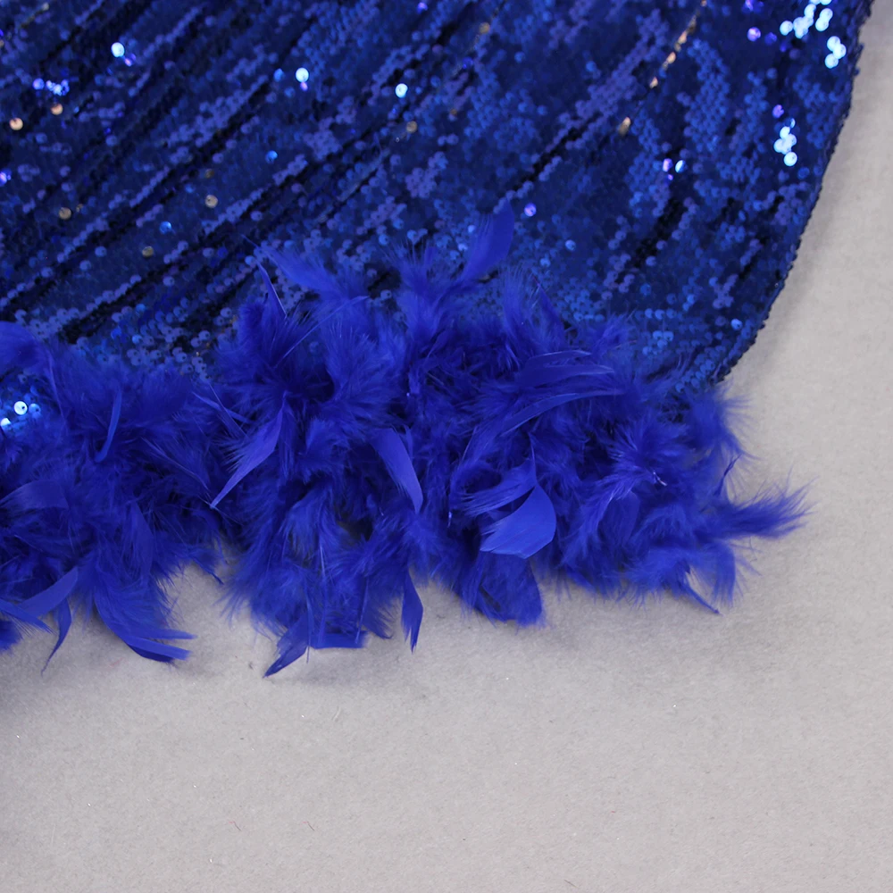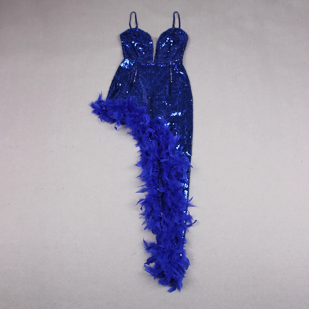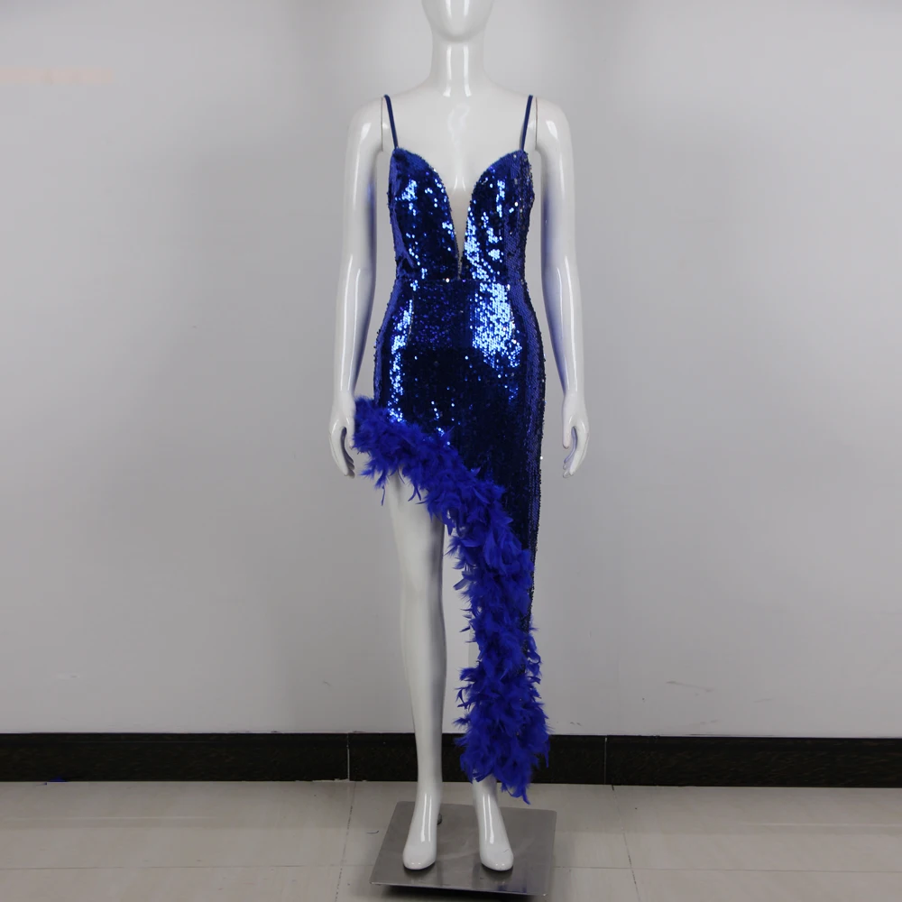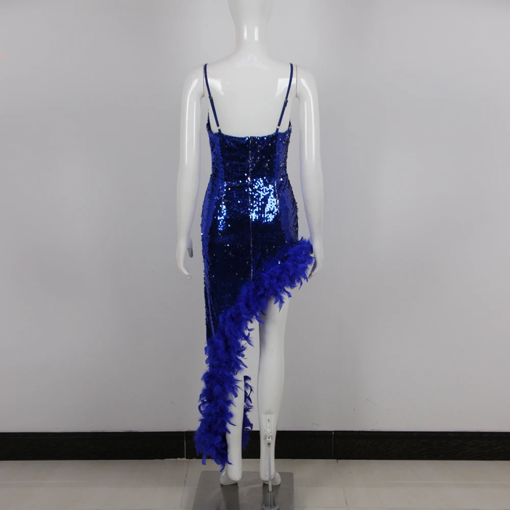 SB2454 Sequin Dresses Women Elegant Evening Summer Sexy Dress With High Slit Sparkling Blue Long Dress With Feather