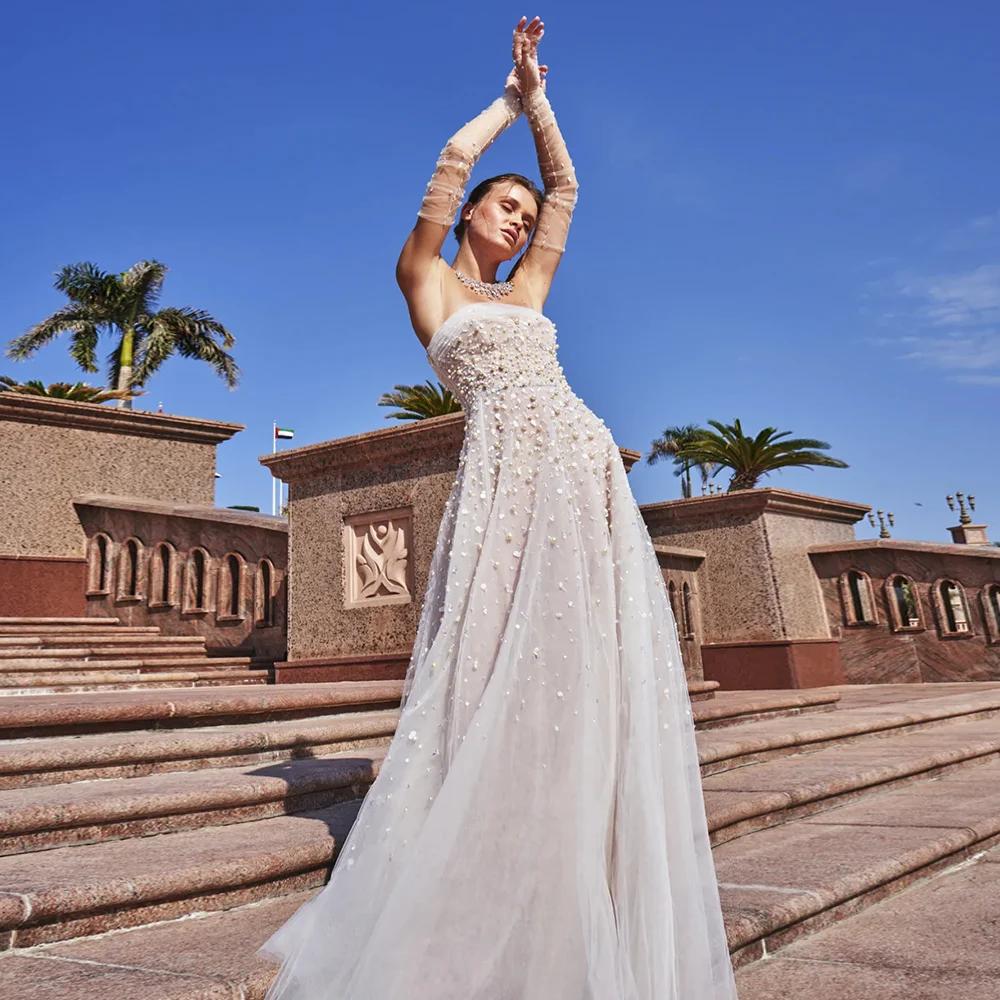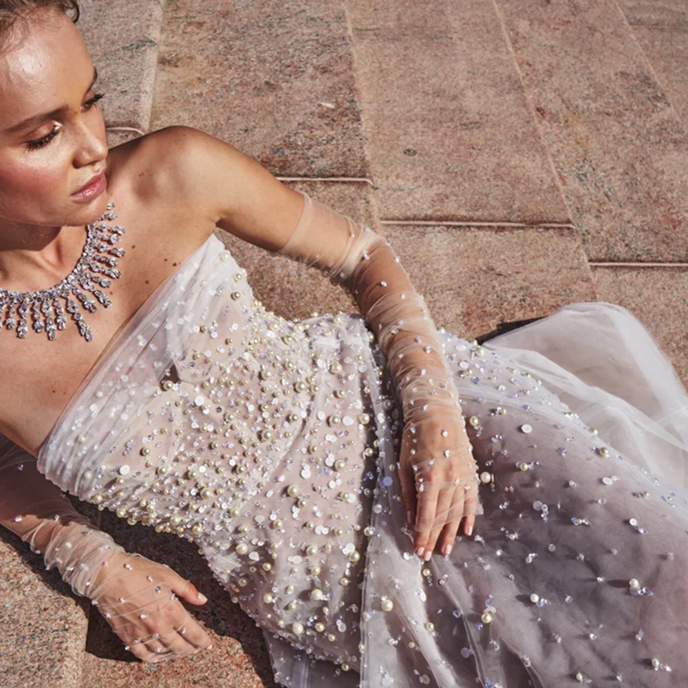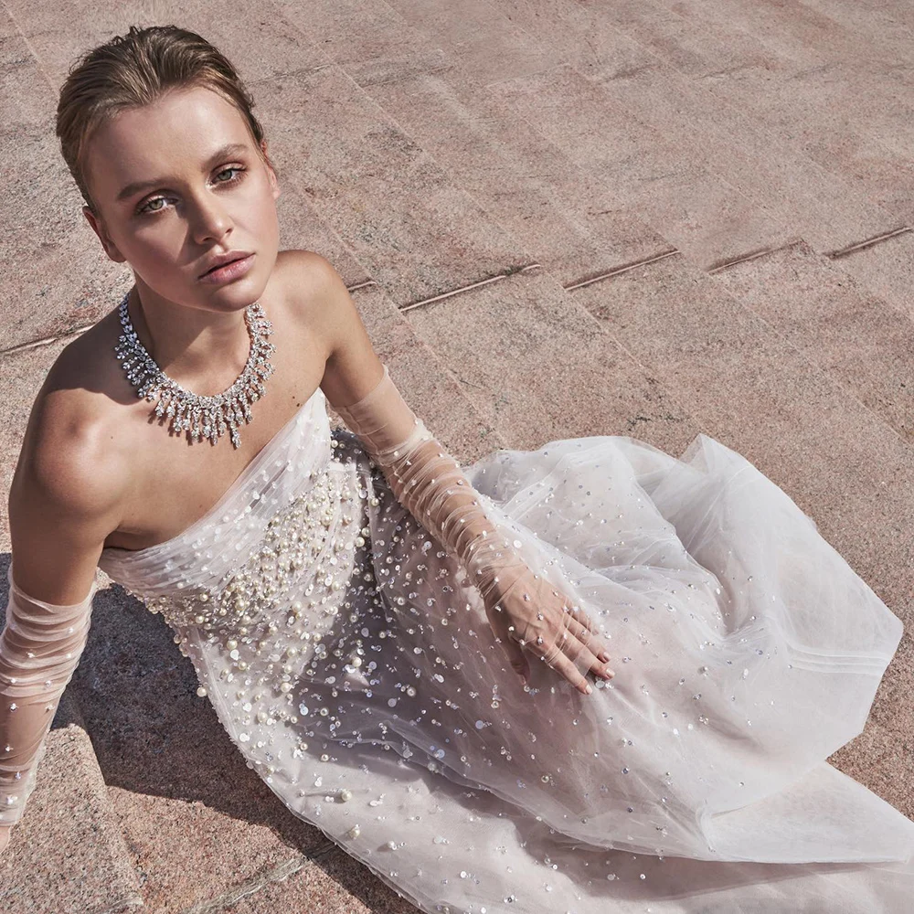 Scz059 Luxury Dubai Pearls White Nude Arabic Evening Dresses With Gloves Elegant Women Wedding Bridal Party Gowns