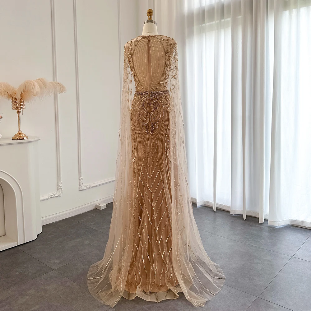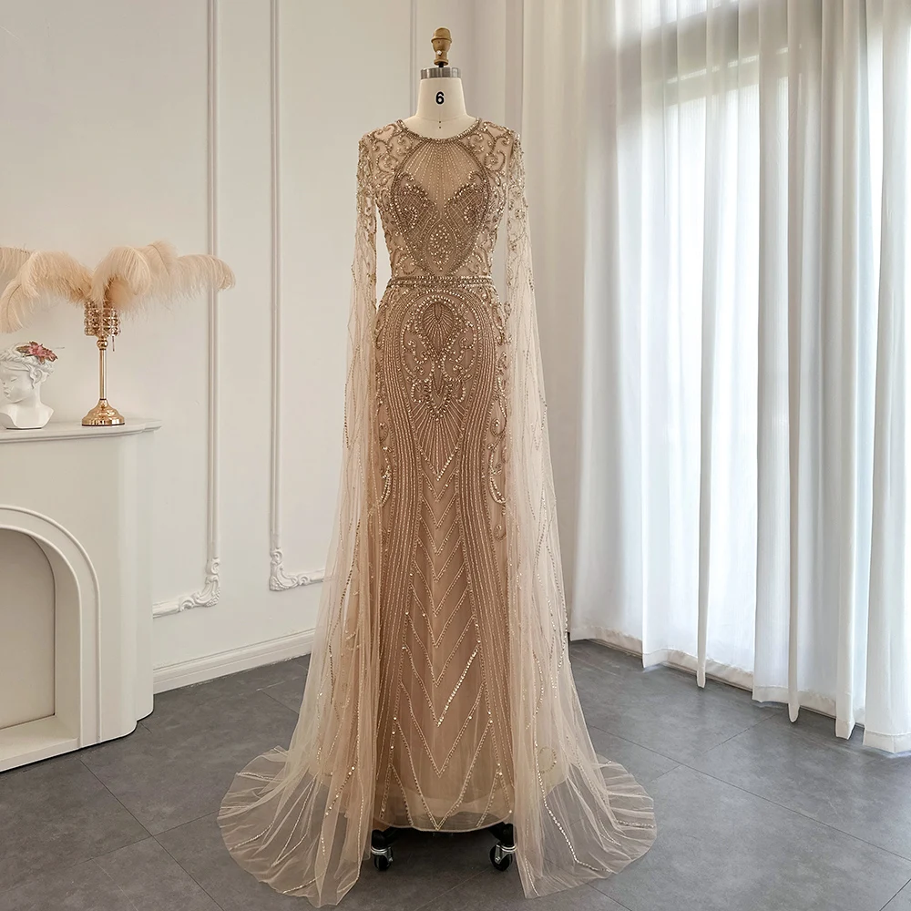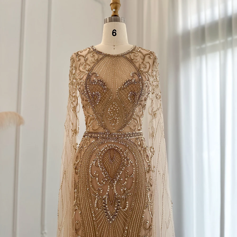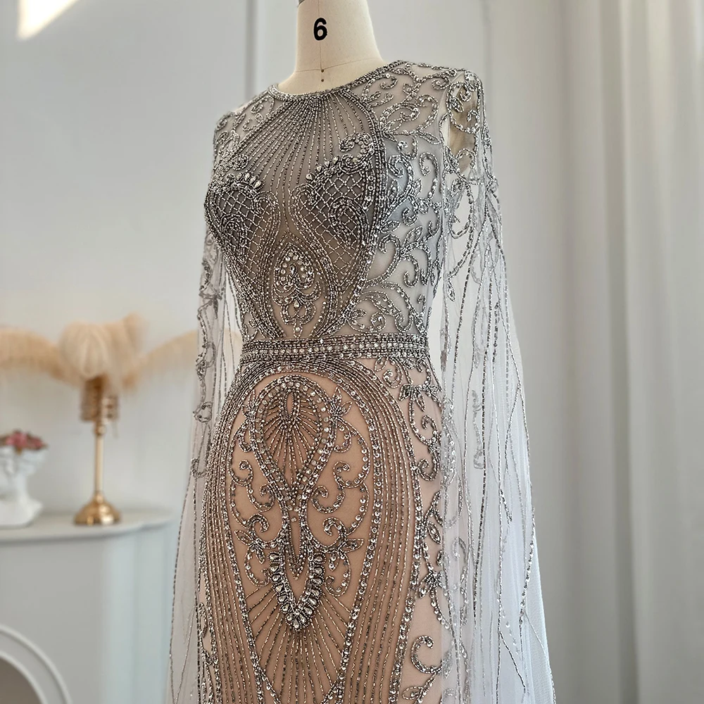 Scz061 Luxury Silver Nude Dubai Evening Dresses With Cape Sleeves Champagne Muslim Arabic Women Wedding Party Dress