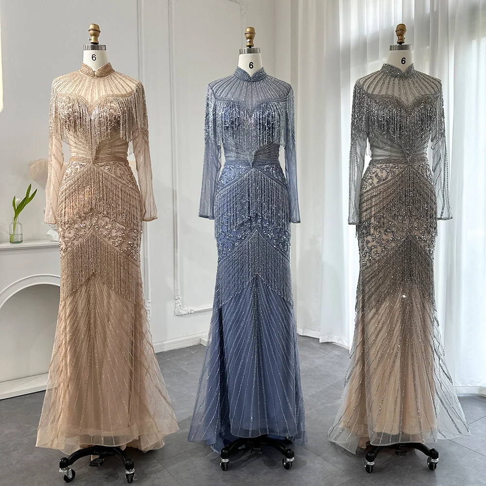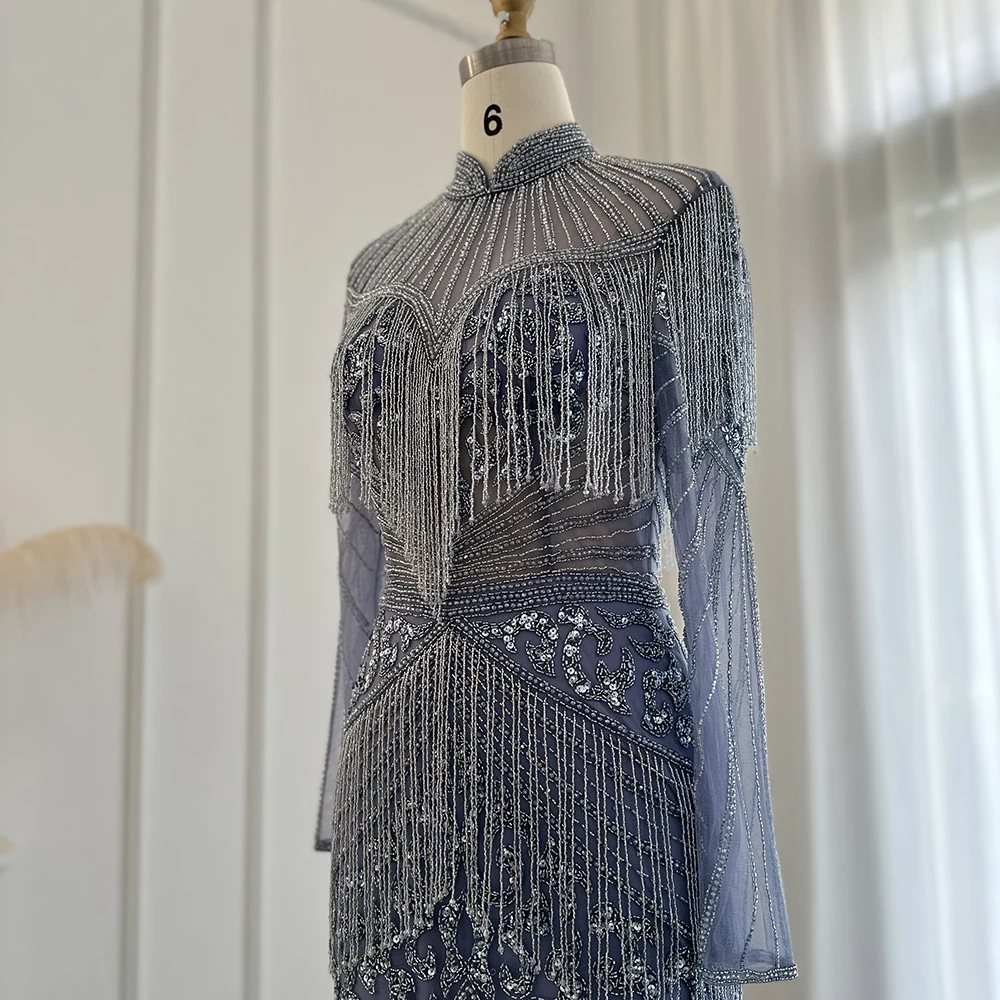 Scz062 Heavy Beaded Tassel Blue Luxury Dubai Evening Dresses 2023 Silver Nude Muslim Arabic Women Wedding Party Dress