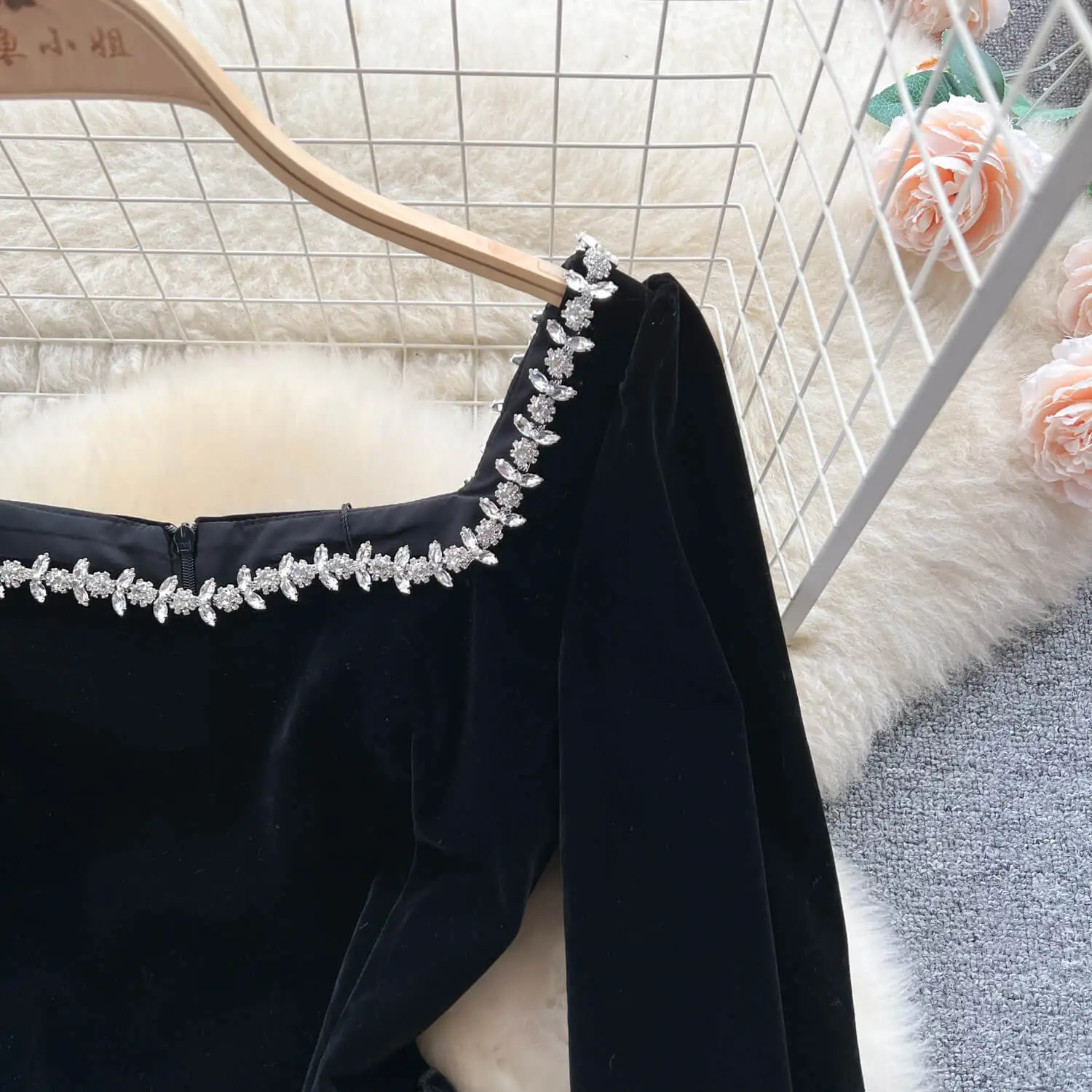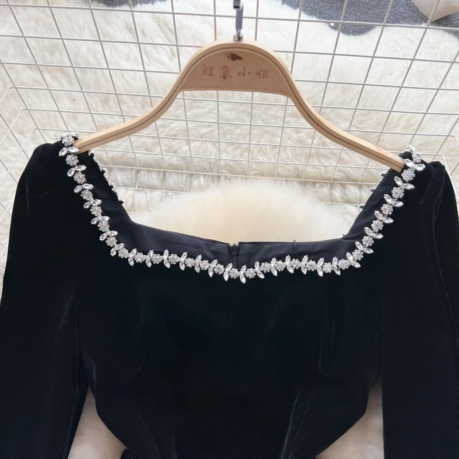 Senior Sense Diamond-Set Square Collar Slim Short Selvet Temperament Girl High-End Dress Woman