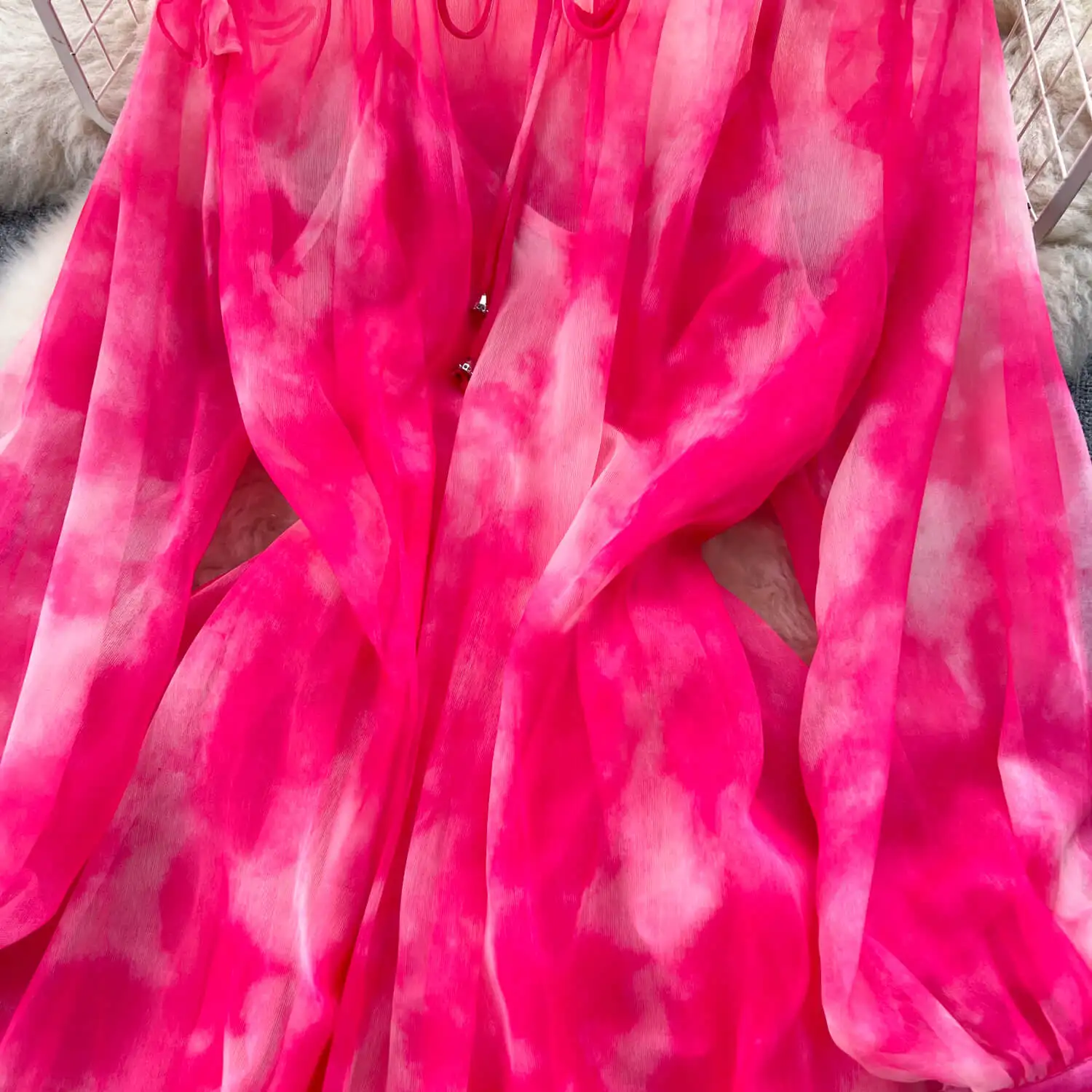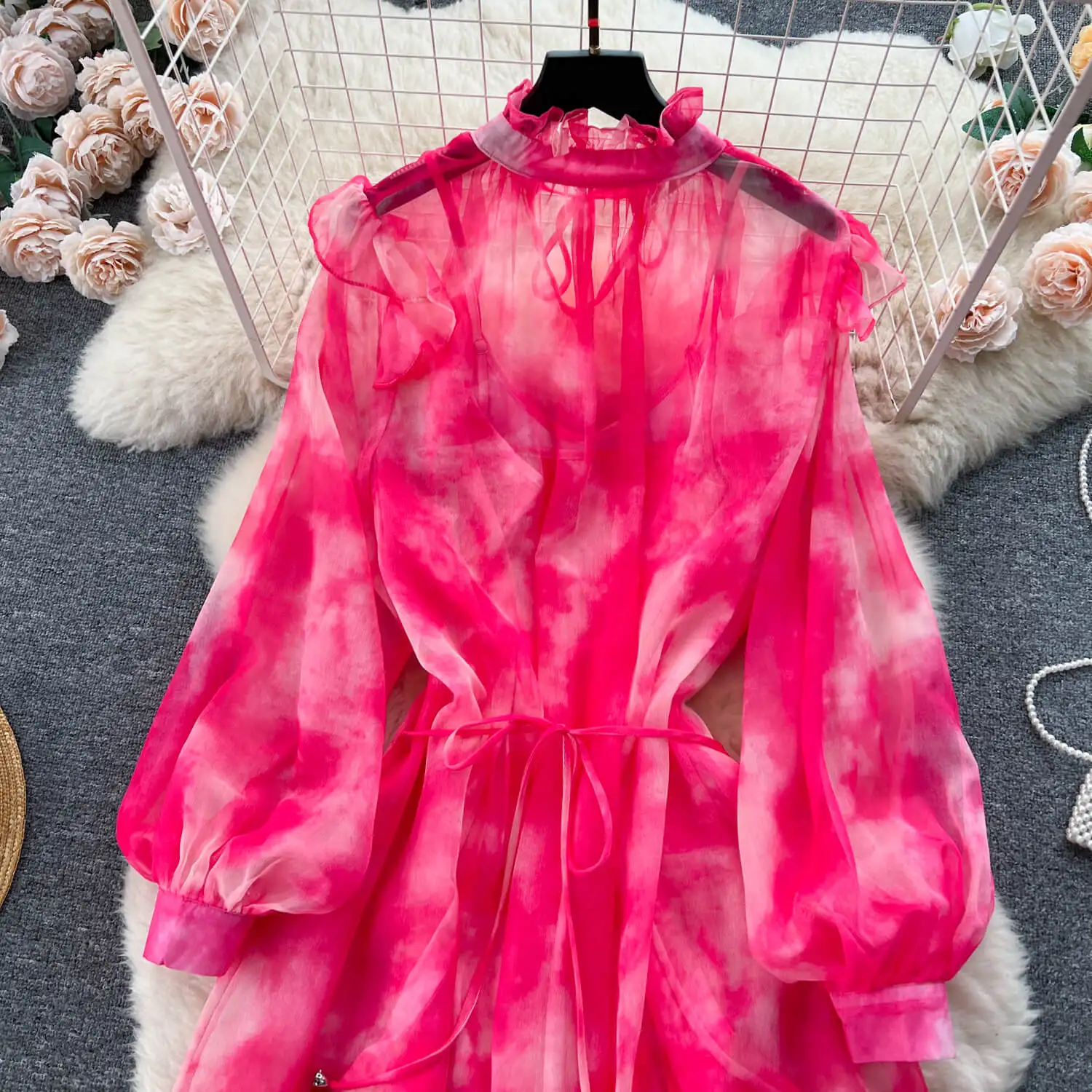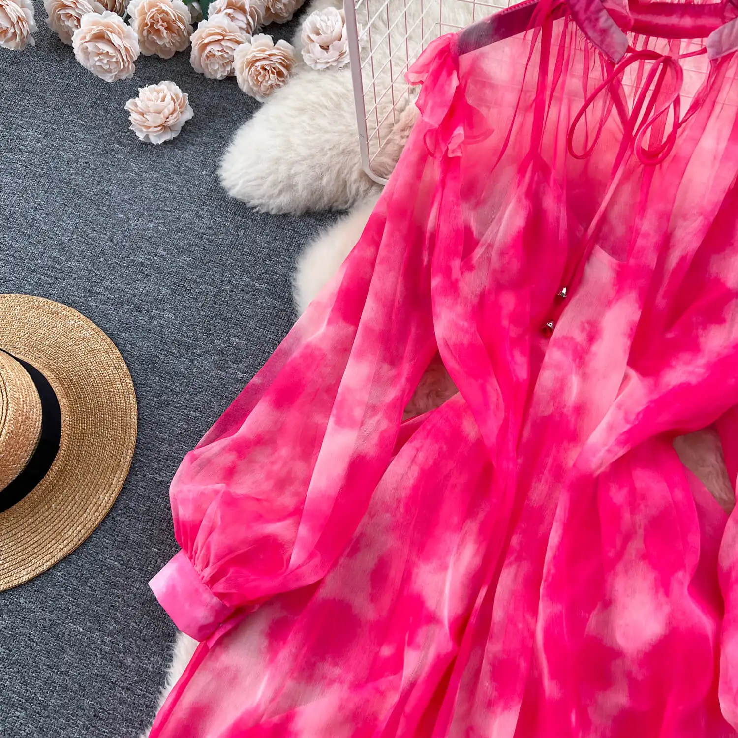 Senior Sense Standing Collar Long-Sleeved Chiffon Floral Dress Female A-Word Elegant Dress