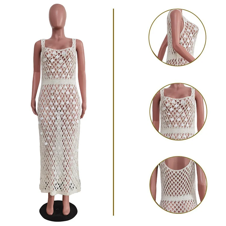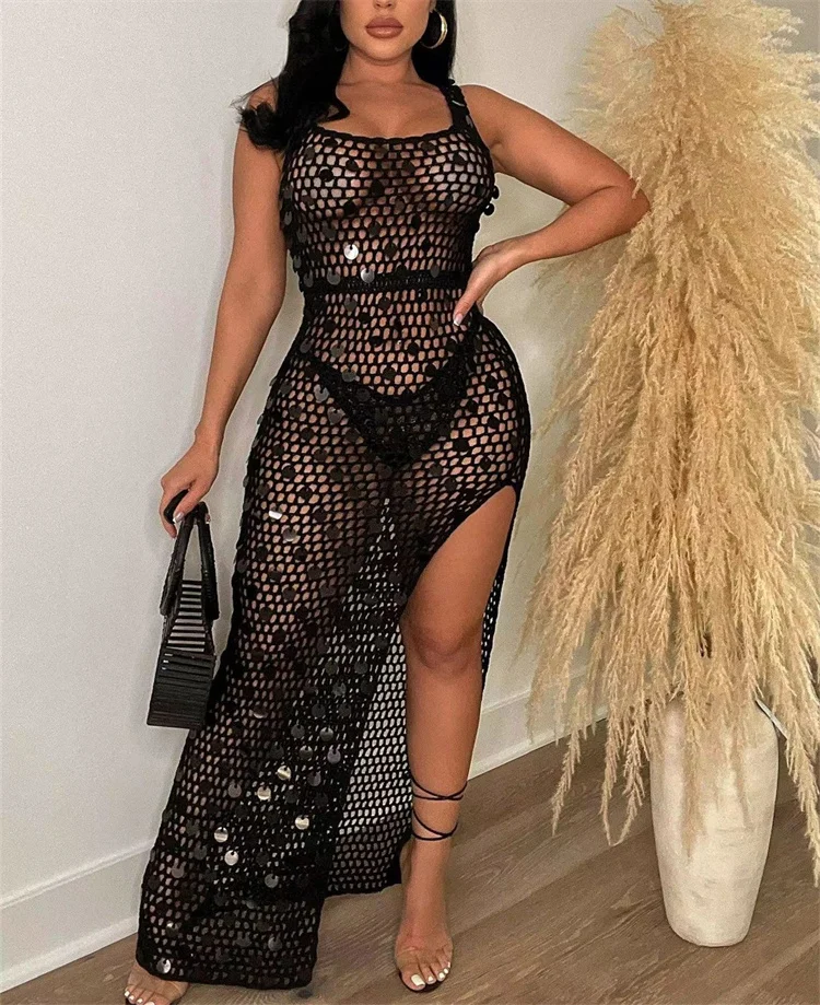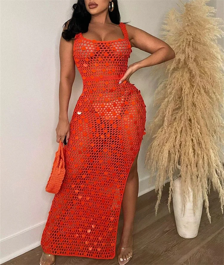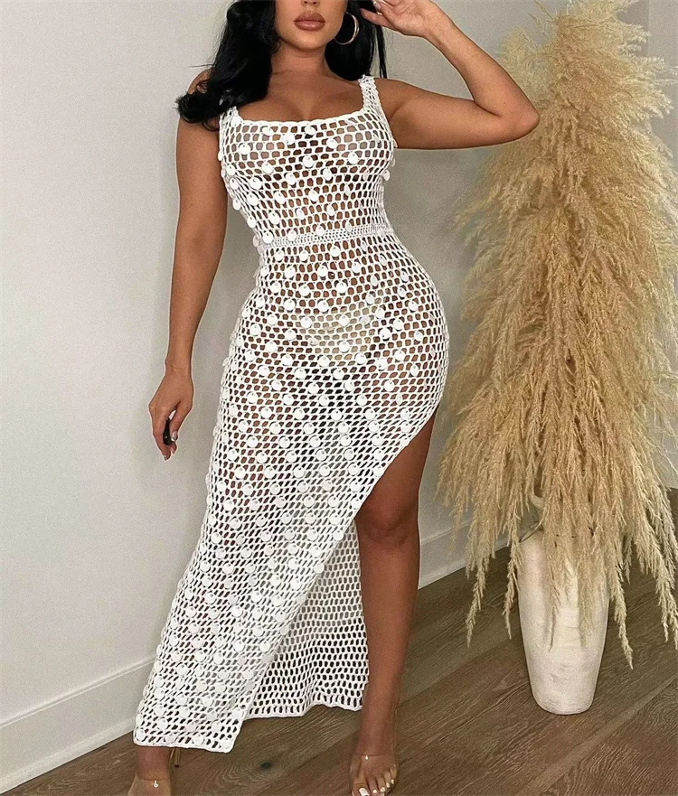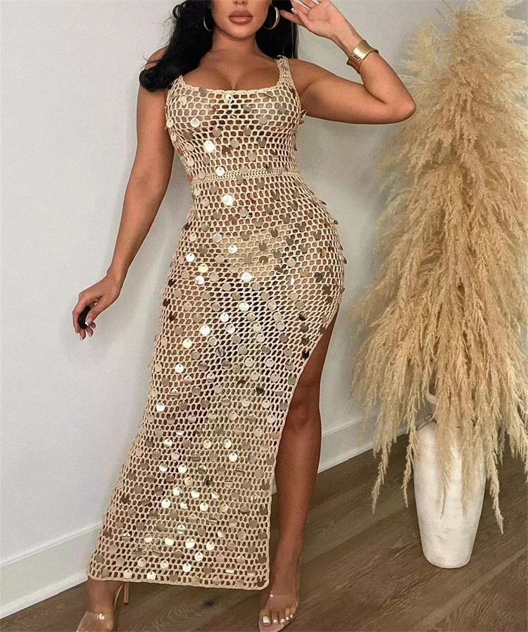 Sequined Patchwork Hand Knitted Tank Long Dress Women Sexy Hollow Out Sleeveless Side High Split Summer Beach Robe Cover Up