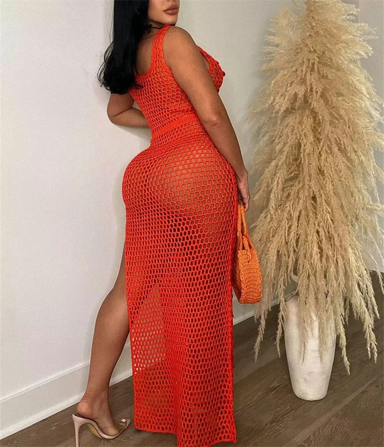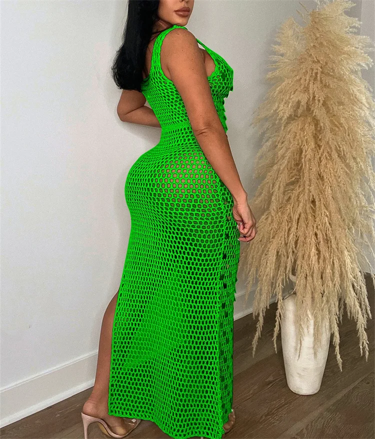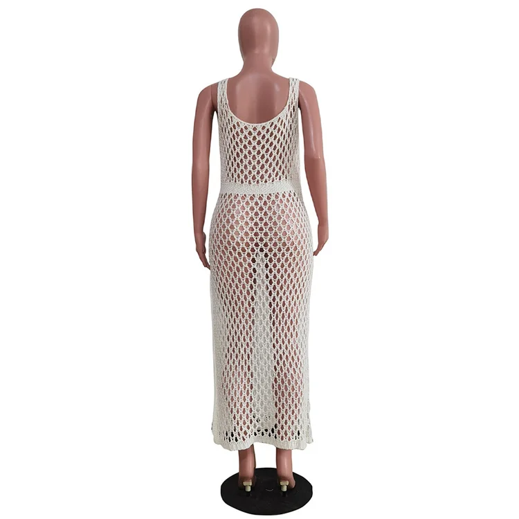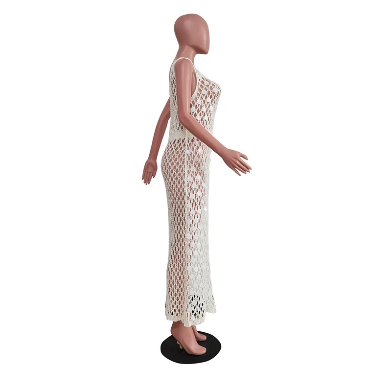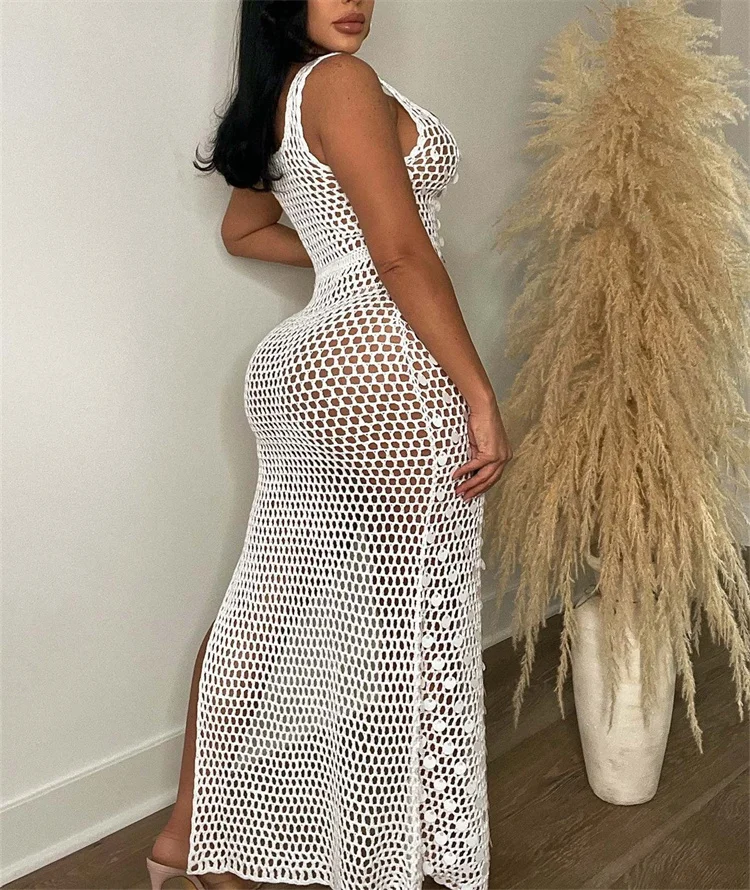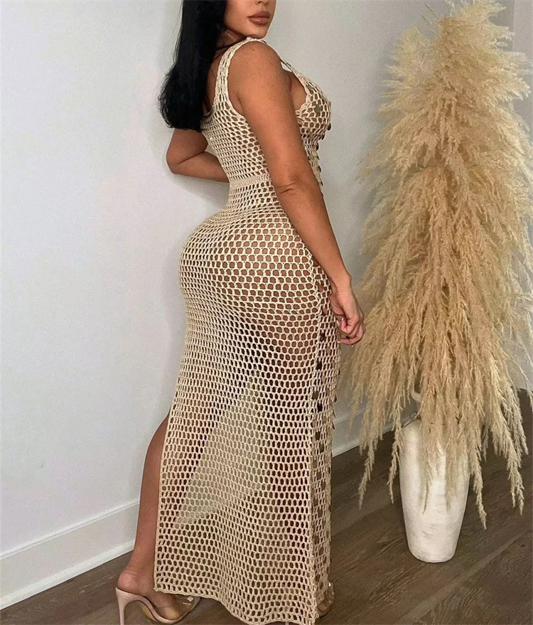 Sequined Patchwork Hand Knitted Tank Long Dress Women Sexy Hollow Out Sleeveless Side High Split Summer Beach Robe Cover Up