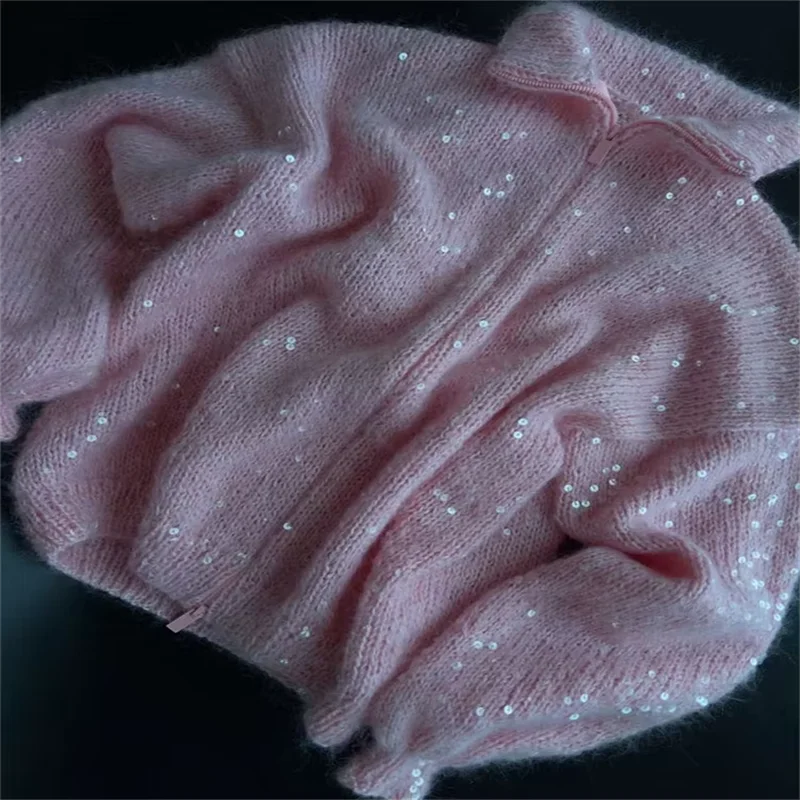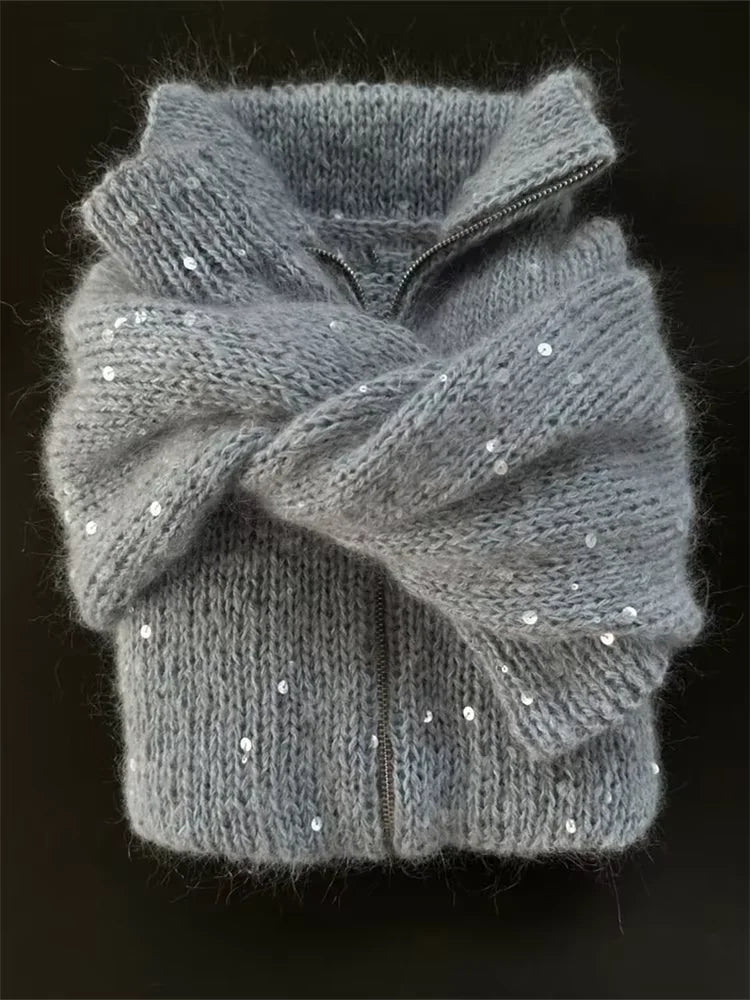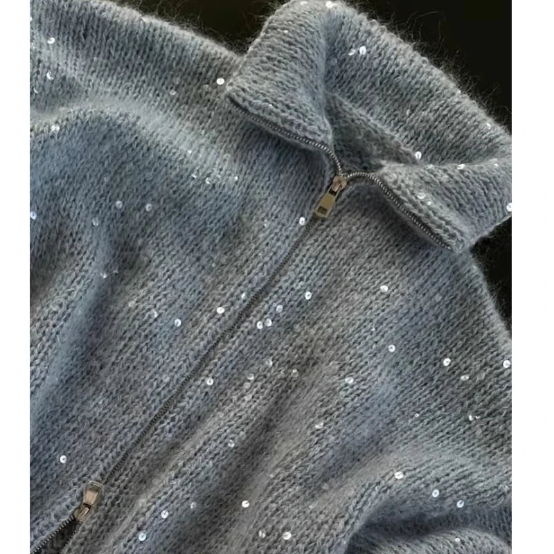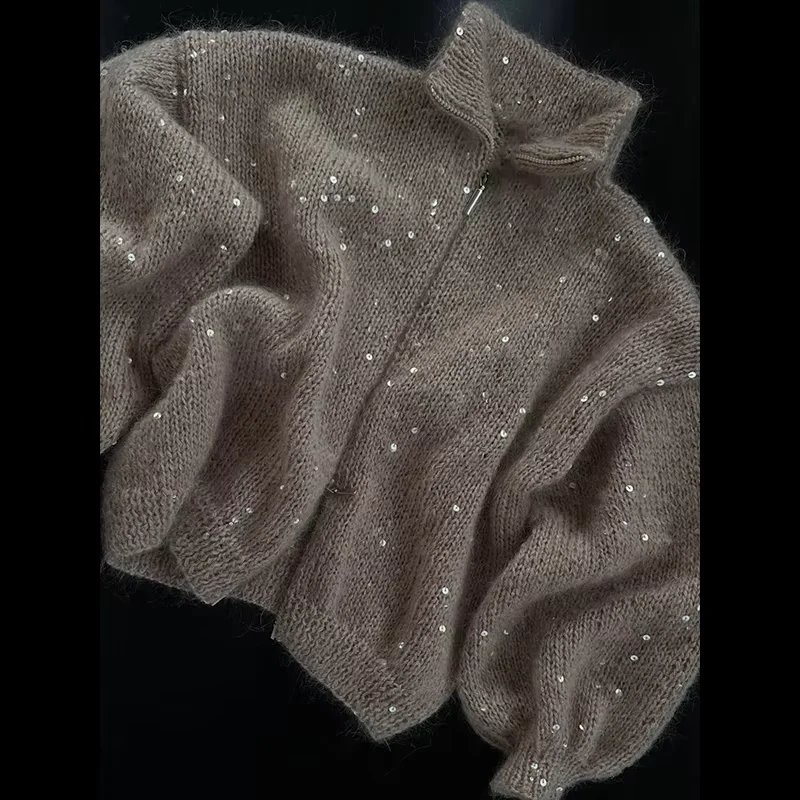 Sequins Knit Women 's Sweater Elegant Stand Collar Y2k Full Sleeve Sweaters Lady 2025 New Autumn Winter Woman Jacket Knitwear