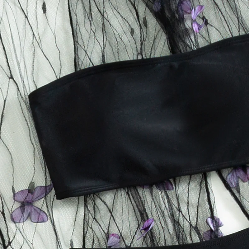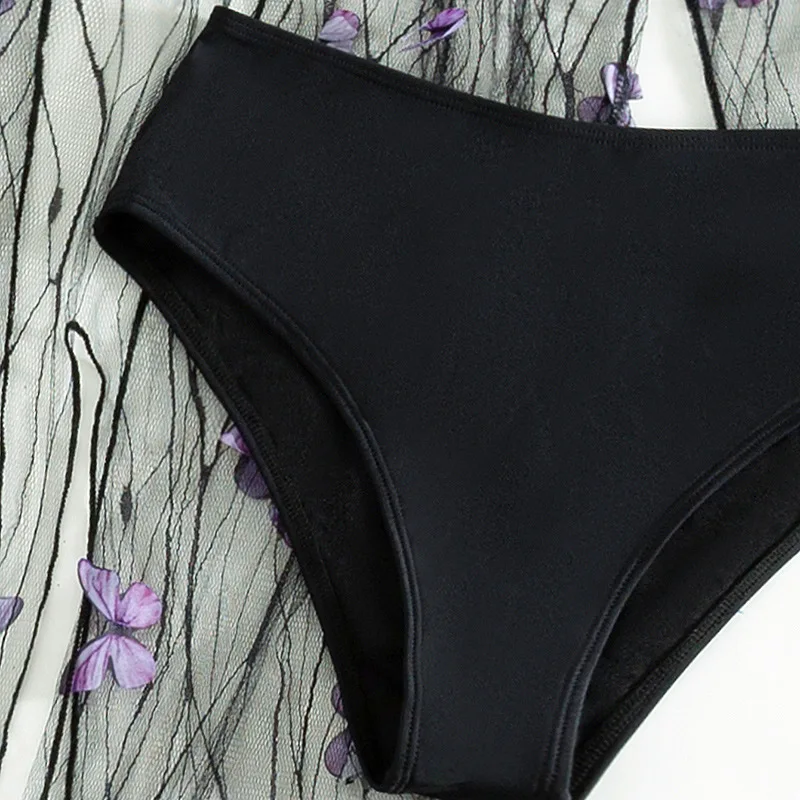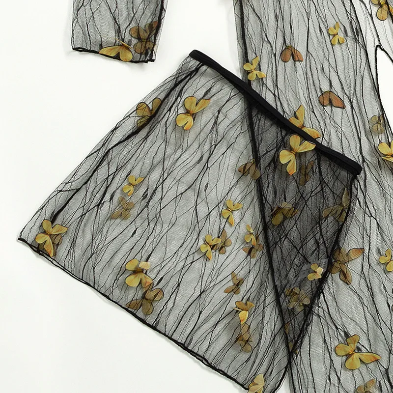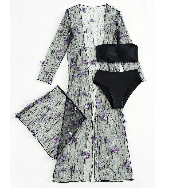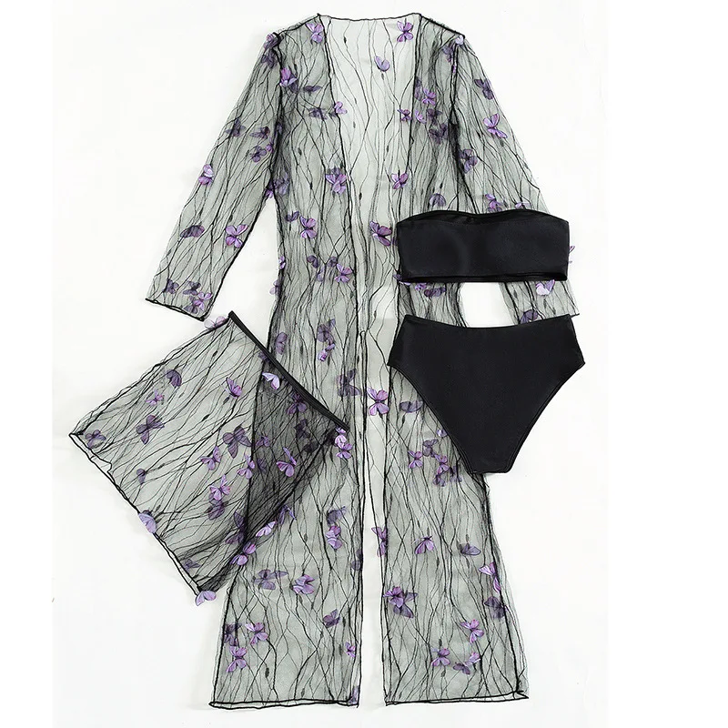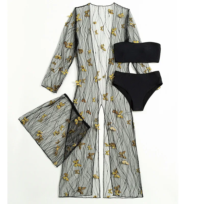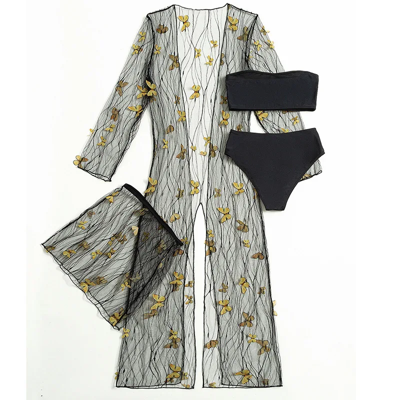 Sexy beach cover ups dress for women beachwear summer butterfly sheer thong swimsuit 4 pieces set