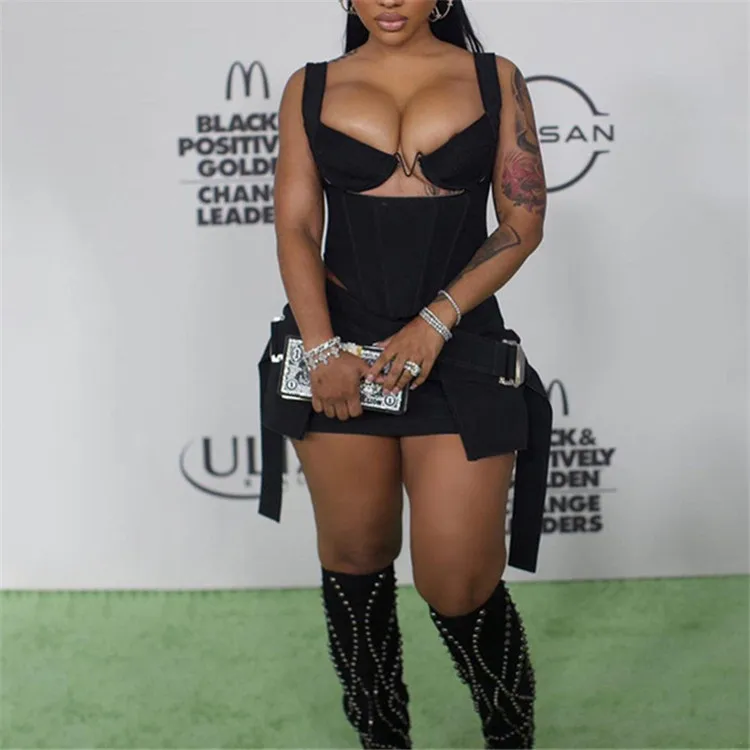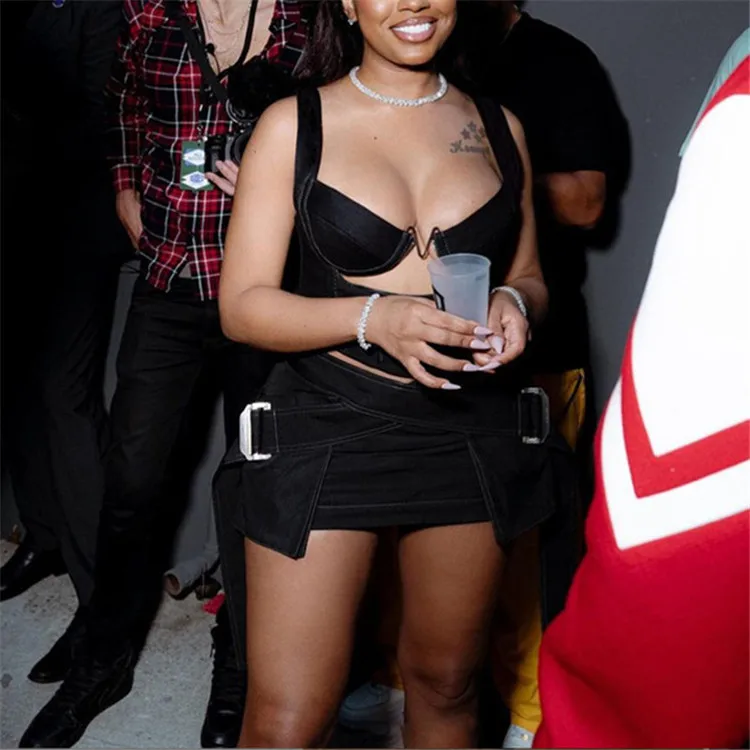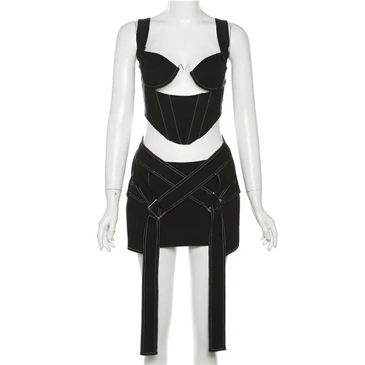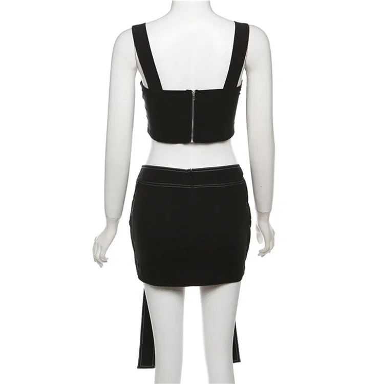 Sexy Black Bodycon 2 Two Piece Skirt Sets Night Club Outfits For Women 2024 Spring Hollow Out Tank Tops Mini Skirt Sets