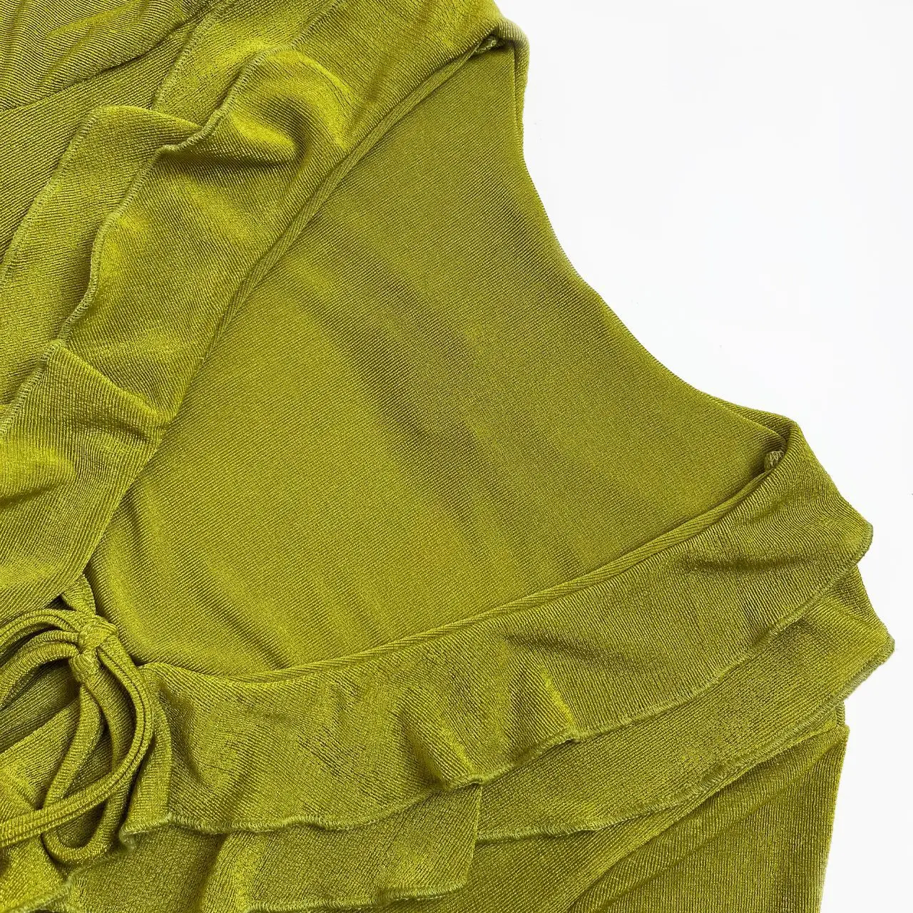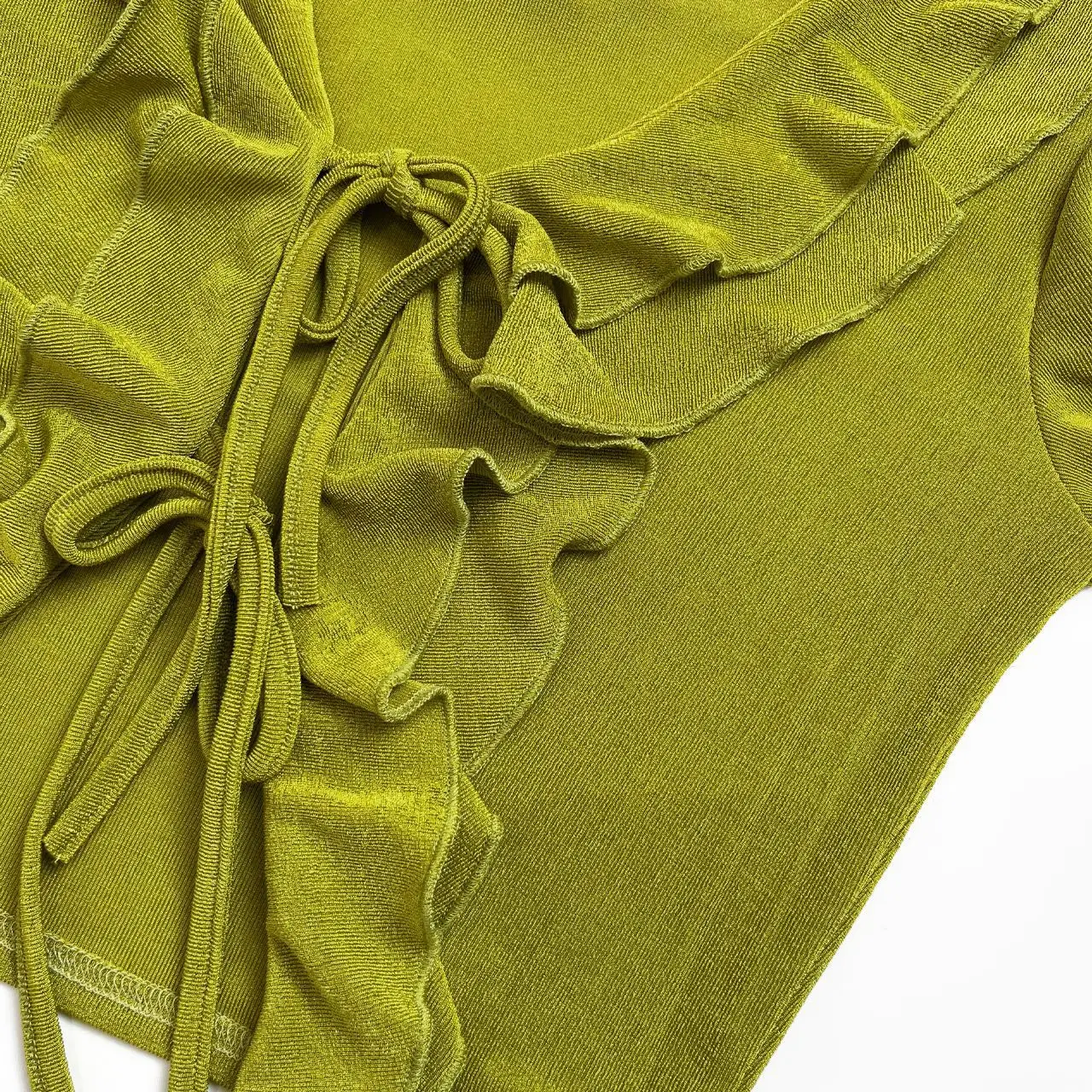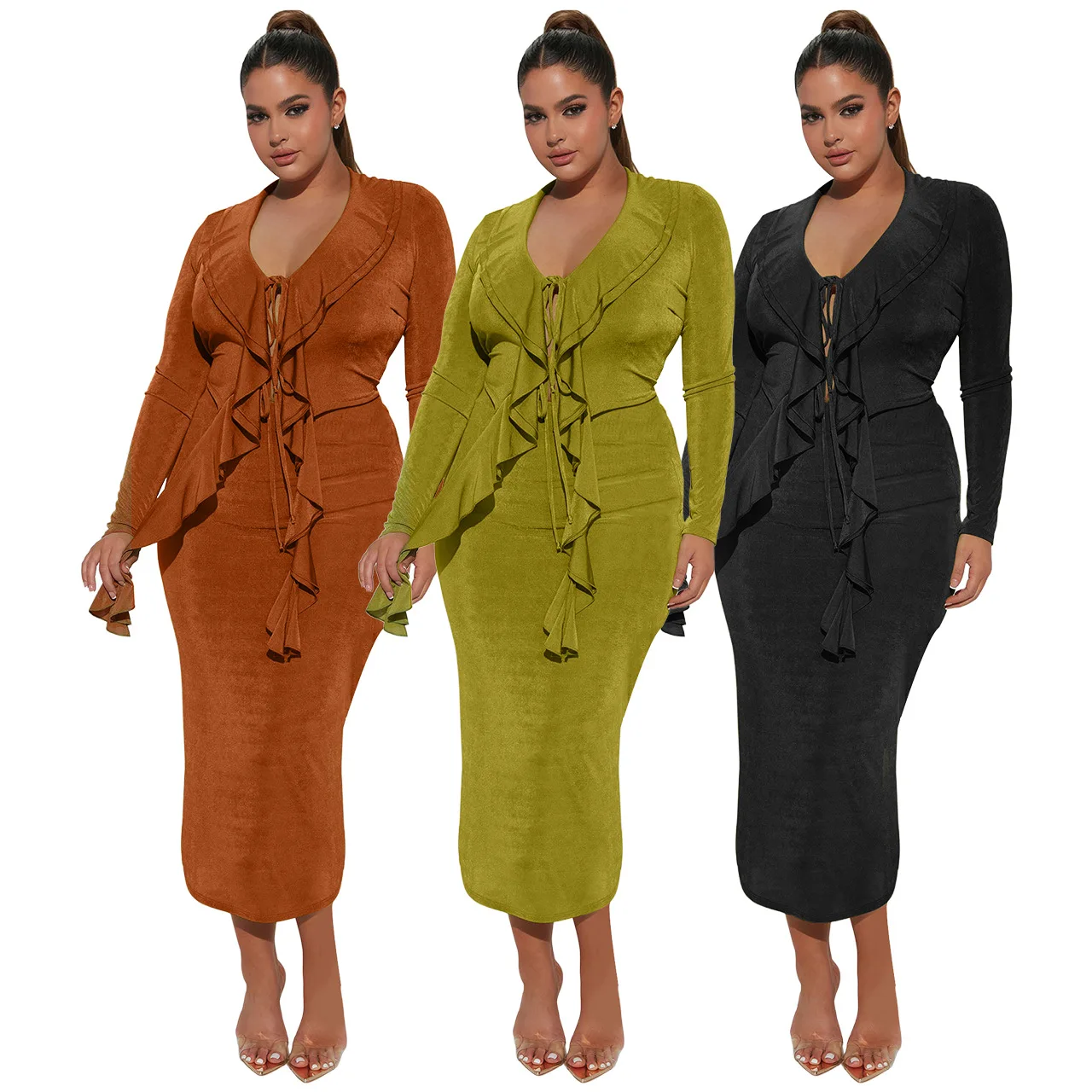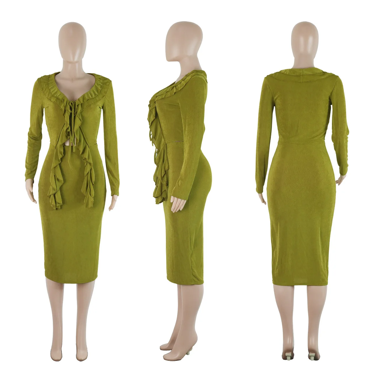 Sexy Bodycon Ladies Two Piece Skirt Outfit Long Sleeve 2 Piece Midi Skirt And Ruffle Lace Up Top Suit Set For Women