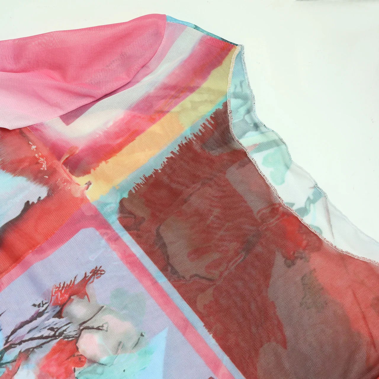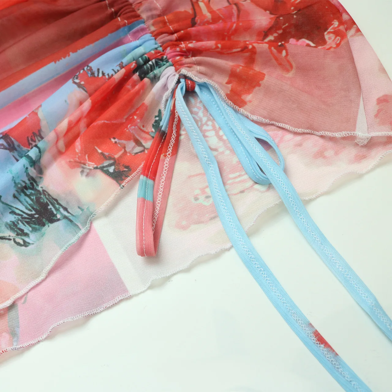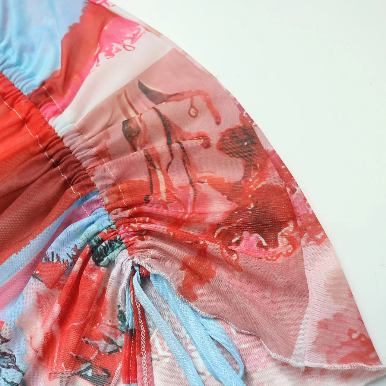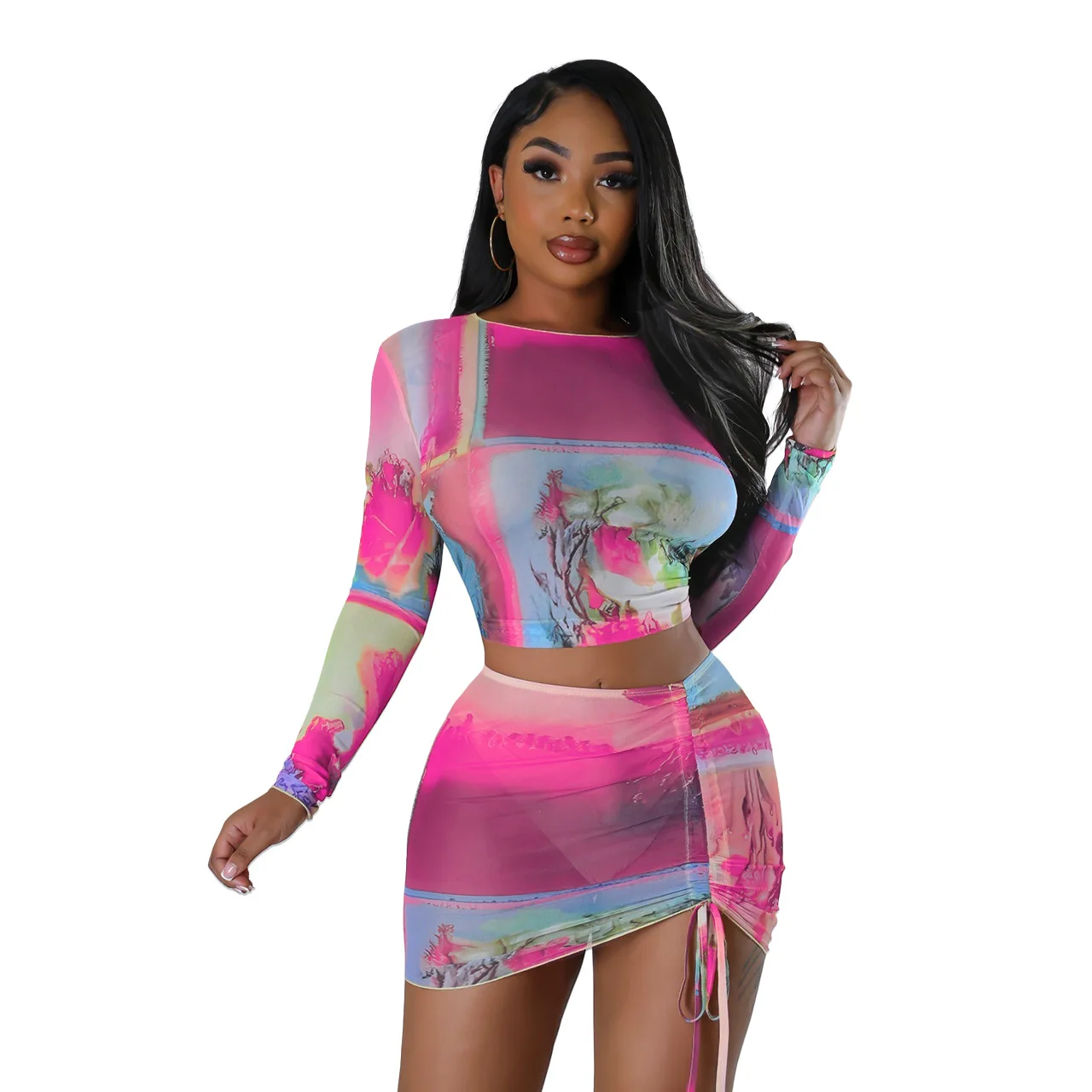 Sexy Bodycon Print Ladies Mesh Two Piece Skirt Outfit Long Sleeve 2Piece Short Skirt And Crop Ruffle Top Suit Set For Women