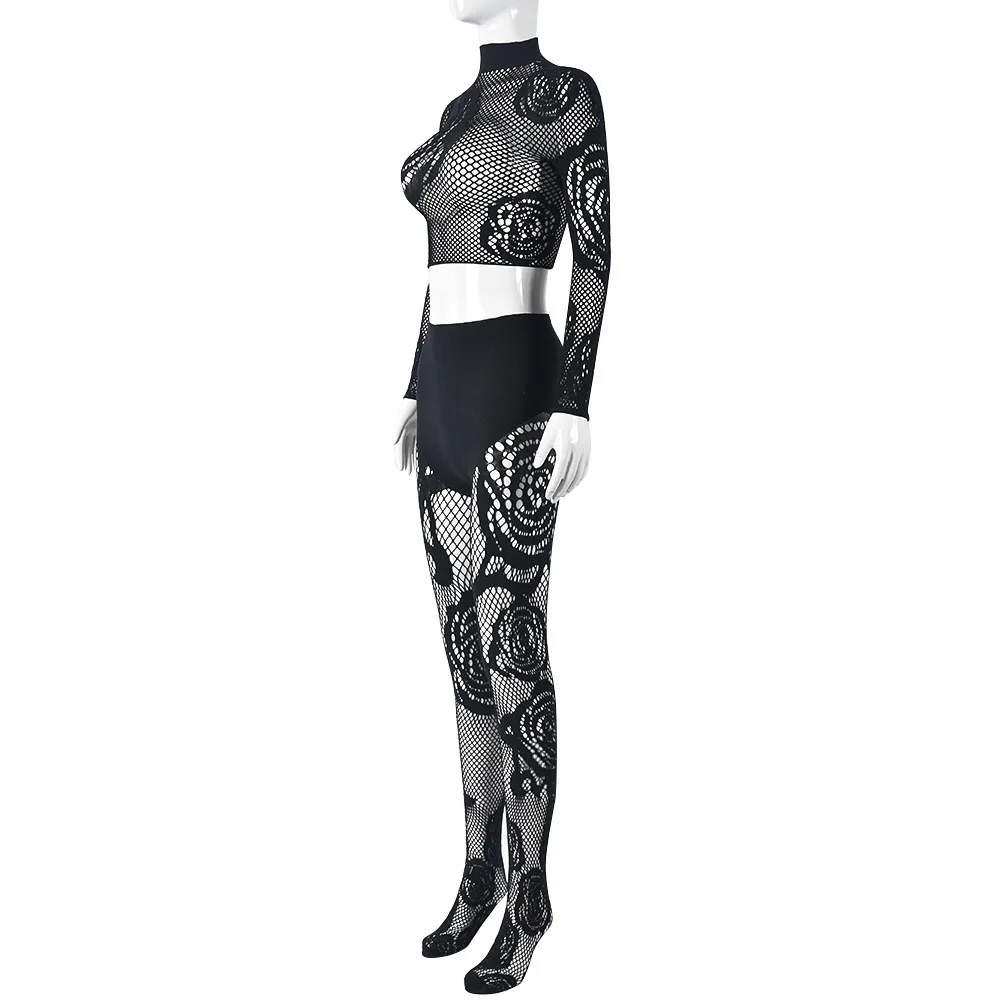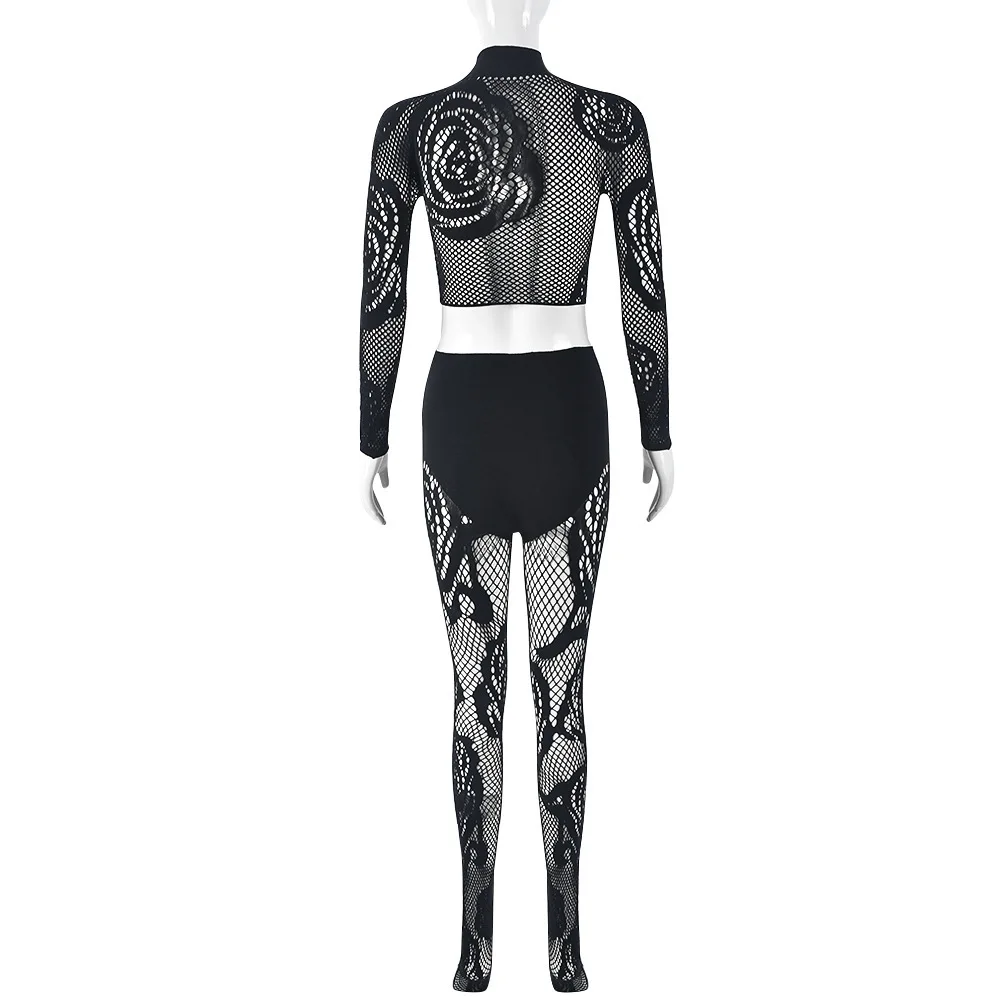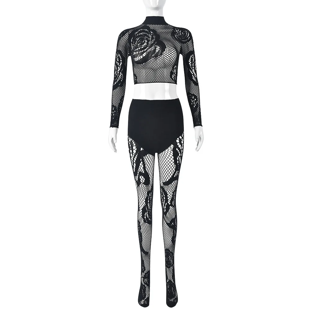 Sexy Bodycon Stretch Mesh See Through Crop Top And Leggings Set Rose Pattern Women Two Piece Pant Set