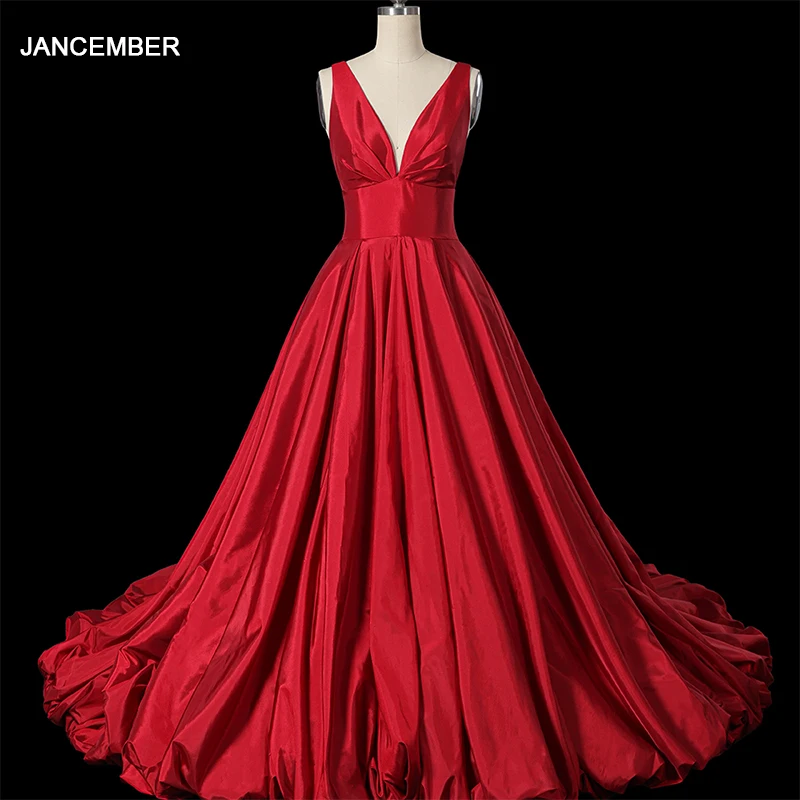 Sexy Deep V Neck Red Satin Zipper Back A Line Fold Floor Length Custom Handmade Evening Dress Lsdz91