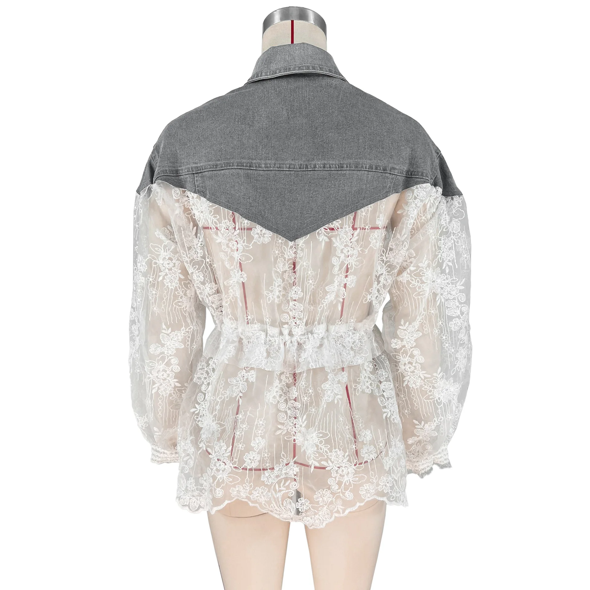 Sexy European and American women's denim patchwork embroidery mesh perspective shirt