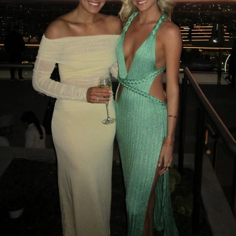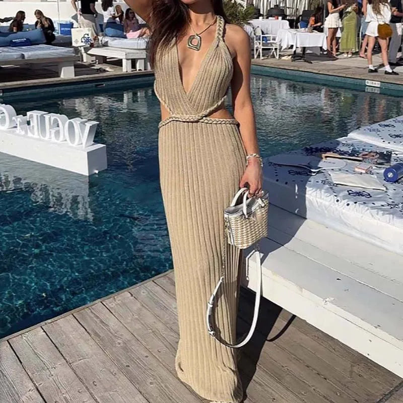 Sexy Hollow Out Sleeveless Knitted Long Dress Ladies 2025 V Neck Solid Slim Fit Summer Maxi Dress Elegant High Split Beach Dress