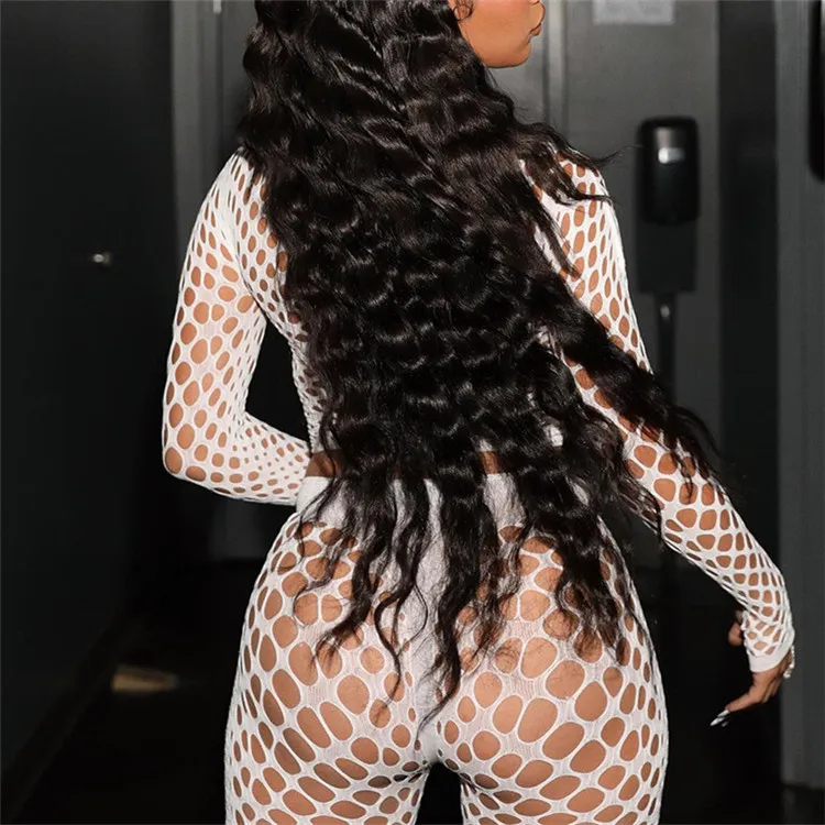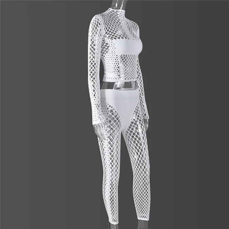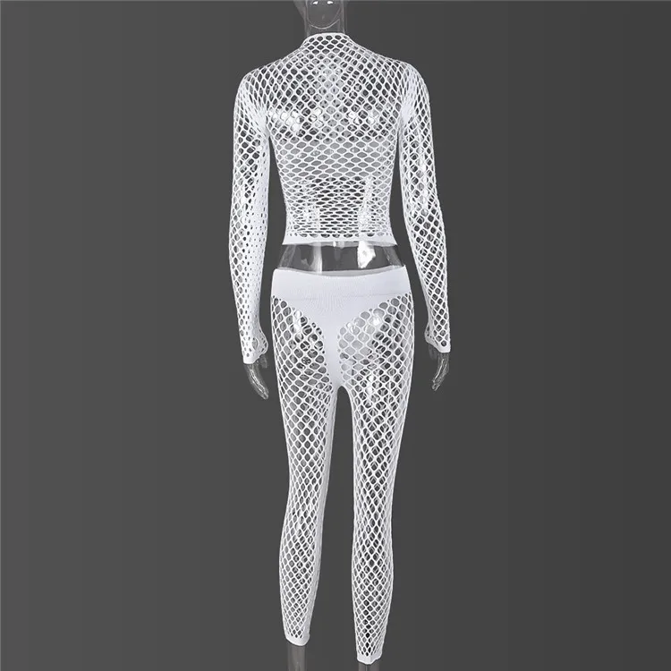 Sexy Hollow Out Two Piece Sets Night Club Outfits For Women 2024 Spring Long Sleeve See Through Crop Top Pants Sets