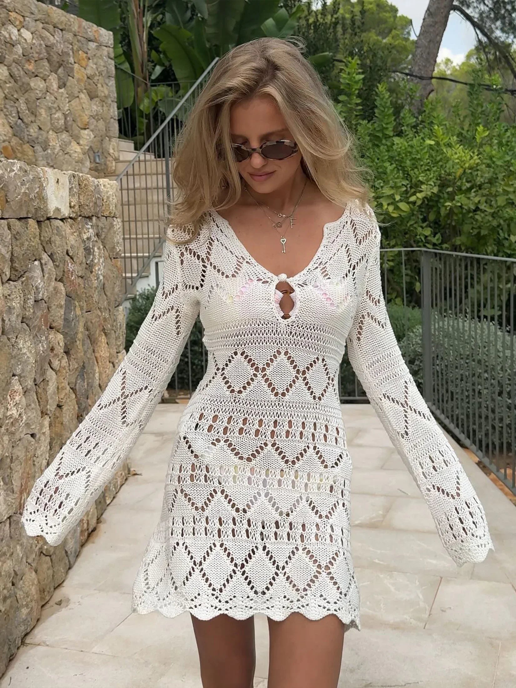 Sexy Knit Hollow Out V Neck White Slim Ruffled Edge Long Sleeve Beach Mini Dress 2025 New Women Vacation Swimsuit Cover Up K241