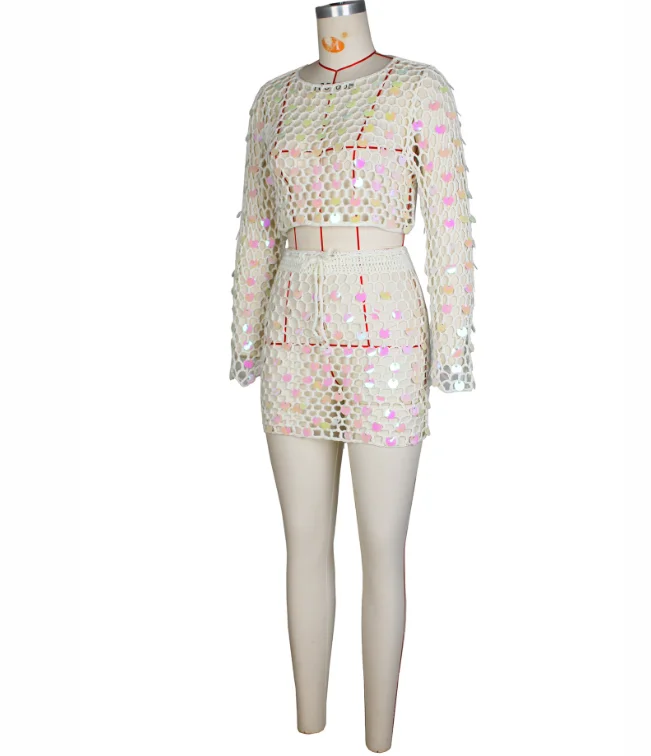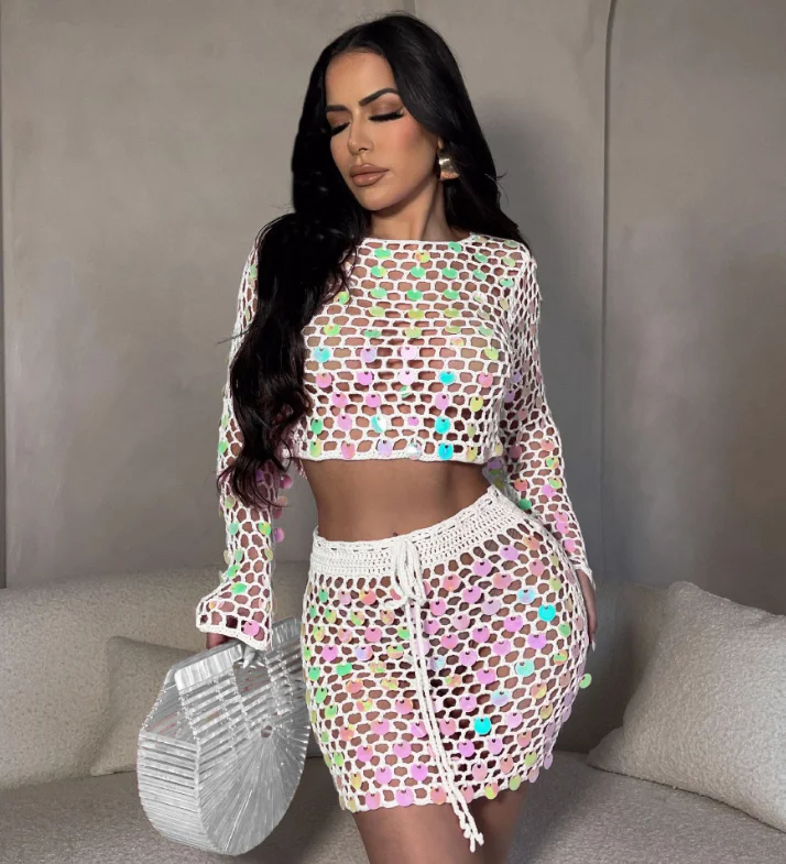Sexy Knitted Mini Skirt Outfits Summer 2024 Fashion Long Sleeve Crop Top Skirt Suits Women Chic Handmade Crochet Sequin Two Piece Beach Skirt Set
