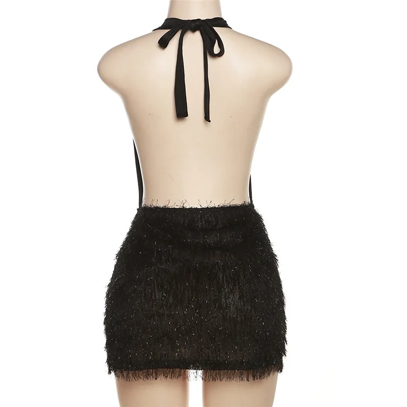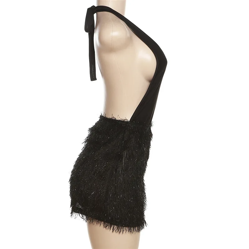 Sexy Lace Up Halter Deep V Sleeveless Bodycon Mini Dress Fluff Asymmetrical Solid Skinny Slim Dress