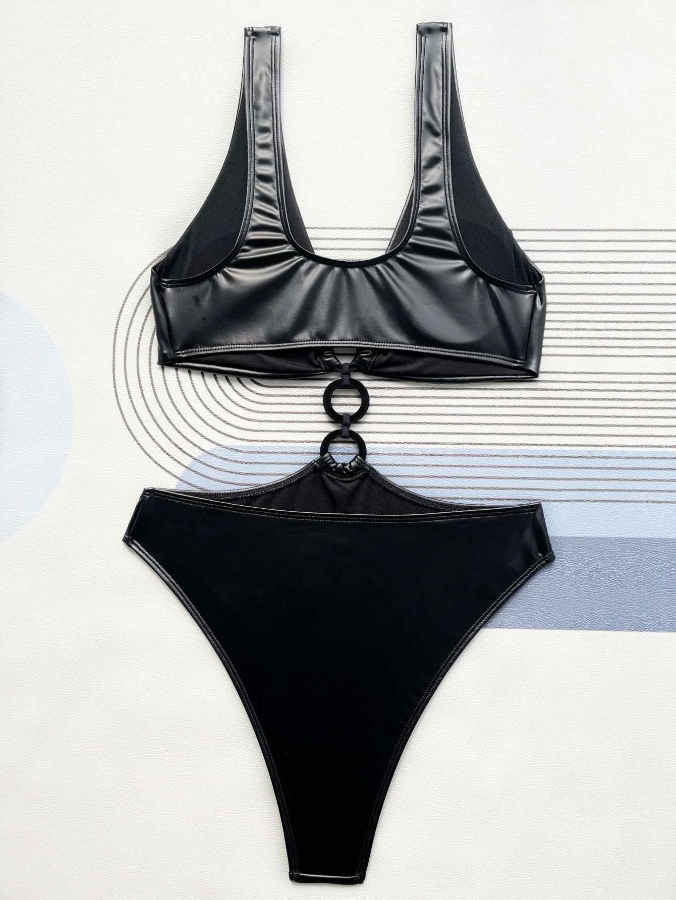Sexy Rtero High Waist Swimwear for Women PU Leather One Piece Swimsuit 2023 Backless Bathing Suit Push Up Monokini