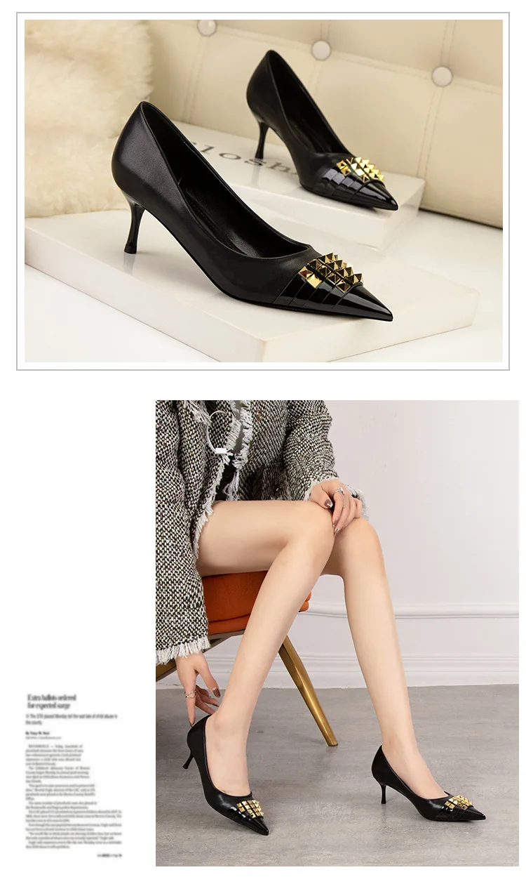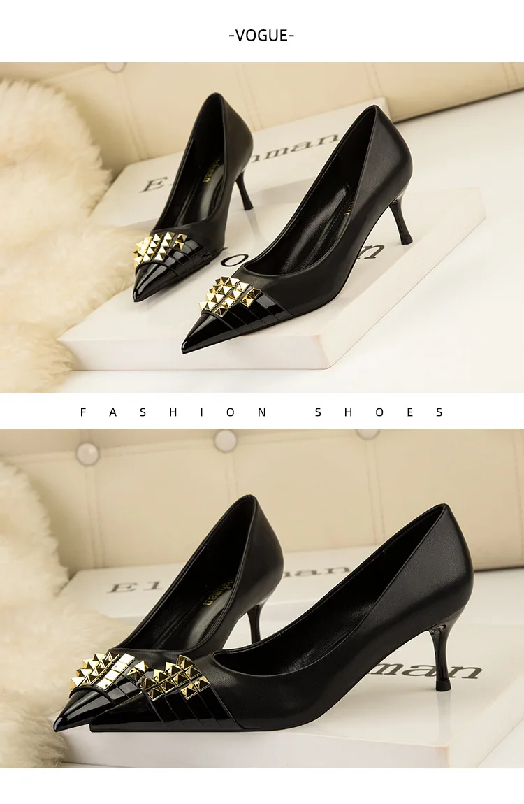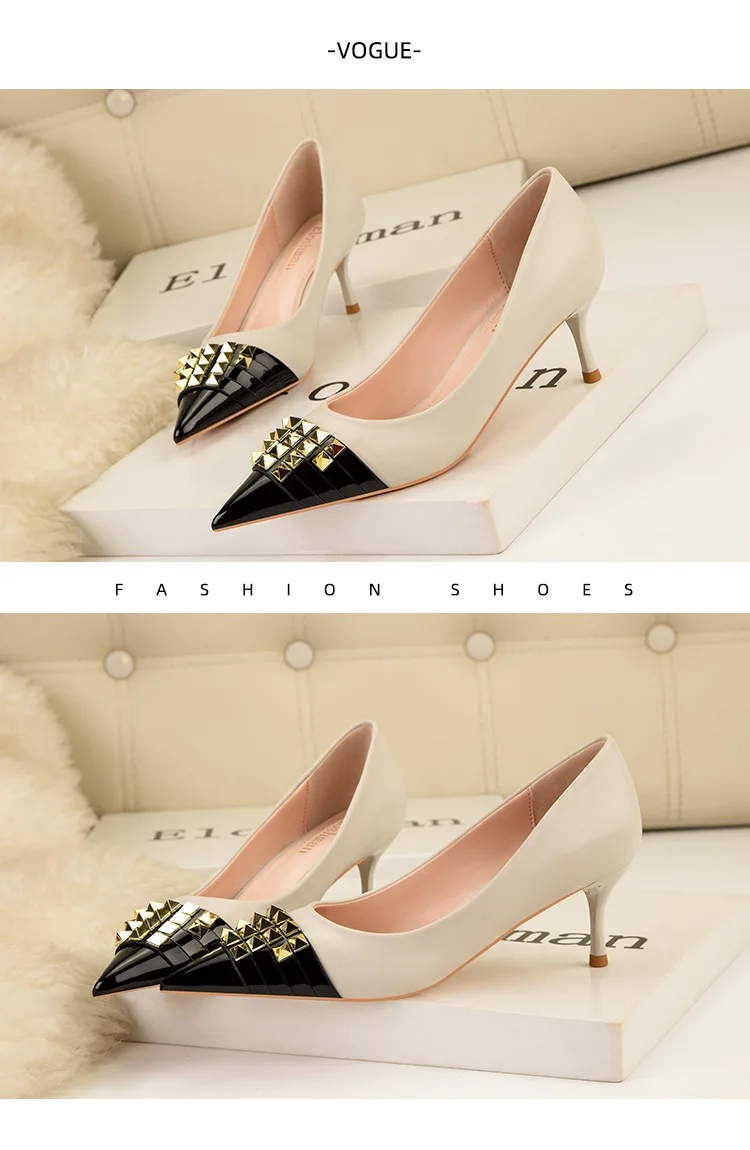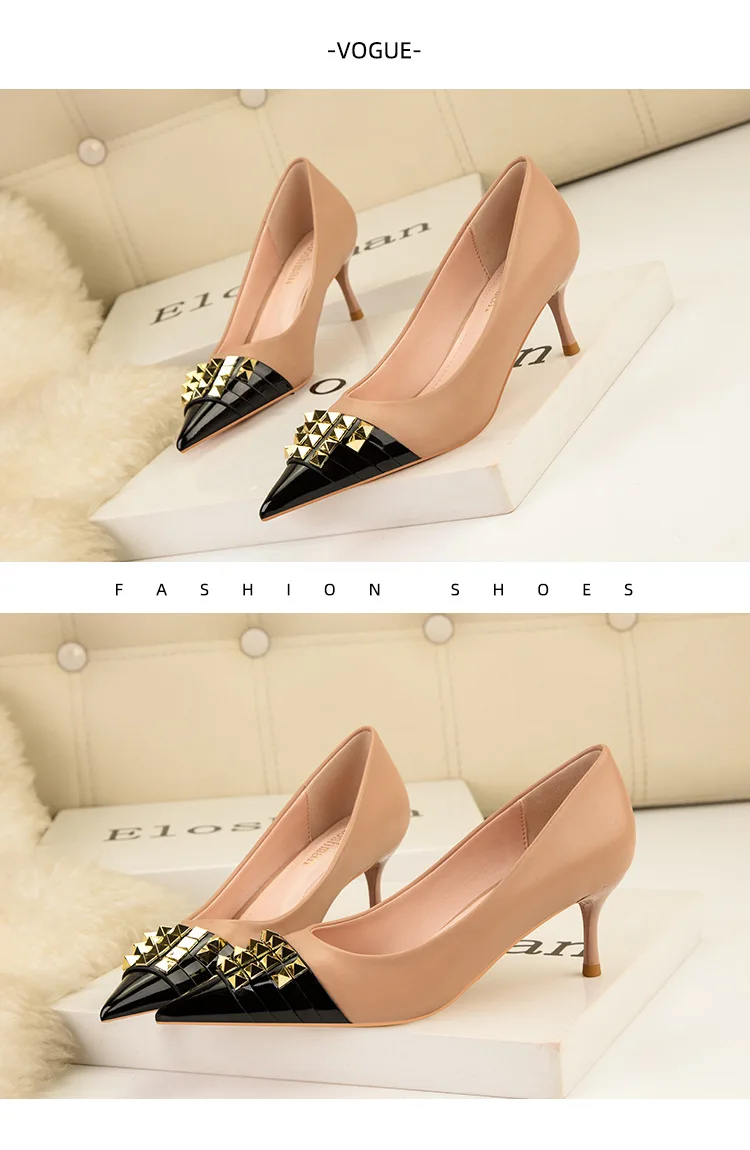 Sexy Slim High Heels Shoes Women Shoes Ladies Pump Shoes Thin Heels Shallow Pointed Rivet Ladies PU Rubber Solid Peep-toe Pumps