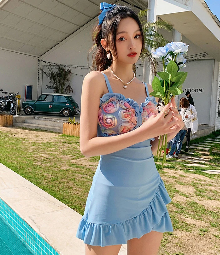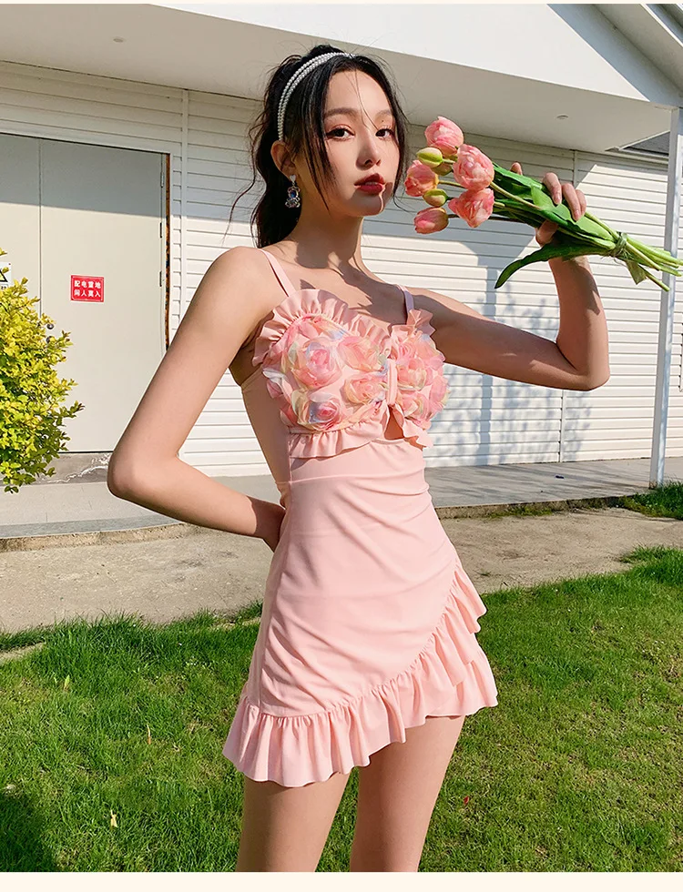 Sexy Solid Slimming Effect Floral Bud One-Piece Swimsuit with Conservative Skirt Design swimsuit skirt