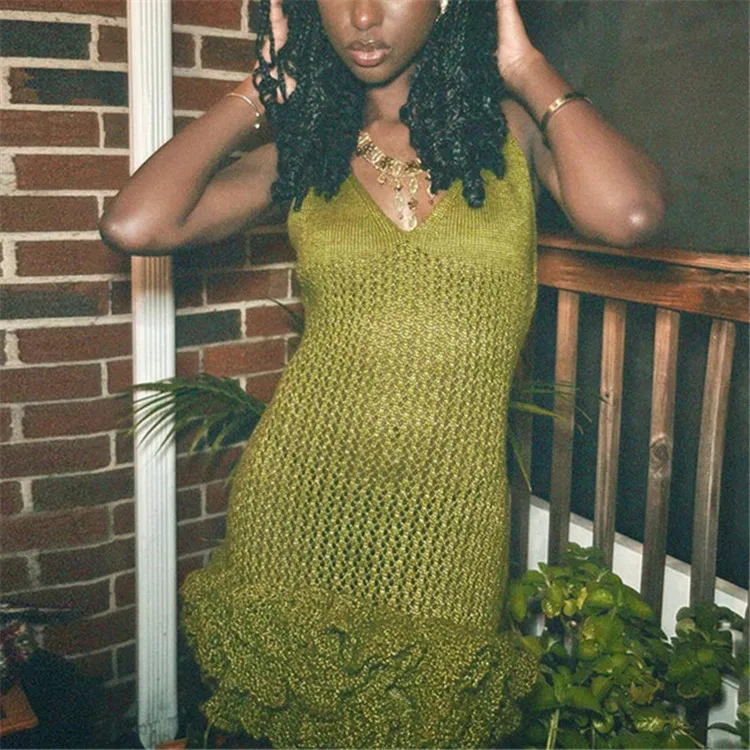 Sexy Spaghetti Strap V-neck Mini Dress Women Backless Knitted Ruched Ruffle Party Night Club Bodycon Dress