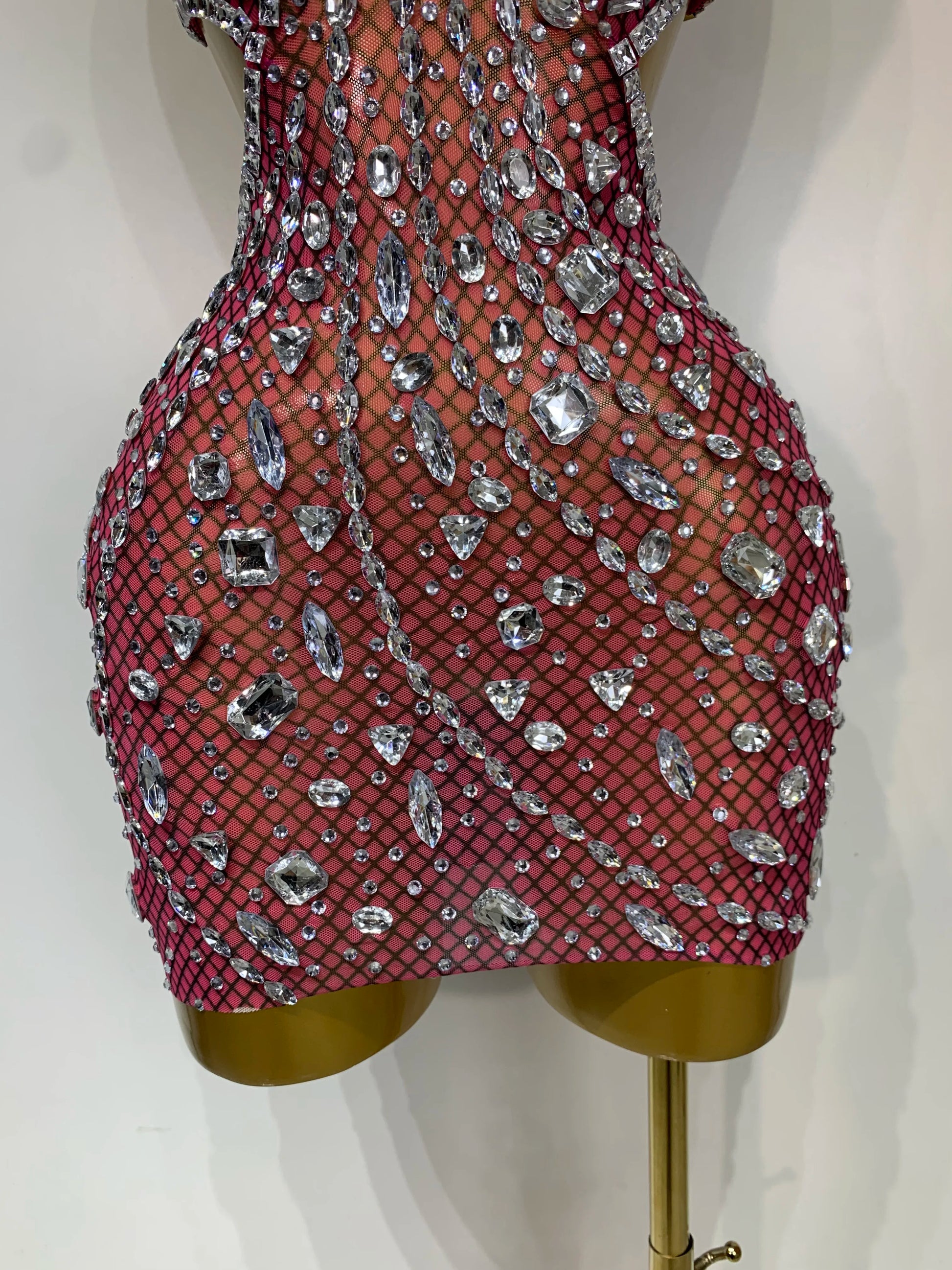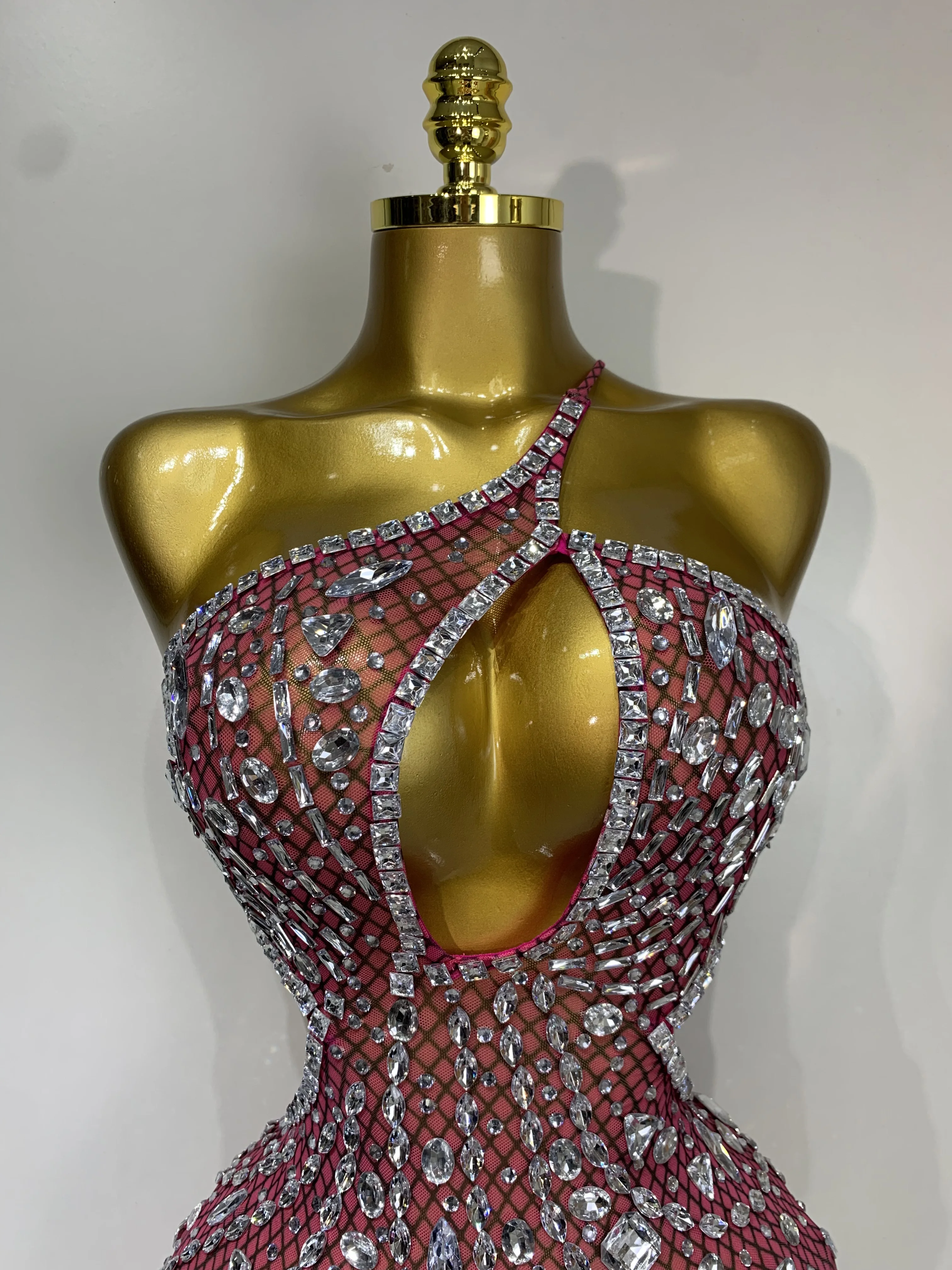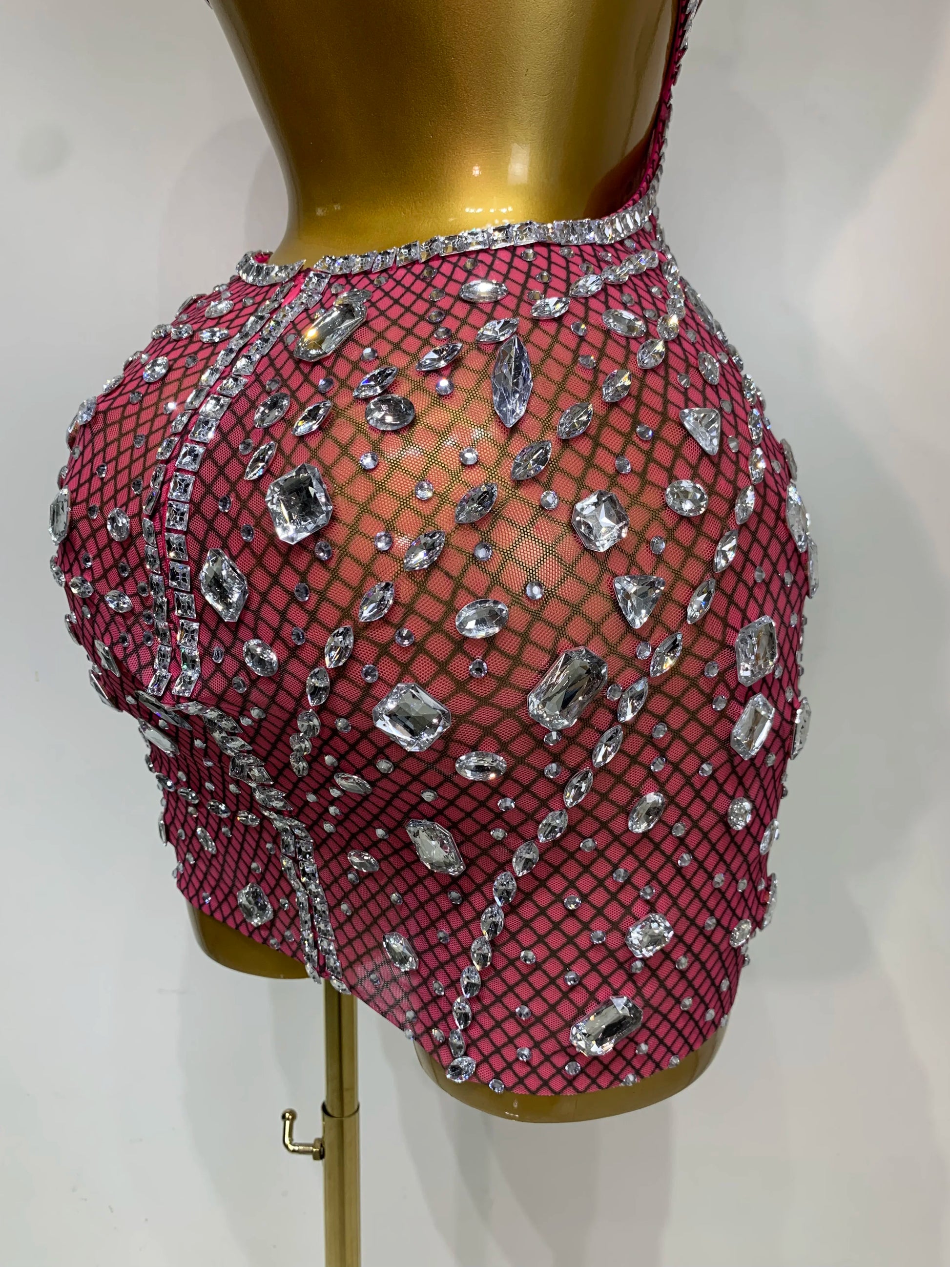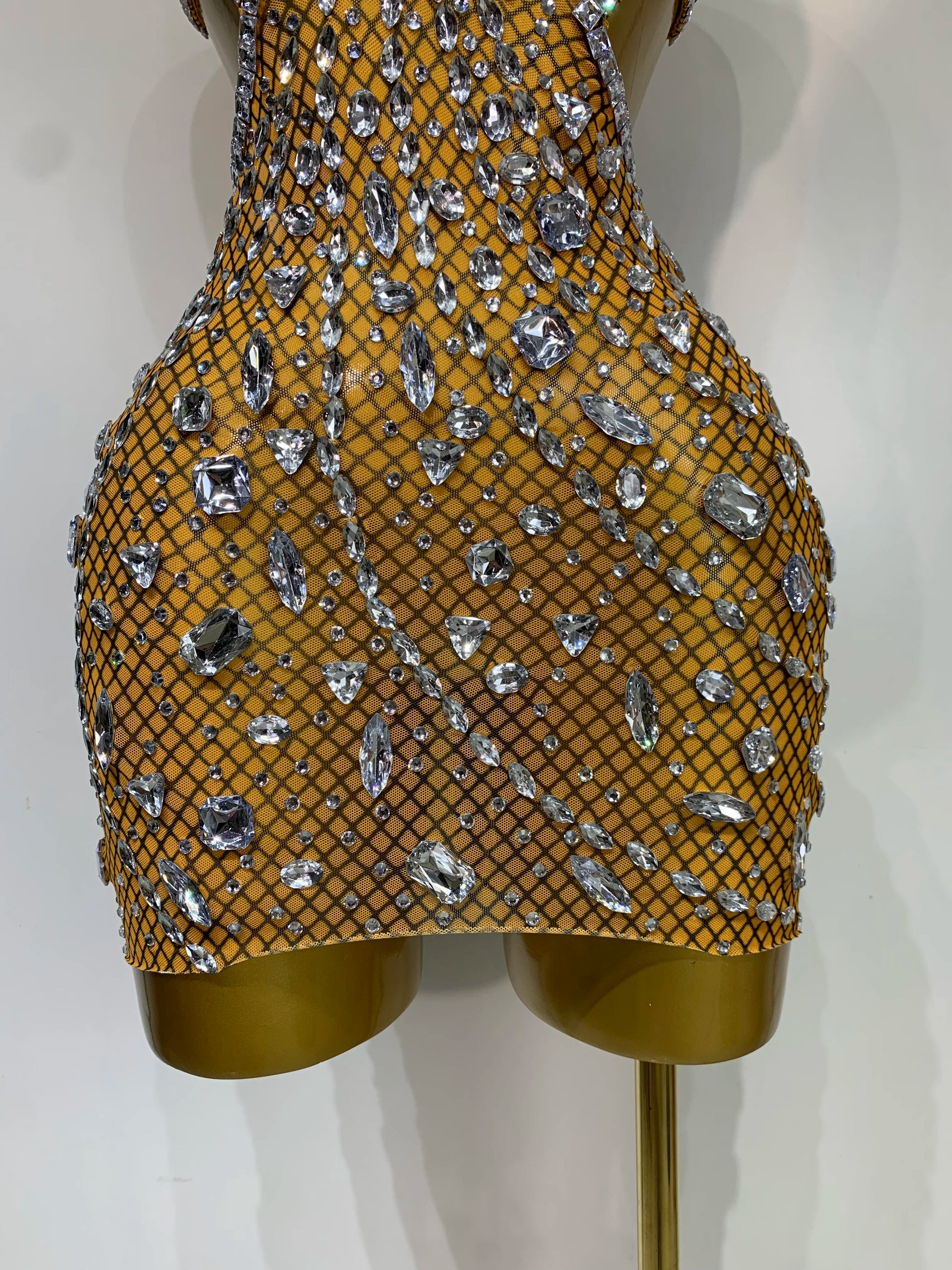Sexy Sparkly Diamond Backless Short Dress 2025 Women Sleeveless Mesh See Through Evening Birthday Gown Singer Stage Outfit