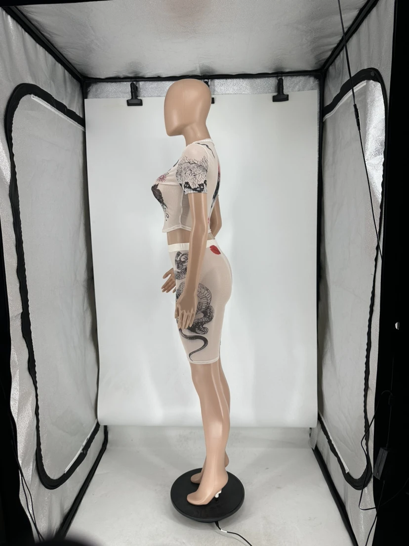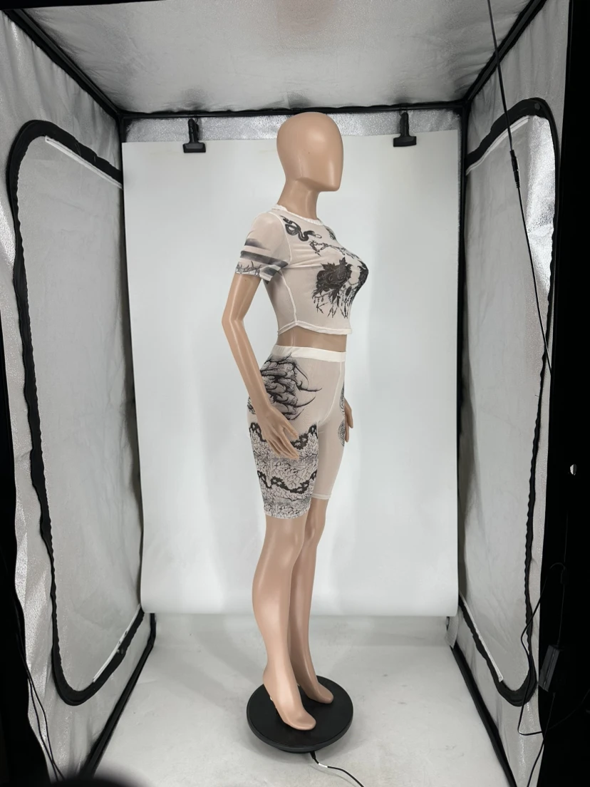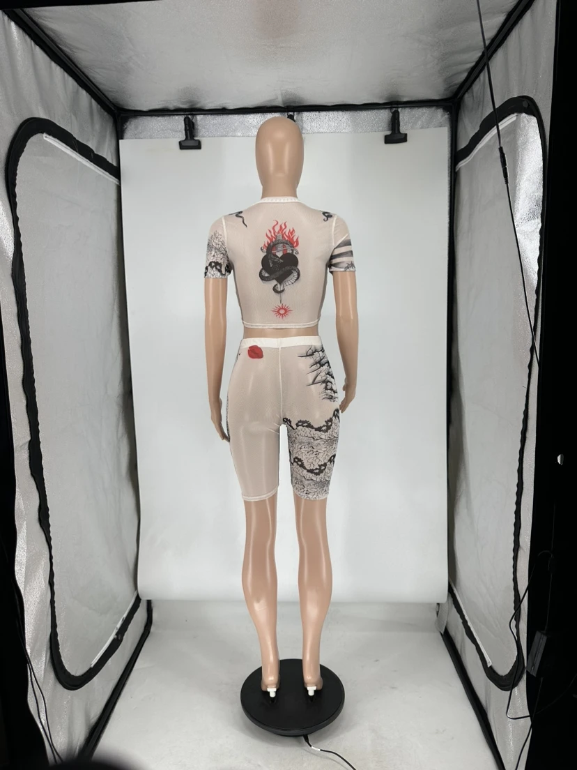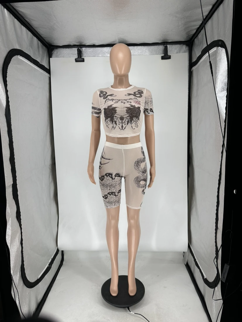 Sexy Summer Outfits for Woman 2024 Fashion Print See Through 2 Piece Set Hipster Crop Tops and Shorts Custom Two Piece Set Women