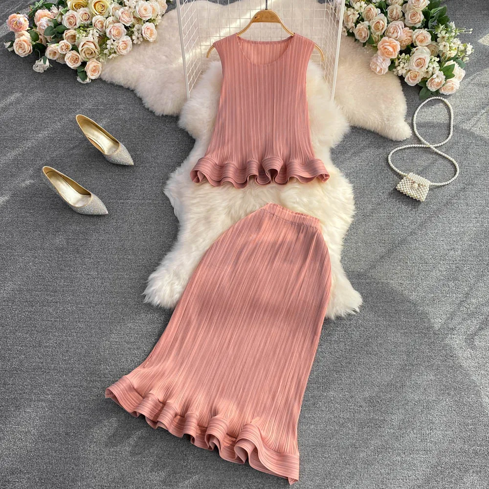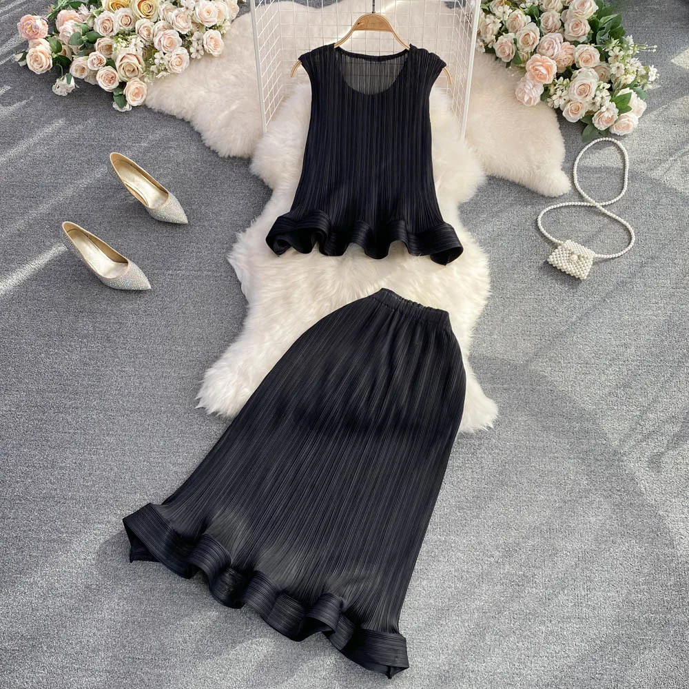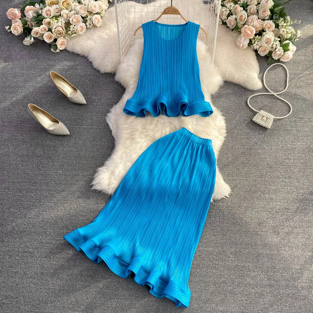 Sexy Summer Sleeveless Crop Top And Midi Pleated Skirt 2 Piece Set For Women