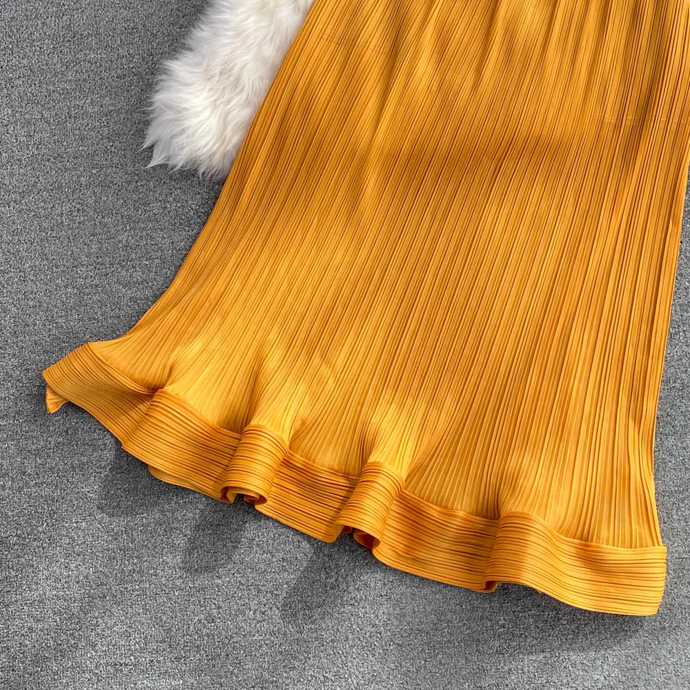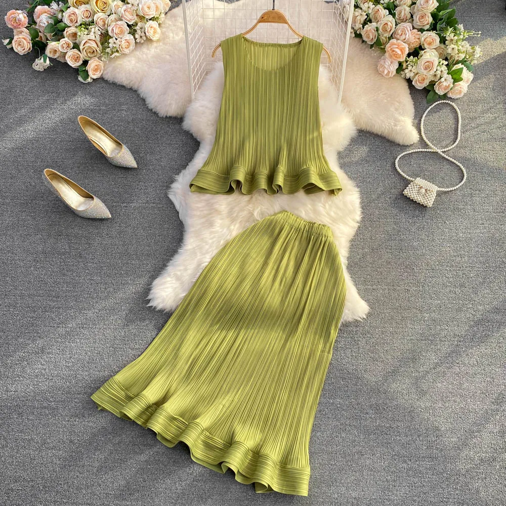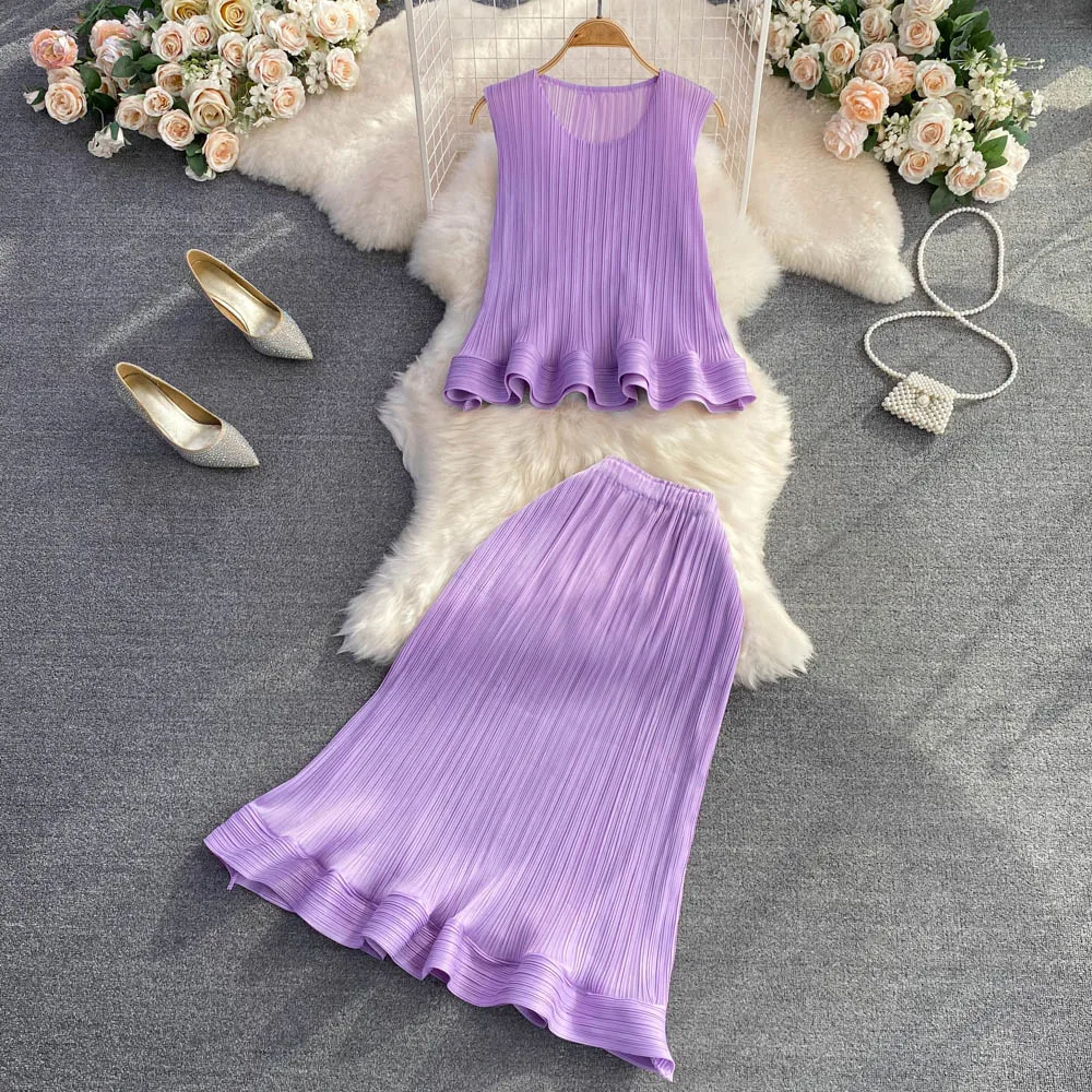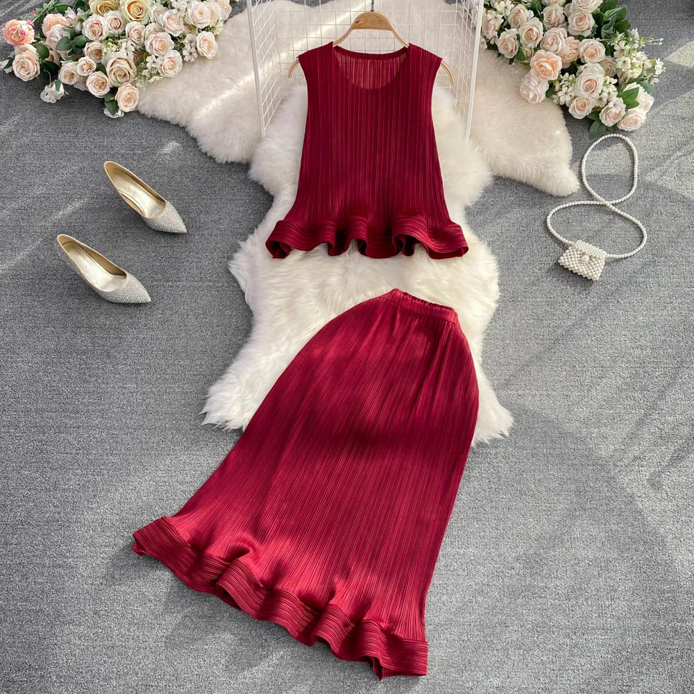 Sexy Summer Sleeveless Crop Top And Midi Pleated Skirt 2 Piece Set For Women