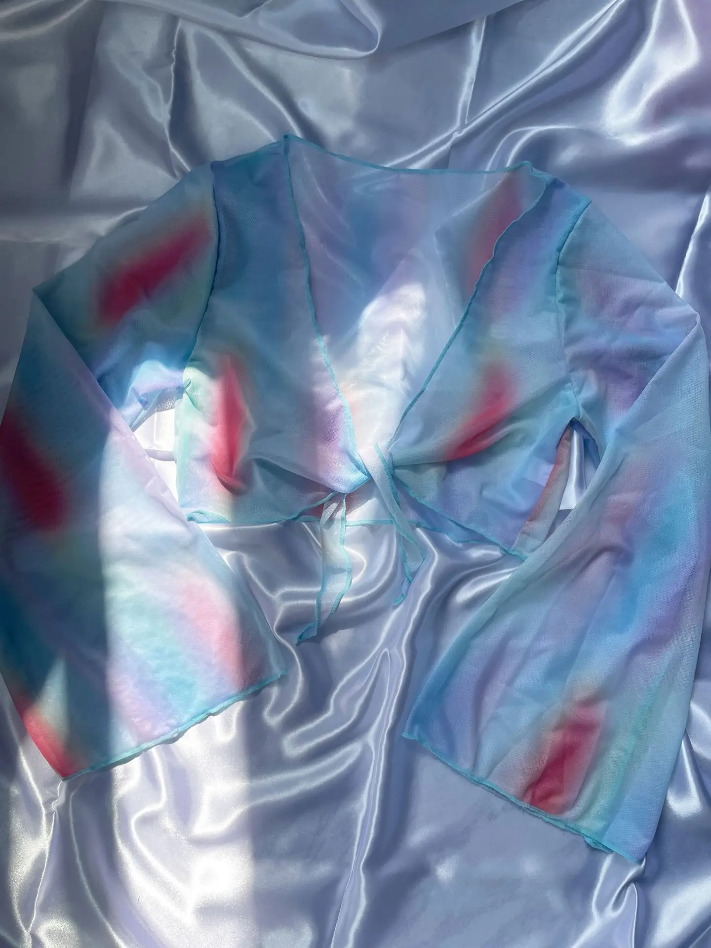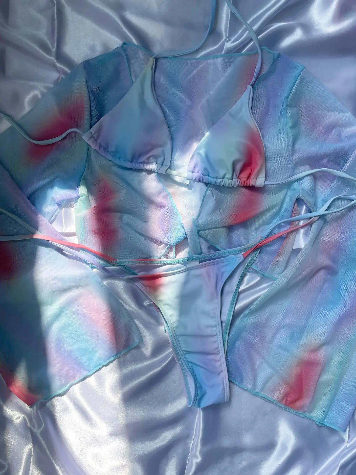 Sexy Tie Dye Gradient Swimwear 2023 Women Long Sleeve Mesh Cover Up 3 Piece Swimsuit Bathing Suit Tie Side Thong Bikini Lady