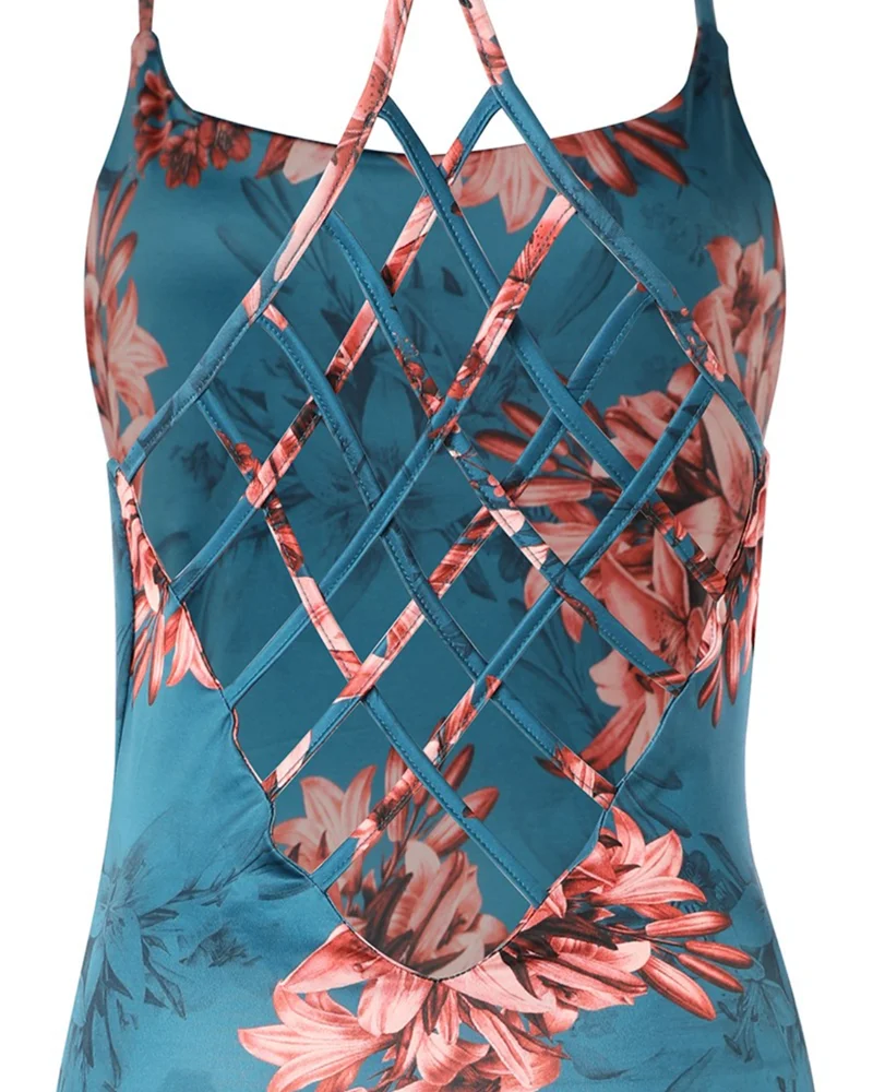 Sexy Women Summer Floral Print Fishnet Backless Bodycon Dress U-Neck Slim Fit Spaghetti Strap Midi Blue Dress Vacation Vestido