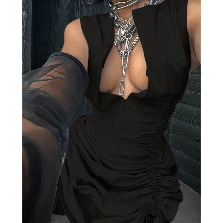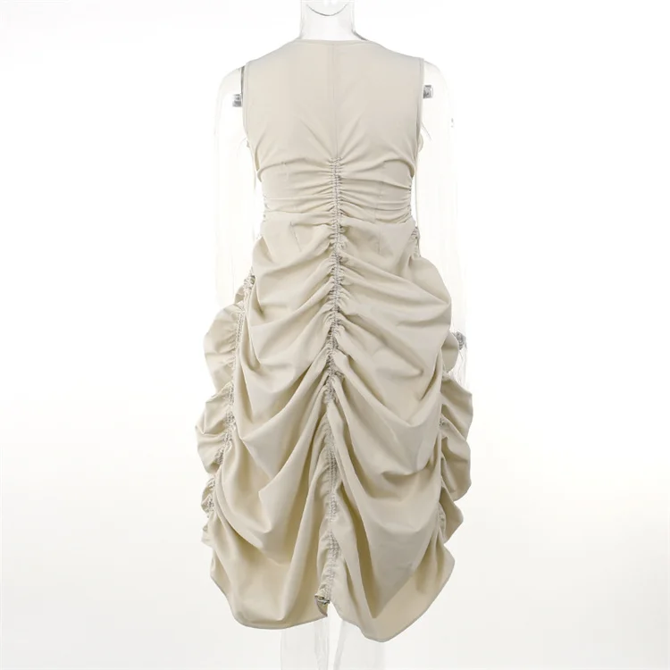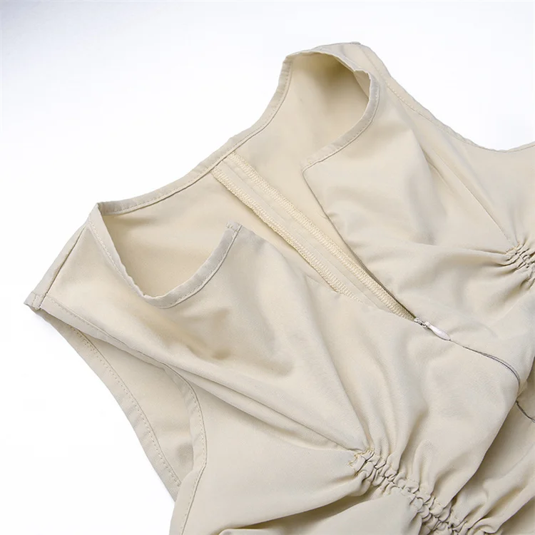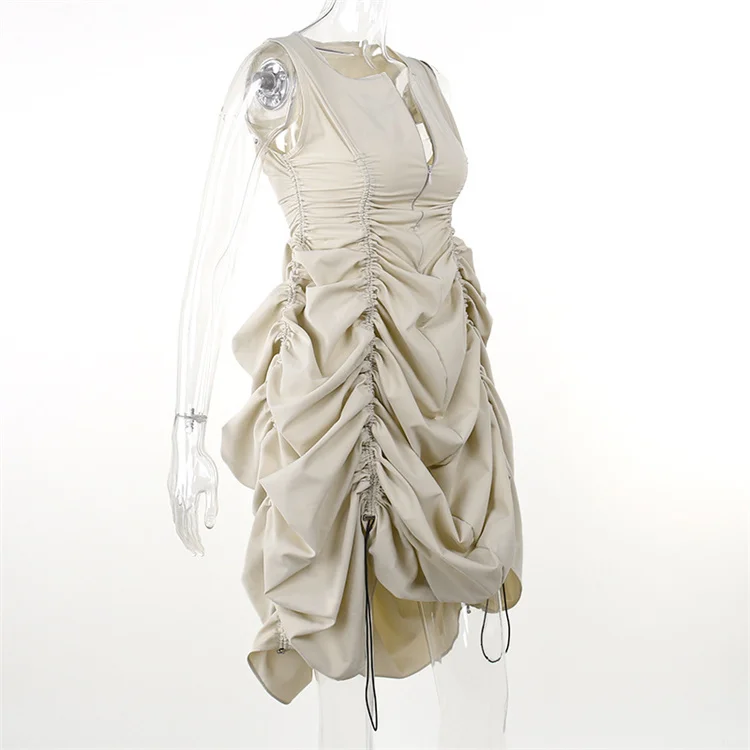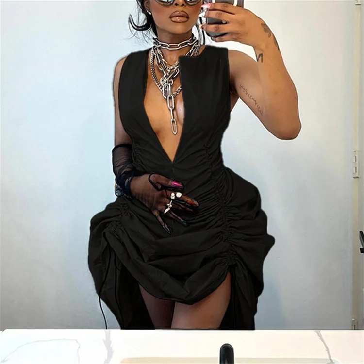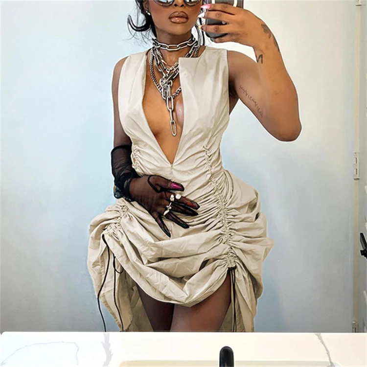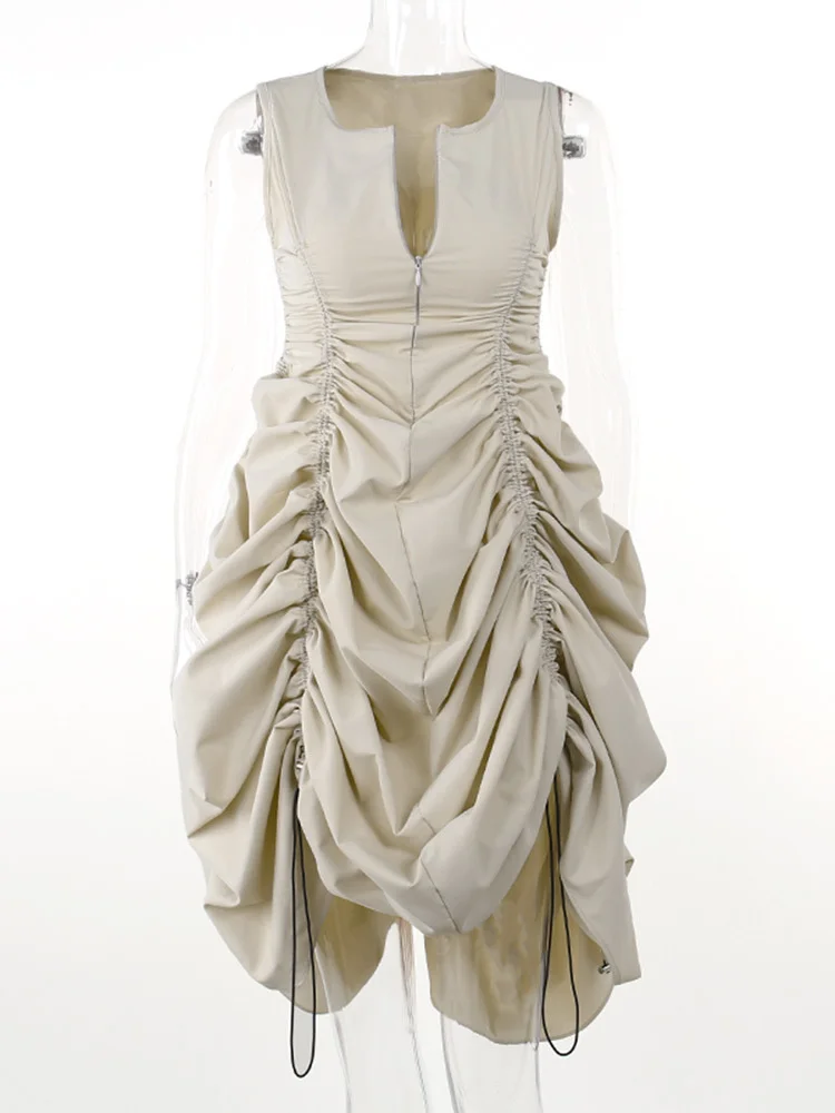 Sexy Zip Deep V Drawstring Puff Sleeveless Dress Folds Bodycon Women Casual Sleeveless Tank Dresses