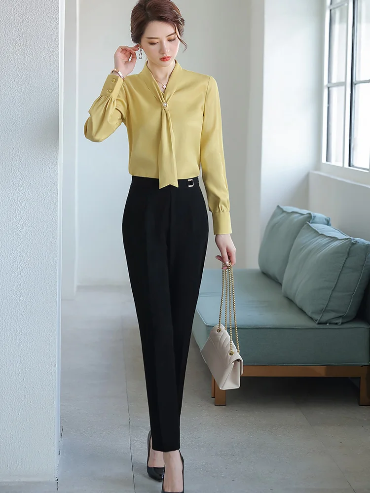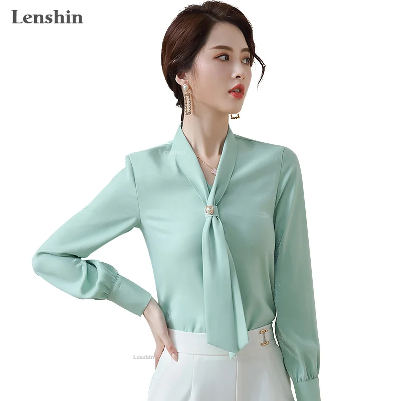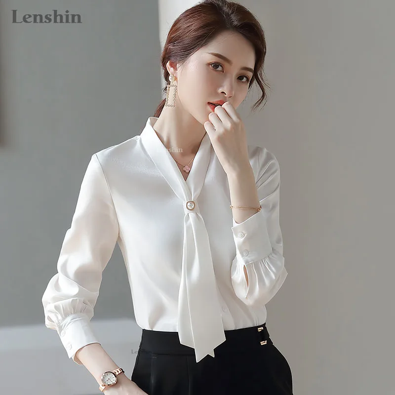 Shiny Fabric Shirts for Women V-neck Blouse with Bow Work Wear Office Lady Female Tops Chemise Loose style