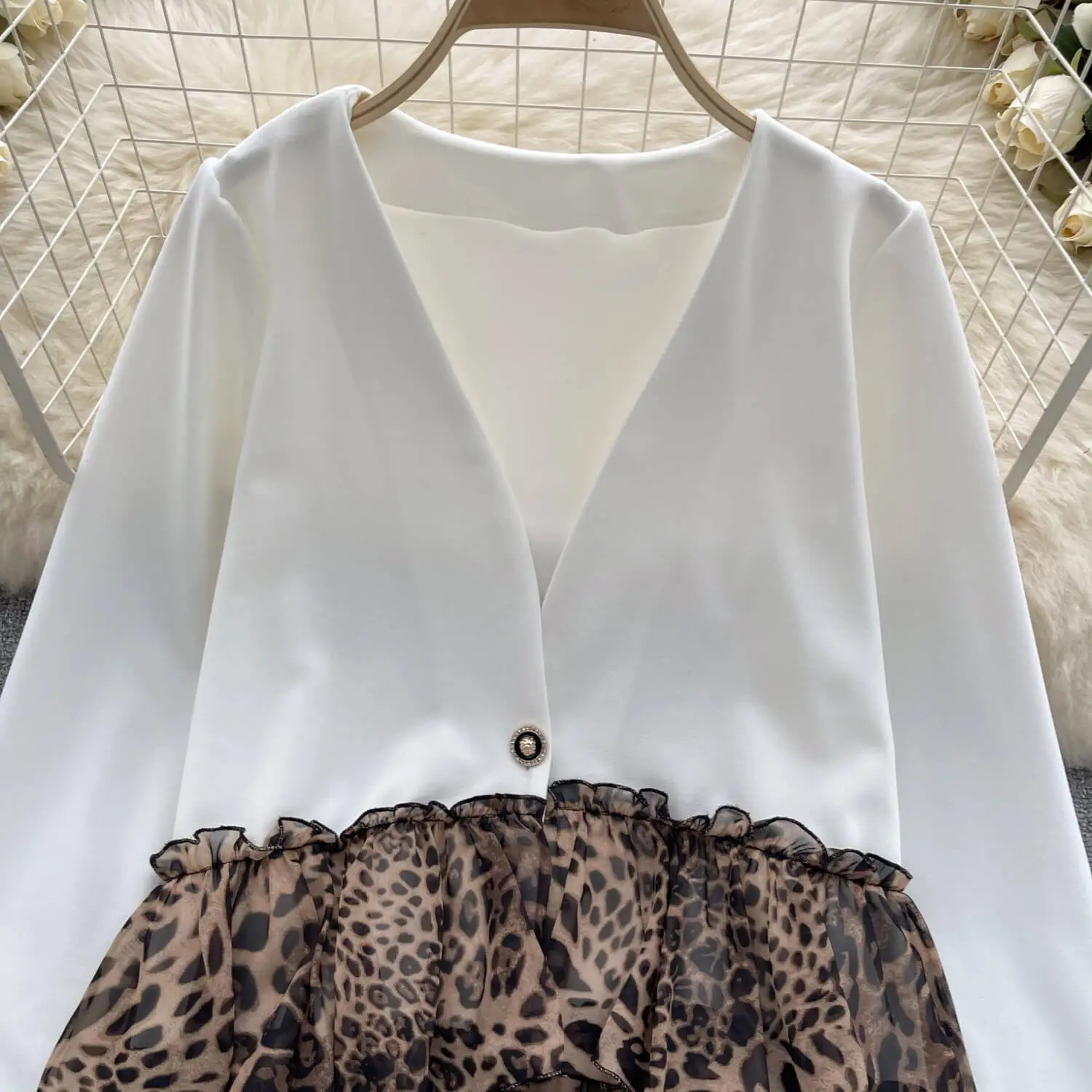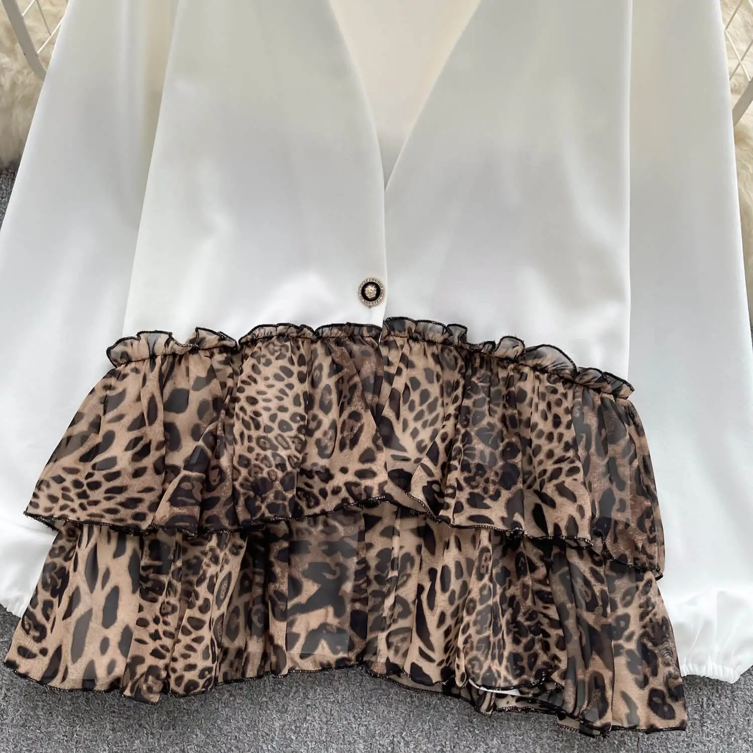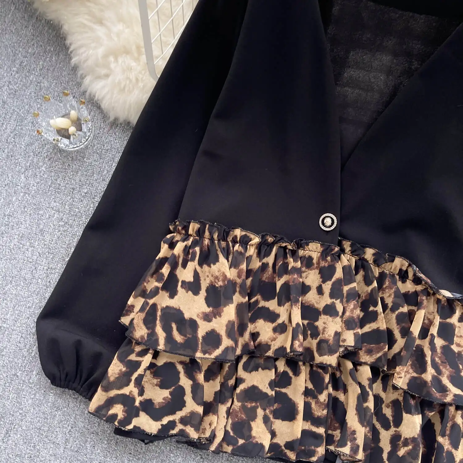 Shirt for Women 2024 New Light Mature Style Loose Deep V-neck Long Sleeve Leopard Pattern Ruffle Edge Panel Top