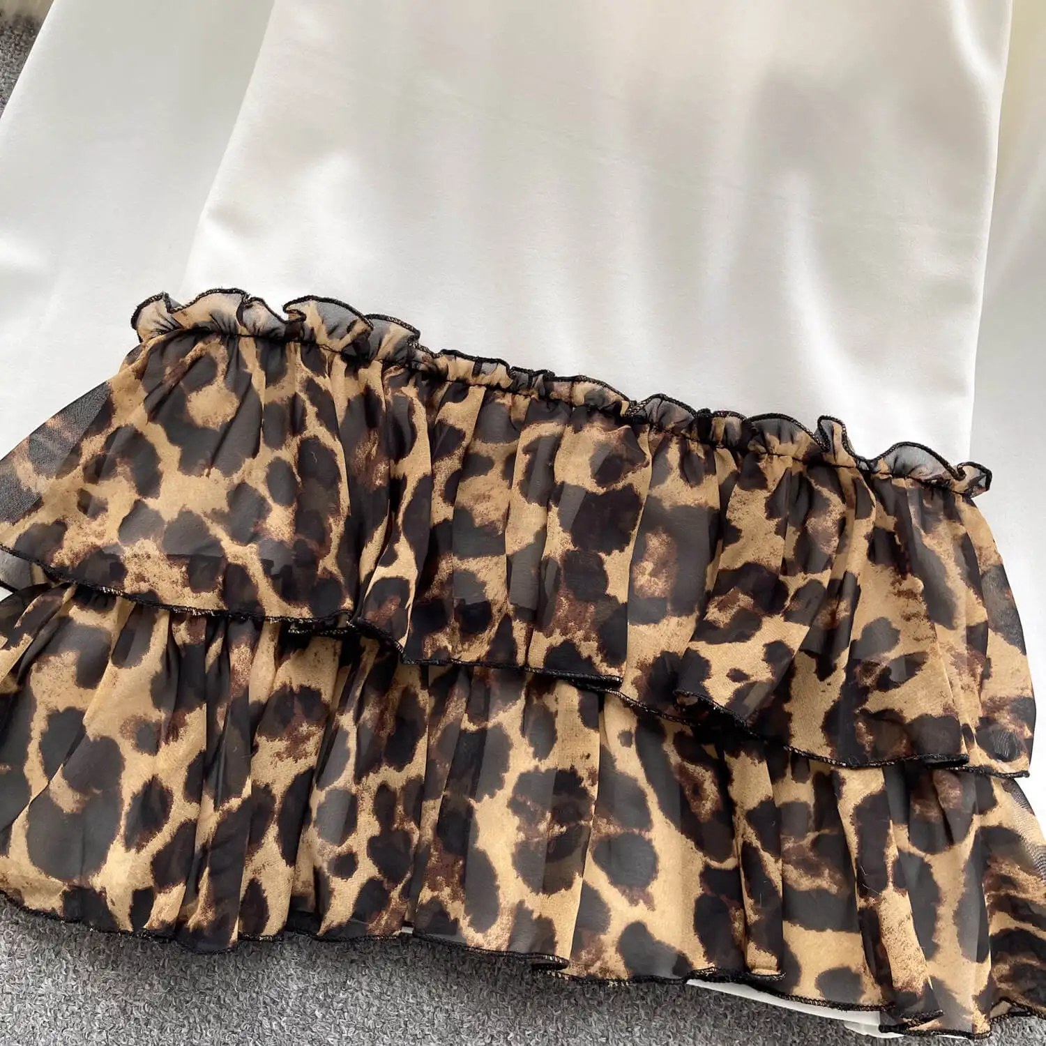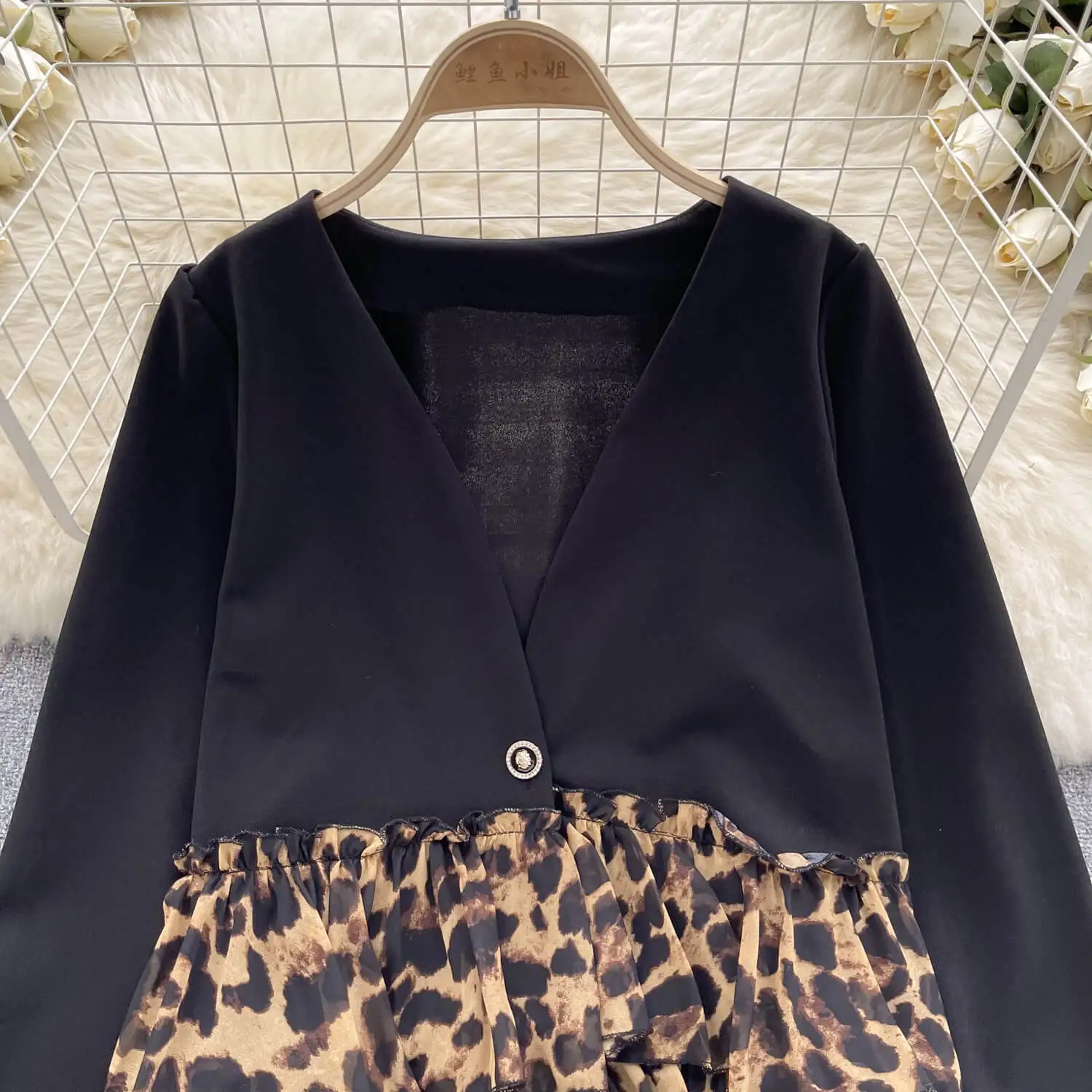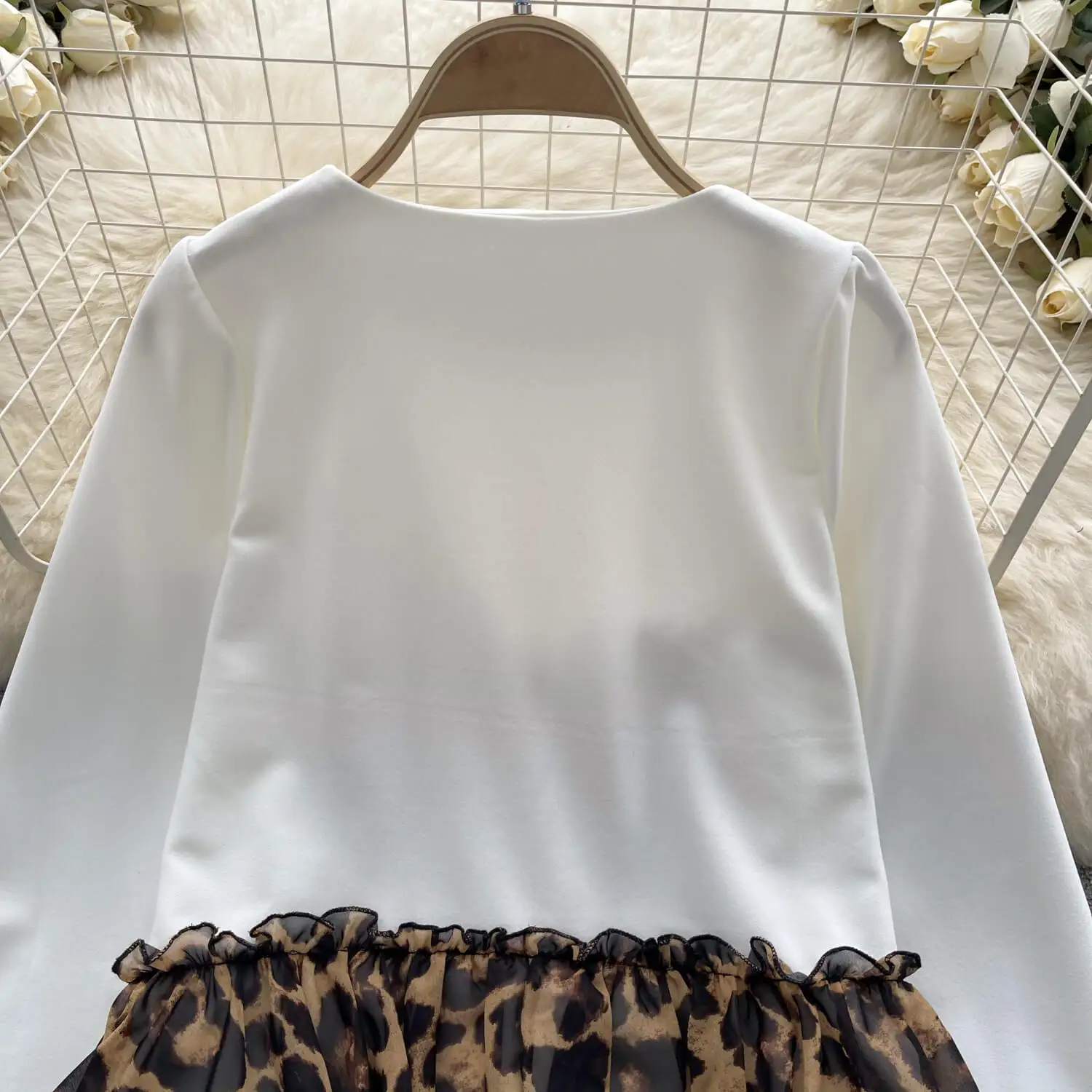 Shirt for Women 2024 New Light Mature Style Loose Deep V-neck Long Sleeve Leopard Pattern Ruffle Edge Panel Top